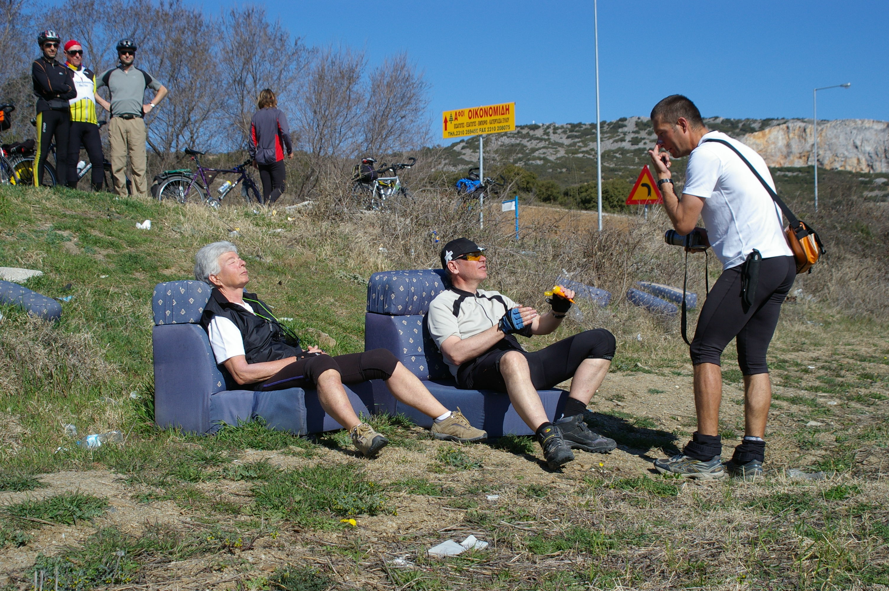 Wir starten entlang des Hafens, grosse Aufregung für Tom, weil er einen Handschuh verloren hat. Nach einer längeren Steigung über einen Berg geht es nach einer flotten Abfahrt nur noch flach bis ans Tagesziel. Bei unserem Picknick treffen wir zwei französchische Radfahrer, die von Venedig bis Peking auf den Spuren Marco Polos fahren. Sie haben je einen Fahrradanhänger und reisen mit allem drum und dran mit dem Fahrrad alleine. Richard meint, die fahren "anständig", nicht so wie wir "Weicheier" mit Begleitfahrzeug. Am Abend nehmen wir eine Abkürzung direkt zum Hotel sehr zum Missfallen von Yorgos, der plante entlang des Strandes zu fahren und den Weg mit geschichtlichen Informationen anzureichern.