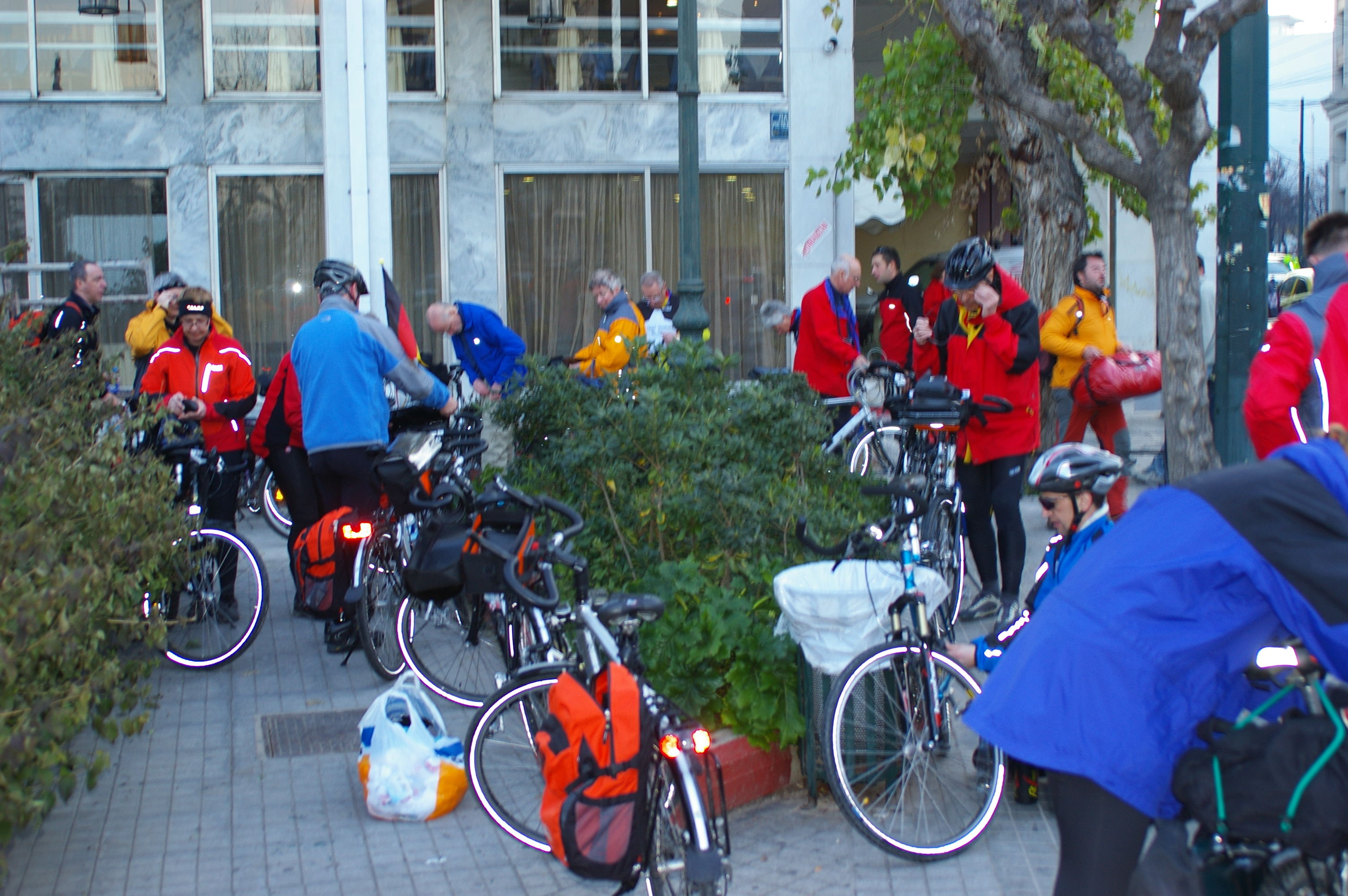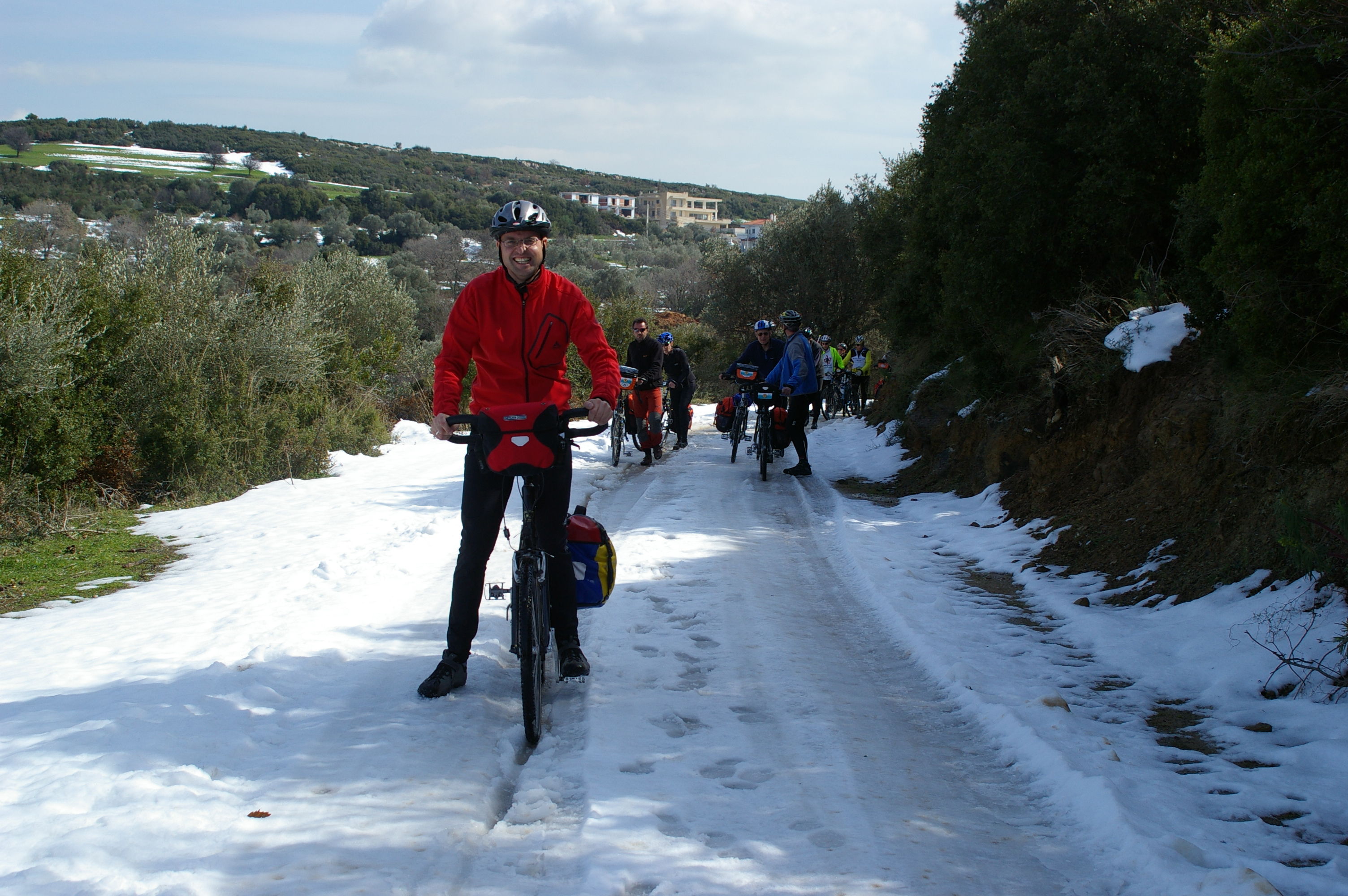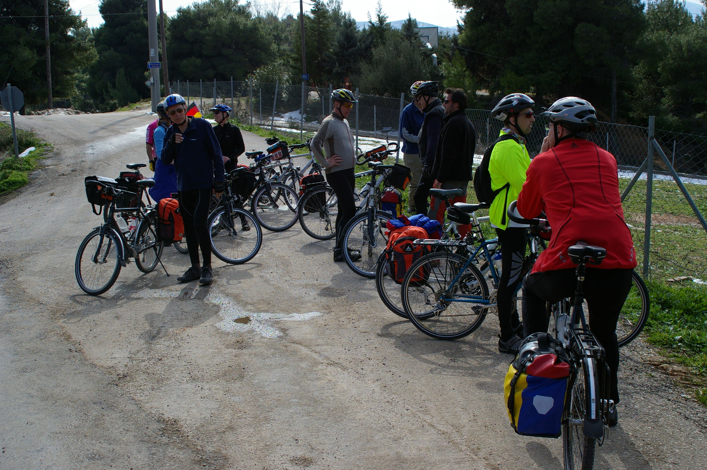 Jetzt gehts wirklich los. Wir fahren im morgentlichen Stau aus Athen in Richtung Marathon, mit dem Fahrrad nicht wirklich weit. Die Polizei fühlt sich verpflichtet uns Begleitschutz zu geben. Unsere Ziel kann über eine Hauptstrasse erreicht werden, oder über die Berge. Wir nehmen die schönere Route über die Berge, diese "Abkürzung" ist landschaftlich sehr schön, aber wegen des Wintereinbruchs des vergangenen Wochenendes ist der Weg nicht gerade fahrradgerecht. Teilweise liegt Schnee, wo kein Schnee liegt ist es richtig schön schlammig. Trotzdem ist die Stimmung gut, wir verlieren für die paar Kilometer aber sehr viel Zeit. Letzlich erreichen wir unsere Hotel in Chalkis erst bei Finsternis um ca 20:30. Gegen Ende dieser Etappe sind alle richtig müde, Tom stellt beim Abendessen fest, dass diese Etappe zu den anstrengenden Etappen der gesamten Tour zu zählen sein wird.