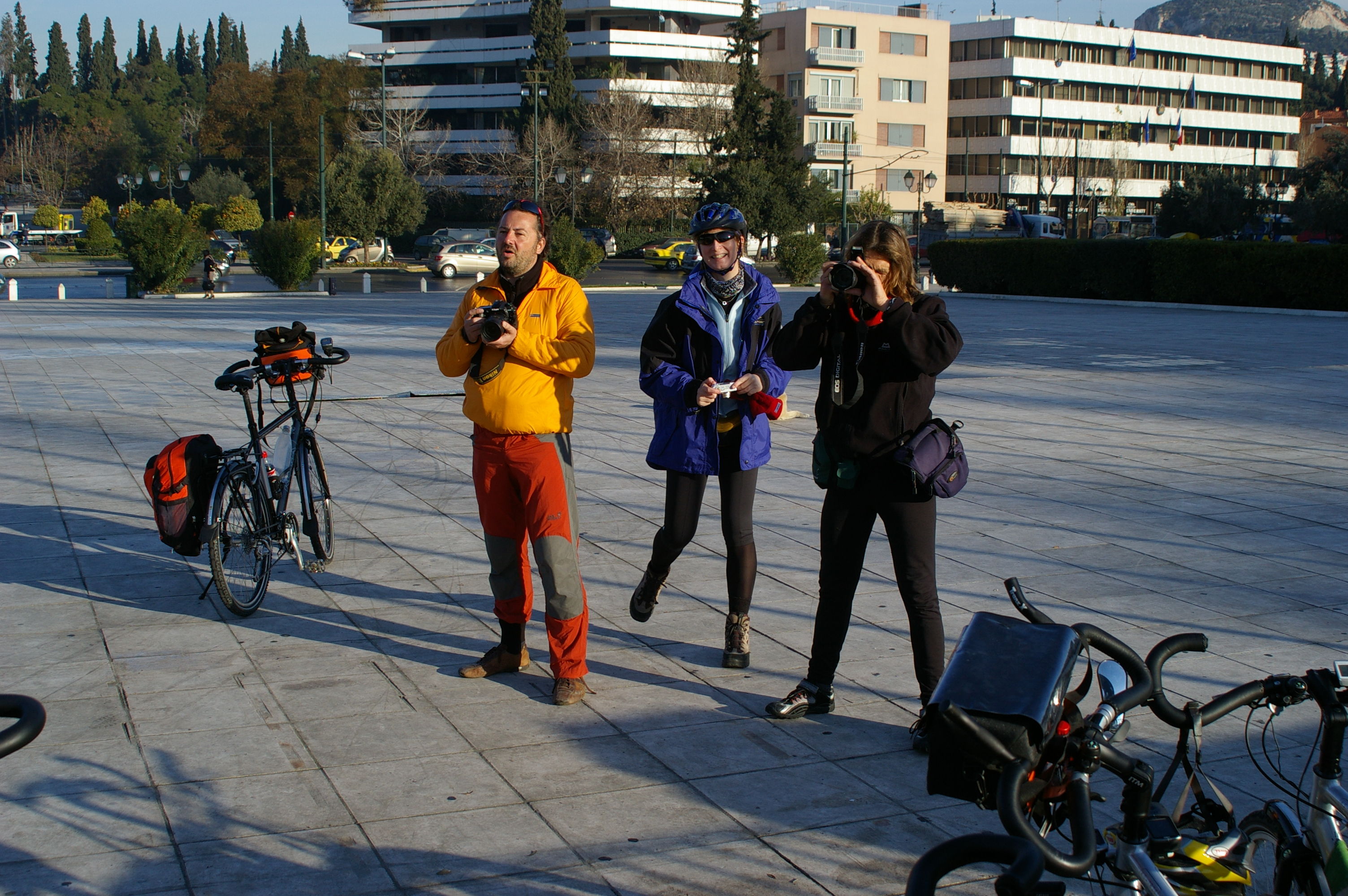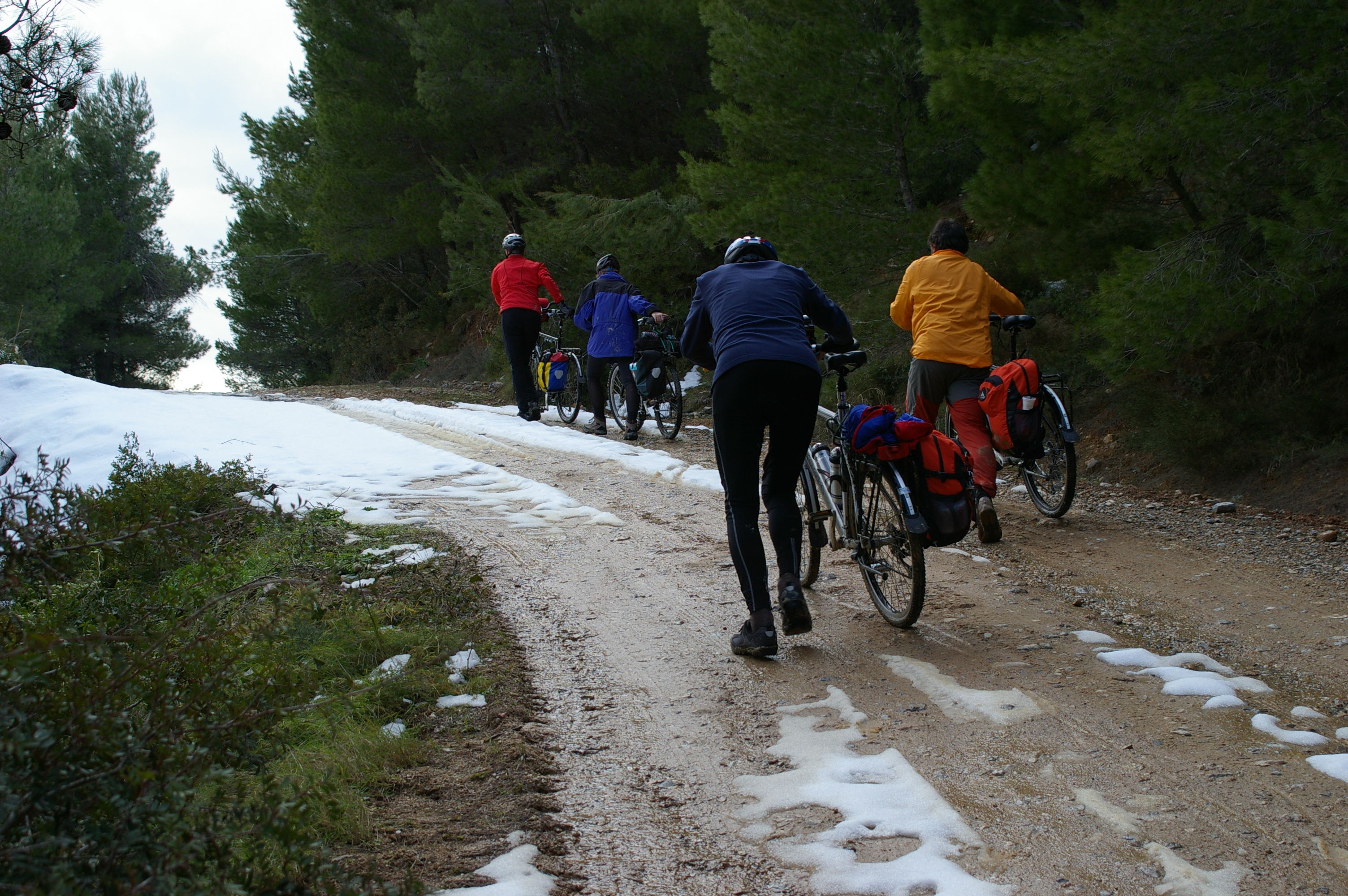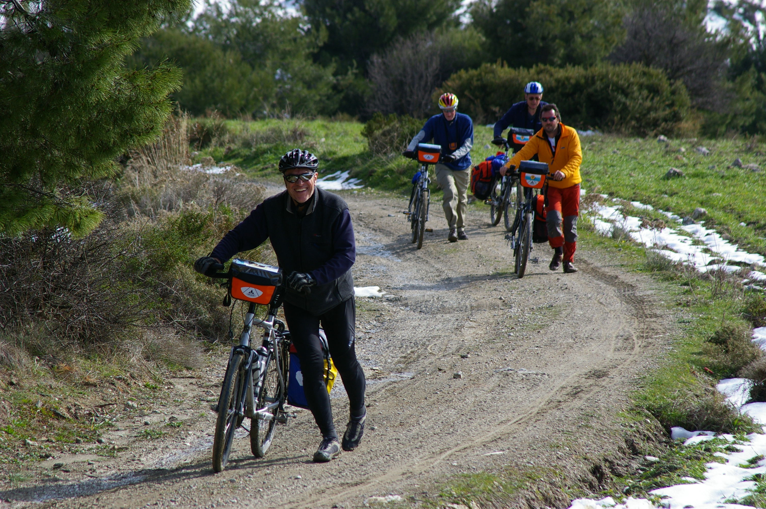 Jetzt gehts wirklich los. Wir fahren im morgentlichen Stau aus Athen in Richtung Marathon, mit dem Fahrrad nicht wirklich weit. Die Polizei fühlt sich verpflichtet uns Begleitschutz zu geben. Unsere Ziel kann über eine Hauptstrasse erreicht werden, oder über die Berge. Wir nehmen die schönere Route über die Berge, diese "Abkürzung" ist landschaftlich sehr schön, aber wegen des Wintereinbruchs des vergangenen Wochenendes ist der Weg nicht gerade fahrradgerecht. Teilweise liegt Schnee, wo kein Schnee liegt ist es richtig schön schlammig. Trotzdem ist die Stimmung gut, wir verlieren für die paar Kilometer aber sehr viel Zeit. Letzlich erreichen wir unsere Hotel in Chalkis erst bei Finsternis um ca 20:30. Gegen Ende dieser Etappe sind alle richtig müde, Tom stellt beim Abendessen fest, dass diese Etappe zu den anstrengenden Etappen der ganzen Tour zu zählen sein wird.