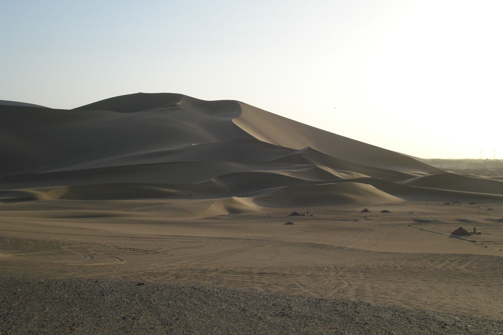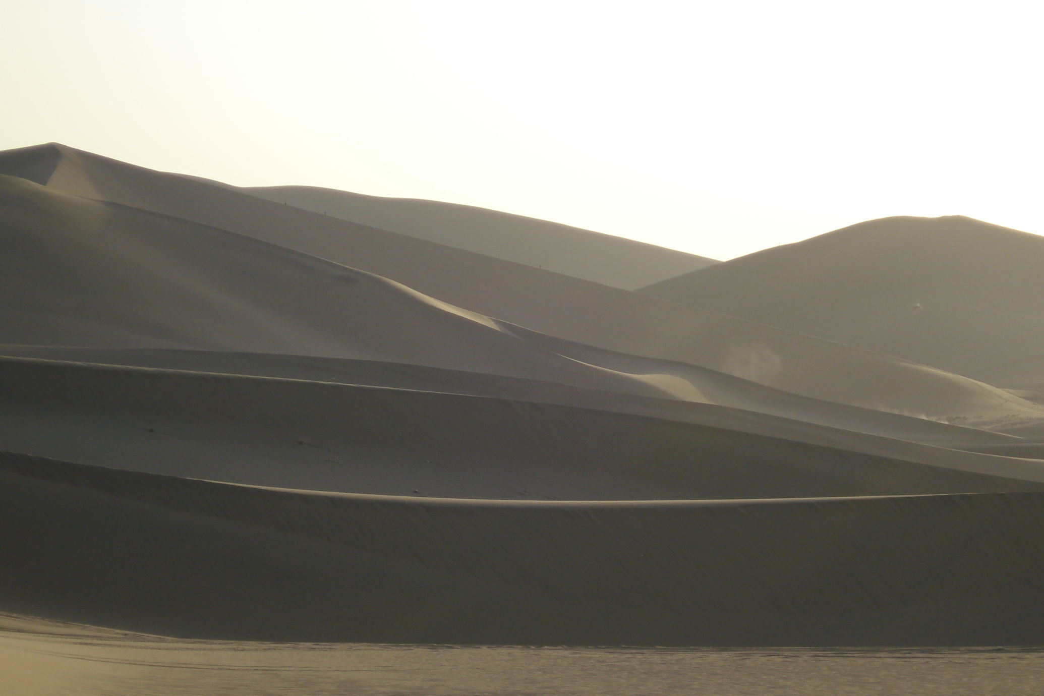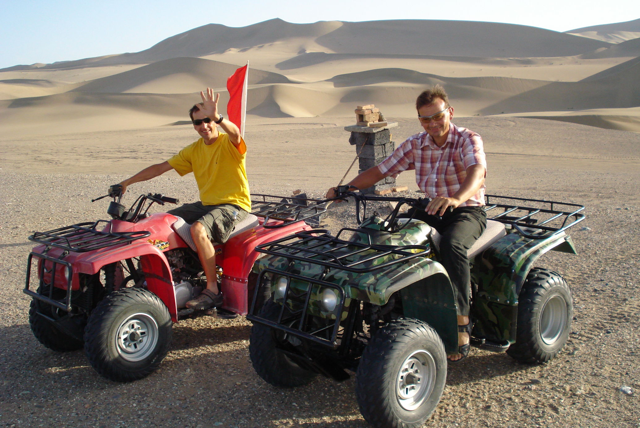 Auch heute fahren wir wieder durch die Wüste. Da gibt es nicht viel zu berichten, außer das es heiß ist und auf die Dauer etwas eintönig. Aber wir steuern auf Dunhuang zu, eine 200 tausend-einwohner Stadt, die auch wegen der großen Sanddünen bekannt ist. Abends fahren wir mit dem Bus zu den Dünen, die eine touristische Attraktion sind. Hier kann man von Kamelreiten bis Fahren mit einem Quad alles mögliche unternehmen. Rene und ich entschieden uns für eine Fahrt mit einem Quad, das hat richtig Spaß gemacht. Endlich einmal nicht treten, um von A nach B zu kommen. (Datum und Uhrzeit der Aufnahmen sind nicht richtig)
