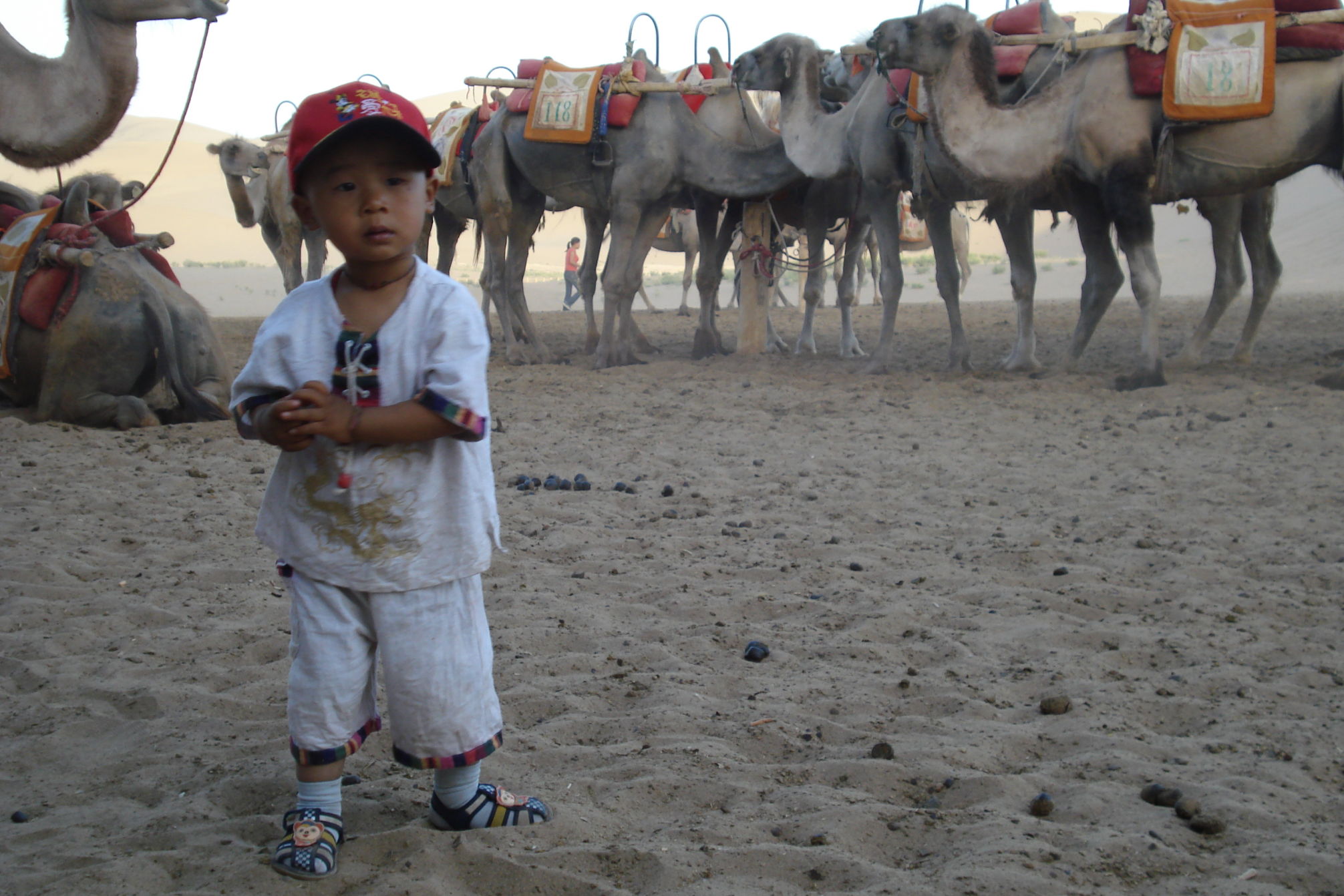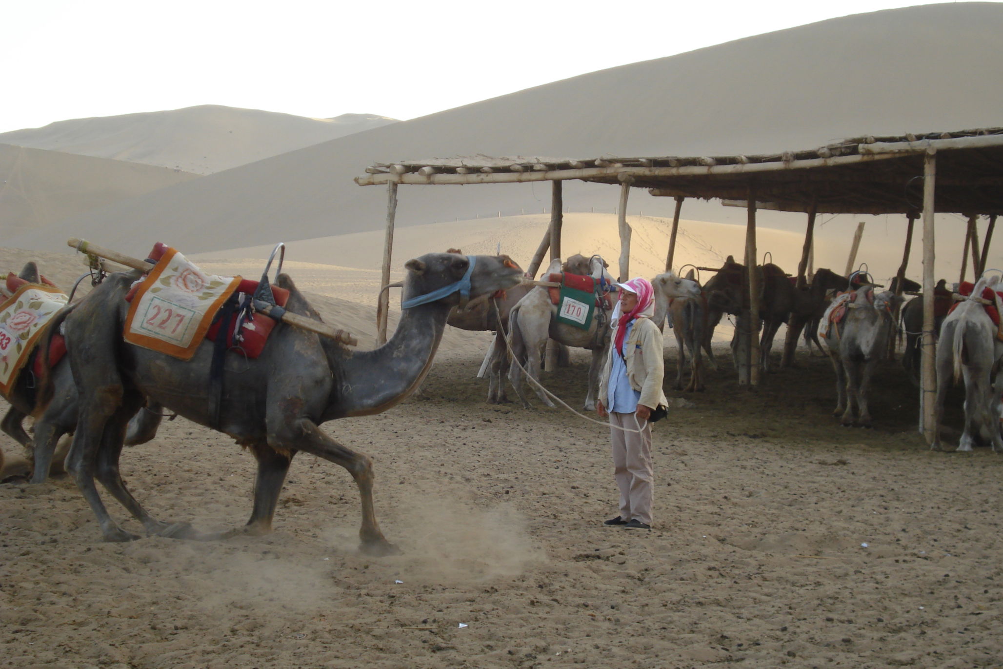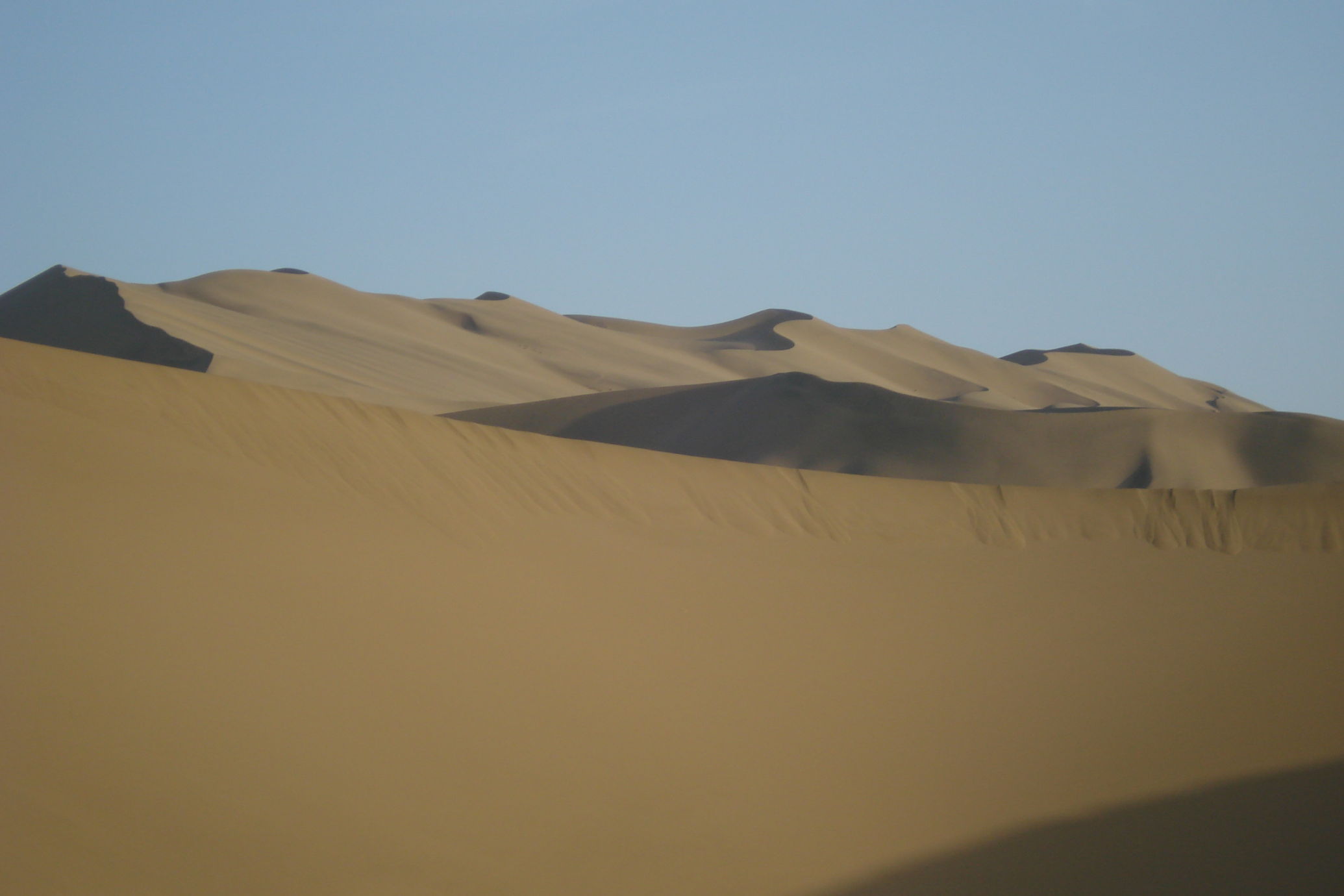 Auch heute fahren wir wieder durch die Wüste. Da gibt es nicht viel zu berichten, außer das es heiß ist und auf die Dauer etwas eintönig. Aber wir steuern auf Dunhuang zu, eine 200 tausend-einwohner Stadt, die auch wegen der großen Sanddünen bekannt ist. Abends fahren wir mit dem Bus zu den Dünen, die eine touristische Attraktion sind. Hier kann man von Kamelreiten bis Fahren mit einem Quad alles mögliche unternehmen. Rene und ich entschieden uns für eine Fahrt mit einem Quad, das hat richtig Spaß gemacht. Endlich einmal nicht treten, um von A nach B zu kommen. (Datum und Uhrzeit der Aufnahmen sind nicht richtig)