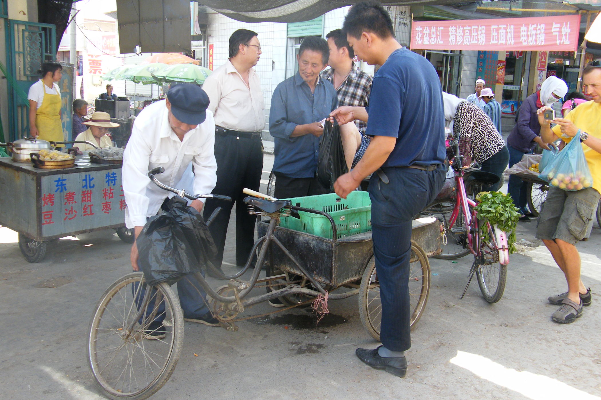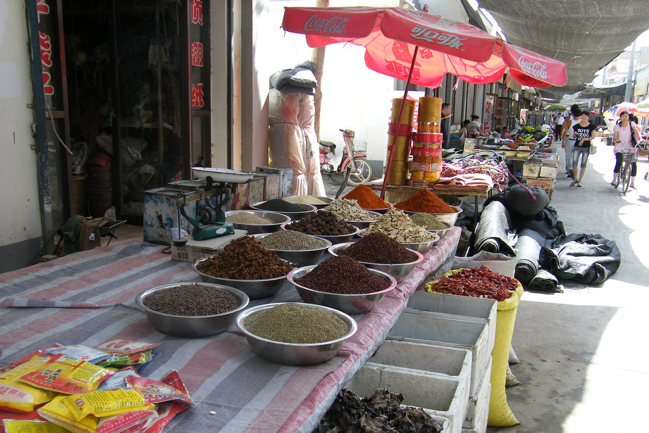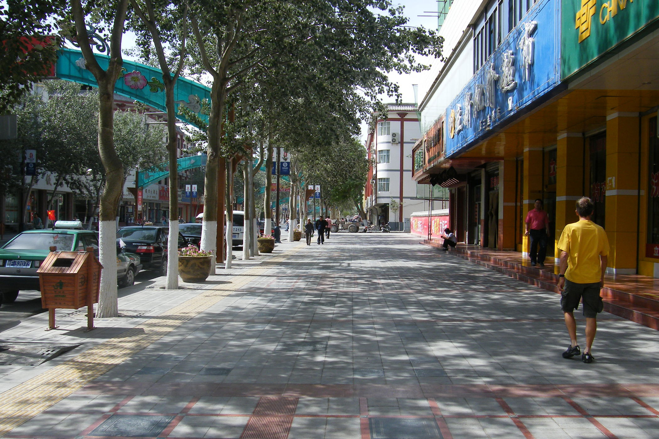 Wie dem aufmerksamen Betrachter meiner Webseite sicher schon aufgefallen ist sind die Fotos in letzter Zeit von schlechter Qualität. Der Grund ist, dass das Objektiv meiner schönen Spiegelreflexkamera den Geist aufgegeben hat. Es hat den systematischen Rütteltest in der Lenkertasche offensichtlich nicht überlebt, zu Beginn der Zerstörung waren die Bilder unscharf und am Ende haben lose Teile im Objektiv das Fotografieren unmöglich gemacht. Am heutigen Ruhetag hab ich mir eine neue Kompaktkamera gekauft und hoffe das ich nun bis zum Ende der Reise ordentliche Bilder machen kann. Die technische Qualität der Bilder ist zwar nicht ganz so gut wie die der Pentax-SLR, aber was soll's. Nach dem Kauf gab ein Bummel durch die Stadt Dunhuang Gelegenheit ein paar Fotos zu machen.