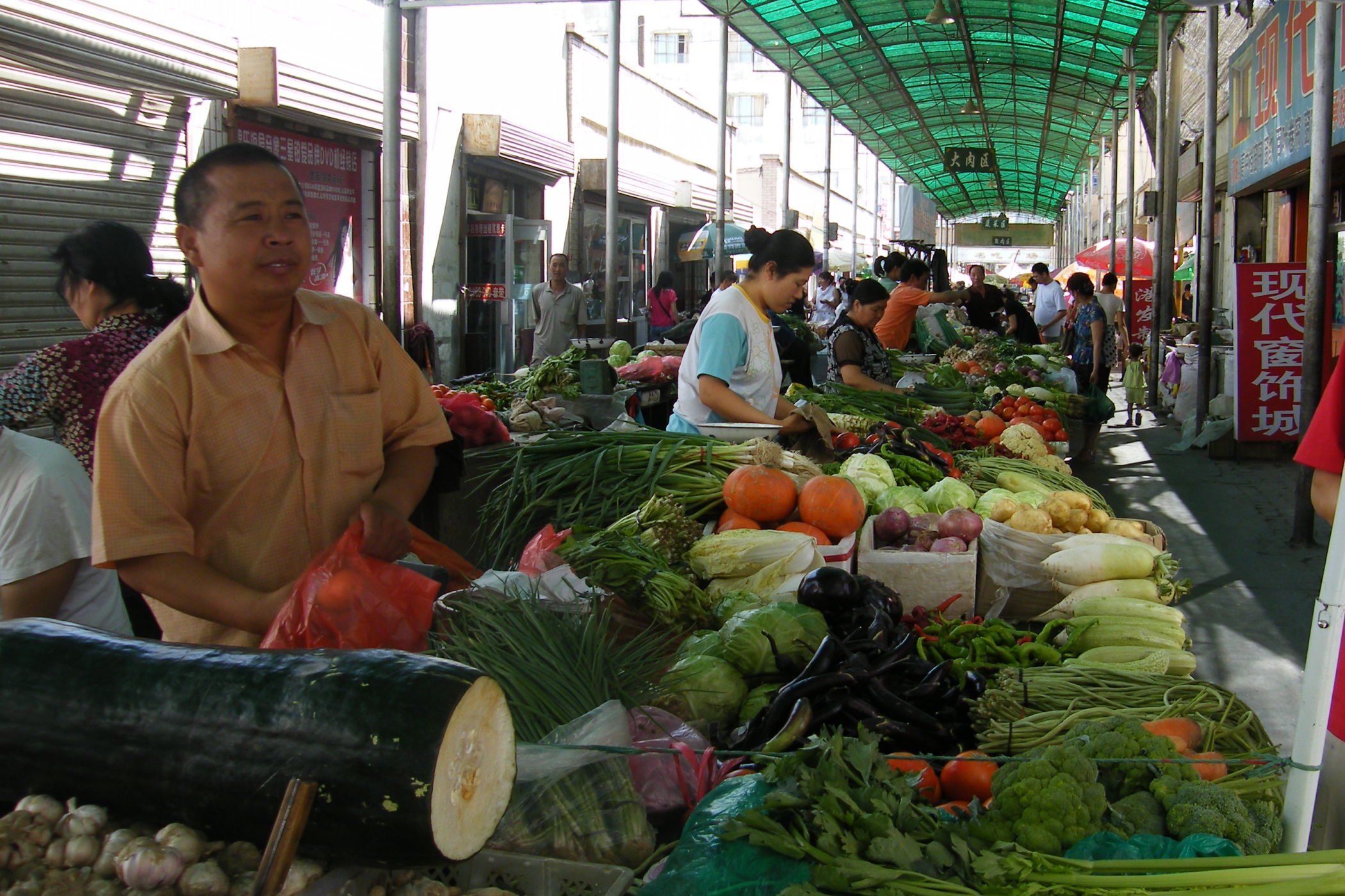Wie dem aufmerksamen Betrachter meiner Webseite sicher schon aufgefallen ist sind die Fotos in letzter Zeit von schlechter Qualität. Der Grund ist, daß das Objektiv meiner schönen Spiegelreflexkamera den Geist aufgegeben hat. Es hat den systematischen Rütteltest in der Lenkertasche offensichtlich nicht überlebt, zu Beginn der Zerstörung waren die Bilder unscharf und am Ende haben lose Teile im Objetiv das Fotografieren unmöglich gemacht. Am heutigen Ruhetag hab ich mir eine neue Kompaktkamera gekauft und hoffe das ich nun bis zum Ende der Reise ordentliche Bilder machen kann. Die technische Qualität der Bilder ist zwar nicht ganz so gut wie die der Pentax-SLR, aber was solls. Nach dem Kauf gab ein Bummel durch die Stadt Dunhuang Gelegenheit ein paar Fotos zu machen.