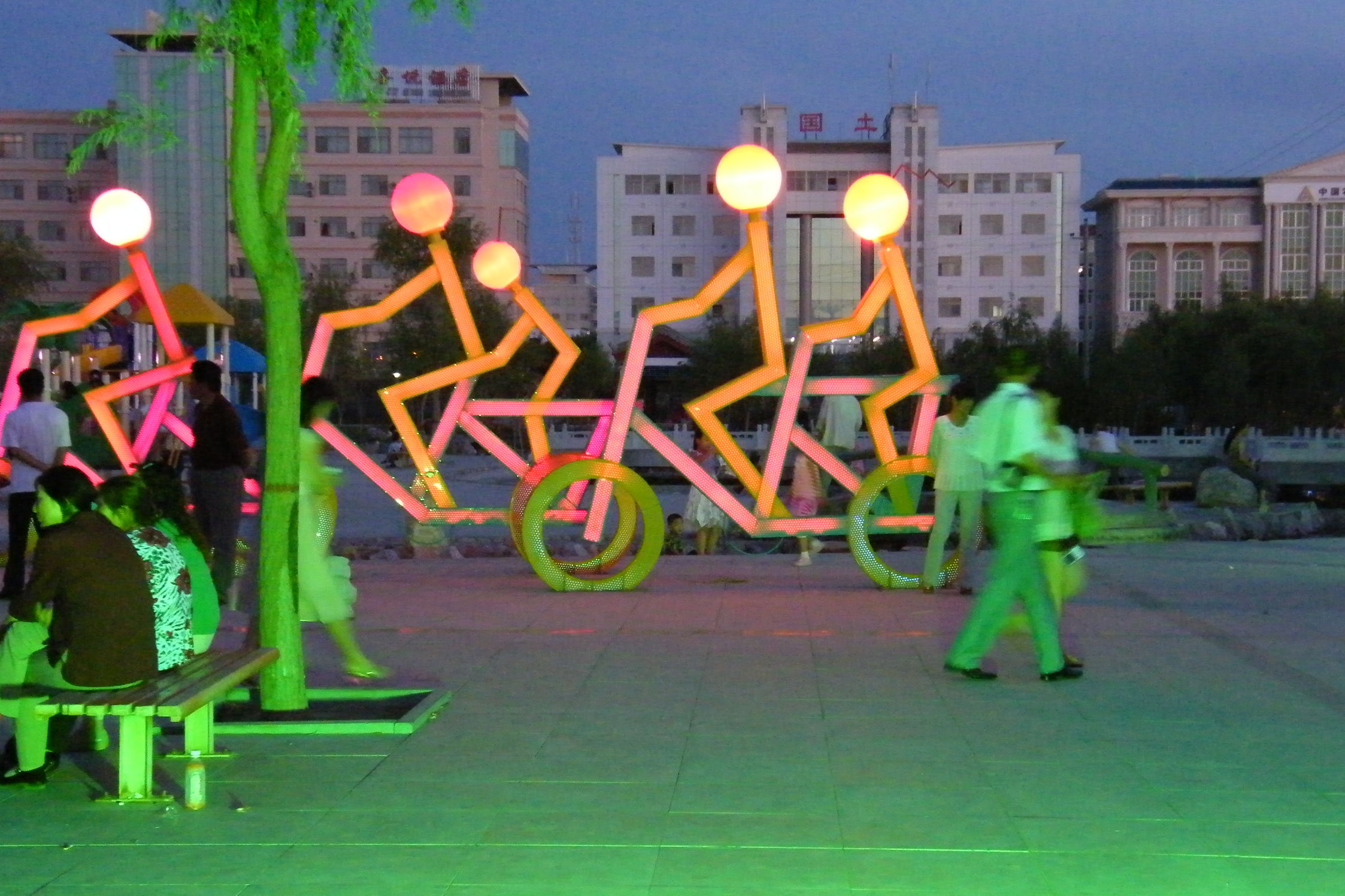 Ein weiterer Tag durch die Wüste, da gibt es von der Strecke nicht viel zu berichten. Abends essen wir im Hotel. Bei einem kleinen Spaziergang, um zu sehen ob es in der Stadt etwas zu sehen gibt, komme ich bei einem Platz vorbei, auf dem getanzt wird. Es spielt Musik aus einem Platzlautsprecher minderer Qualität, was am die Chinesen nicht daran hindert eifrig zu tanzen. Es war für mich sehr beeindruckend, das ganz normale Menschen sich am Abend auf einem Platz treffen, einfach um gemeinsam zu tanzen.
