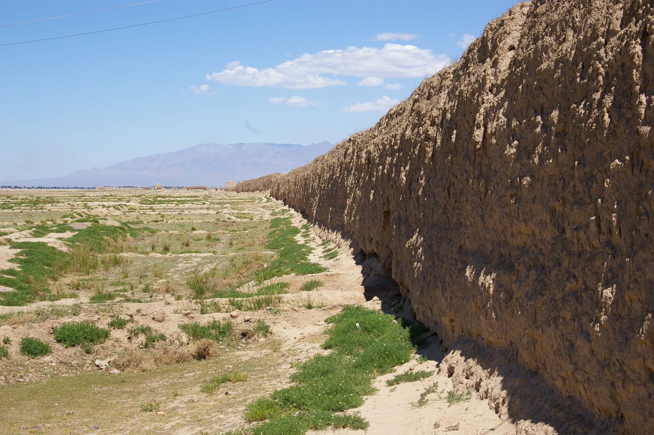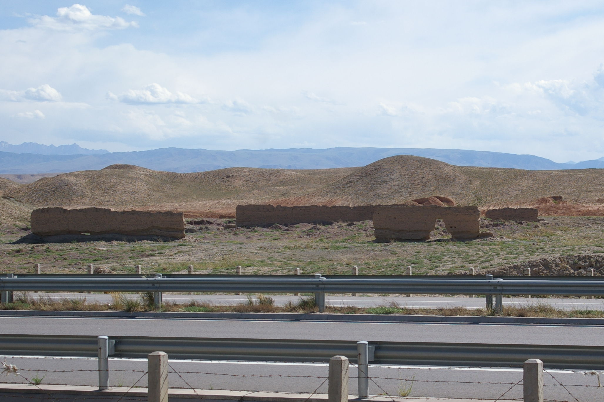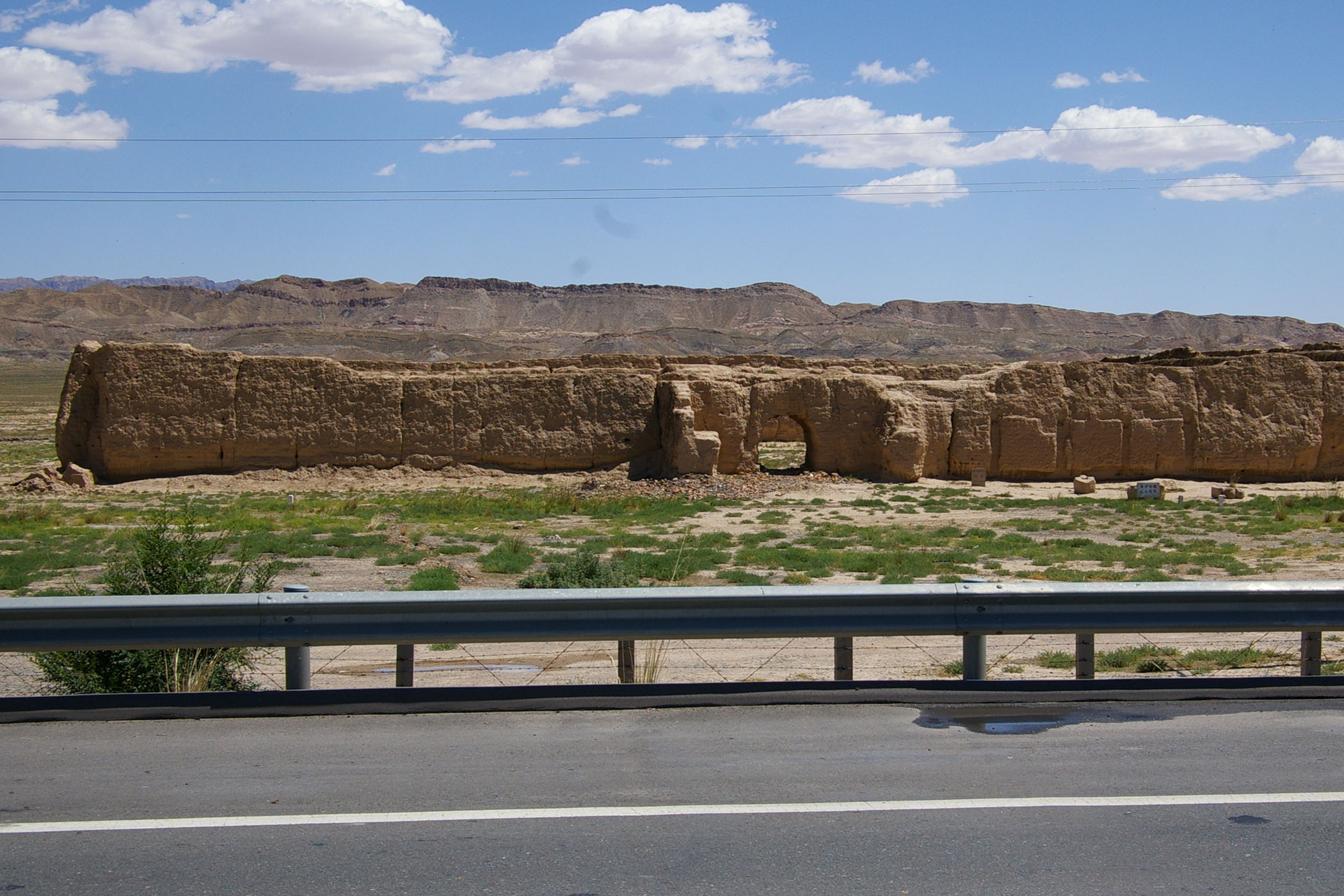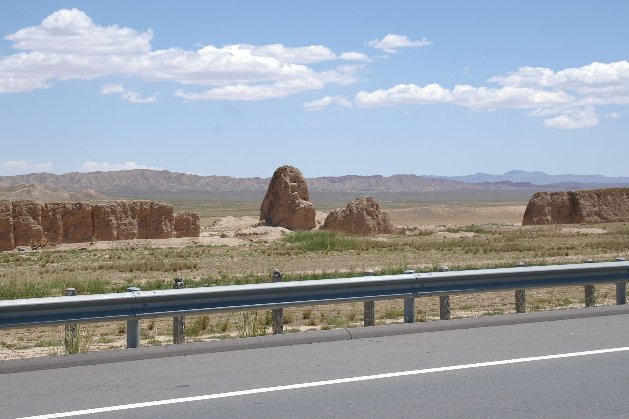 Die heutige Etappe führt uns über weite Strecken entlang der chinesischen Mauer. Genau genommen sind es nur die Überreste der Mauer, angesichts des Mythos um dieses Bauwerk ist das trotzdem recht beeindruckend. Die in regelmäßigen Abständen errichtetet Wachtürme sind teilweise noch ganz gut erhalten. Diese hatten aus militärischer Sicht größere Bedeutung als die Mauer selbst, denn es stellt eine Präsenz von ausreichender Stärke sicher und sie dienten auch der Informationsübertragung von Turm zu Turm. Die Fahrt selbst führt durch wüstenhaftes Gebiet, landschaftlich sehr schön und praktisch unbewohnt.