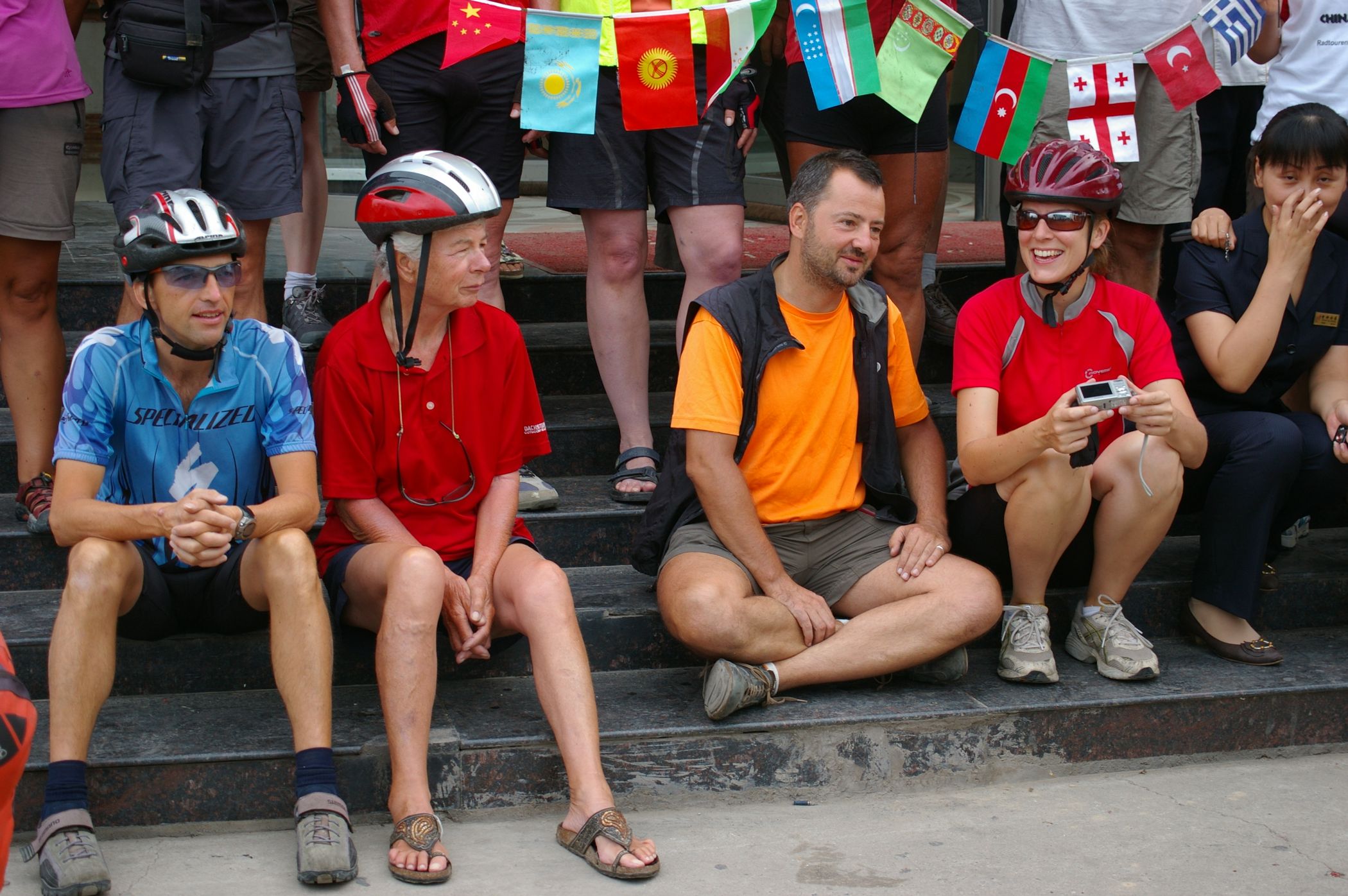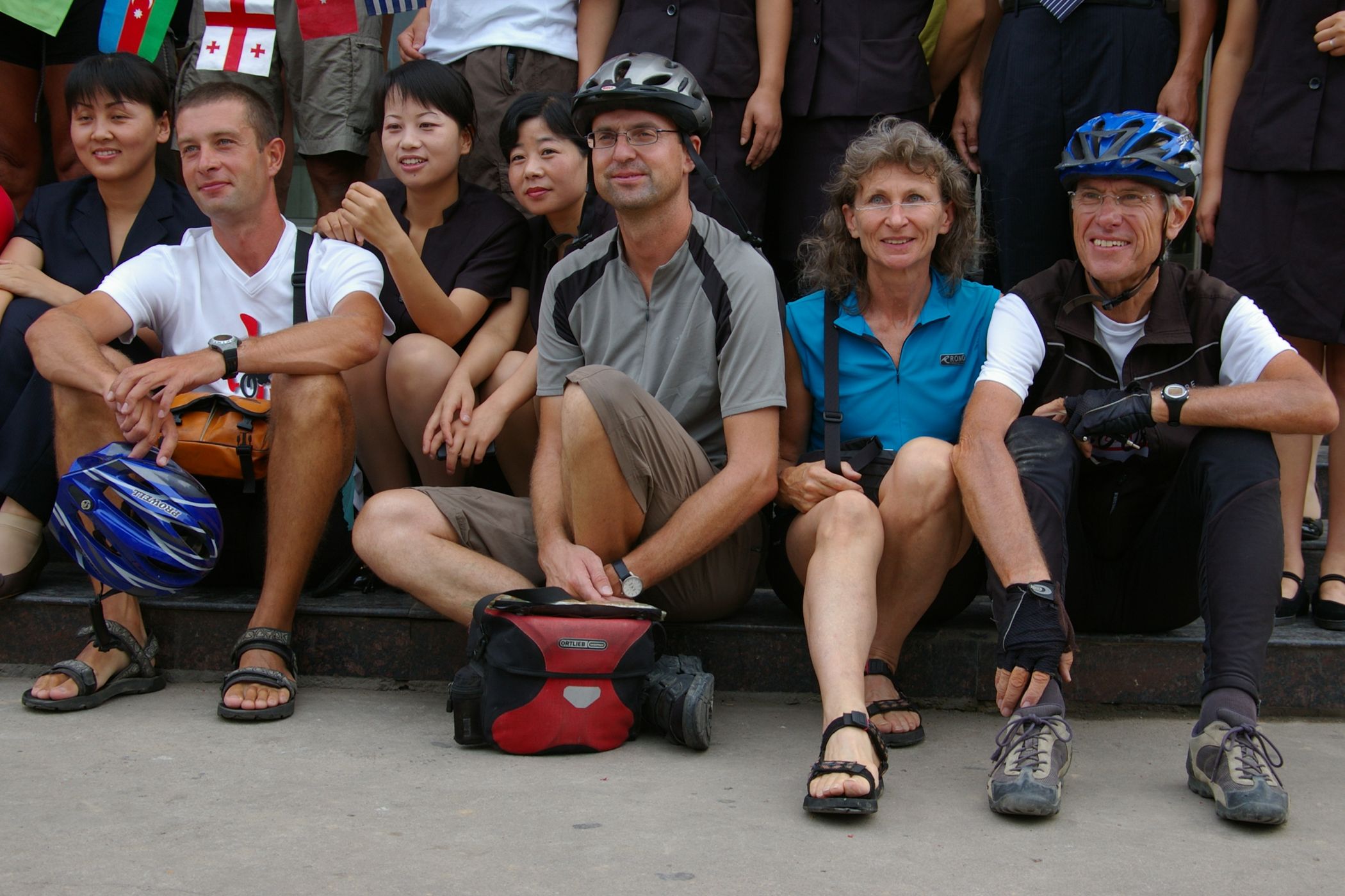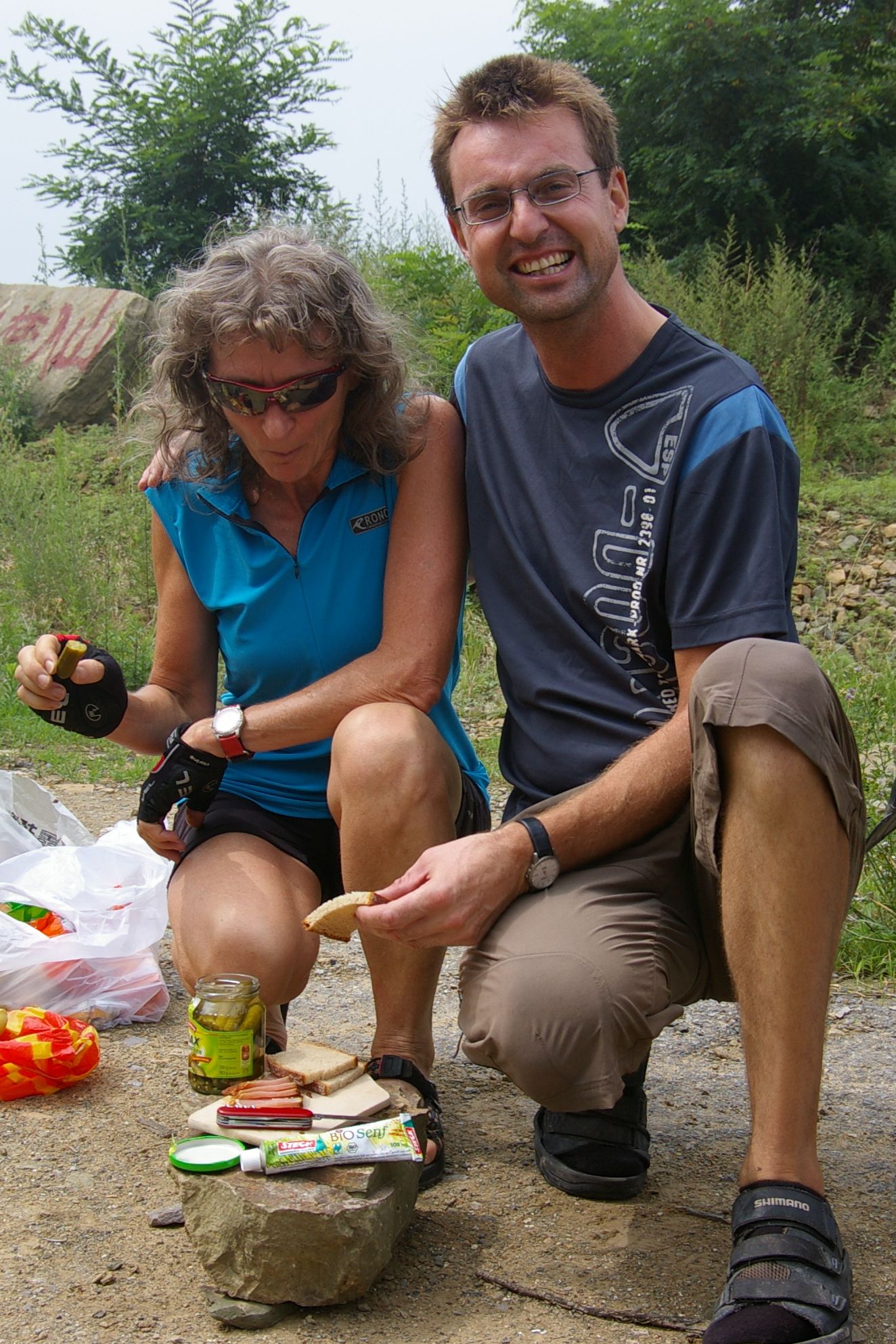 Das Höhenprofile dieses Tages hat von mir den Namen "Vier Berge Lauf" bekommen. Denn es ging auf vier Bergspitzen hoch, alle nicht sehr hoch aber wegen der drückende Hitze mit hoher Luftfeuchtigkeit richt mühsam zu fahren. Heute fuhren wir gemeinsam mit der Teilgruppe, die zum Teil neu gemsicht wurde, weil einige Teilnehmer neu hinzugekommen waren. Das war sehr nett, auch einmal mit neuen Leuten zu Plaudern. Zu Mittag hatten wir in einem kleinem Dorf nur eine Gasthaus zur Auswahl, das war dafür sehr gut und zum Glück auch gross genug für uns alle. Wenn wir als Gruppe zu ca. Leuten aufkreuzen ist das für die lokale Bevölkerung immer ein zimliches Ereigniss. Da sind wir nicht nur die Fotographierenden, sondern oft auch die Fotographierten.