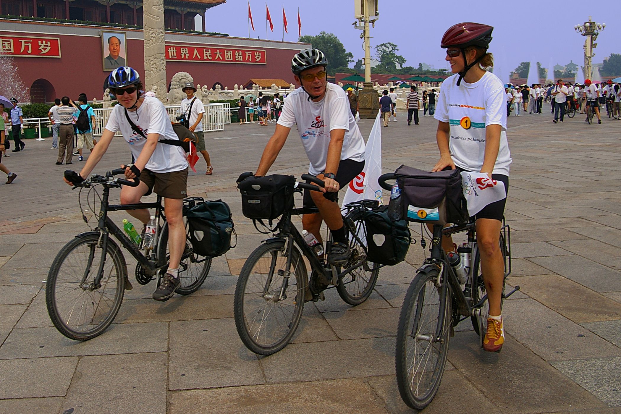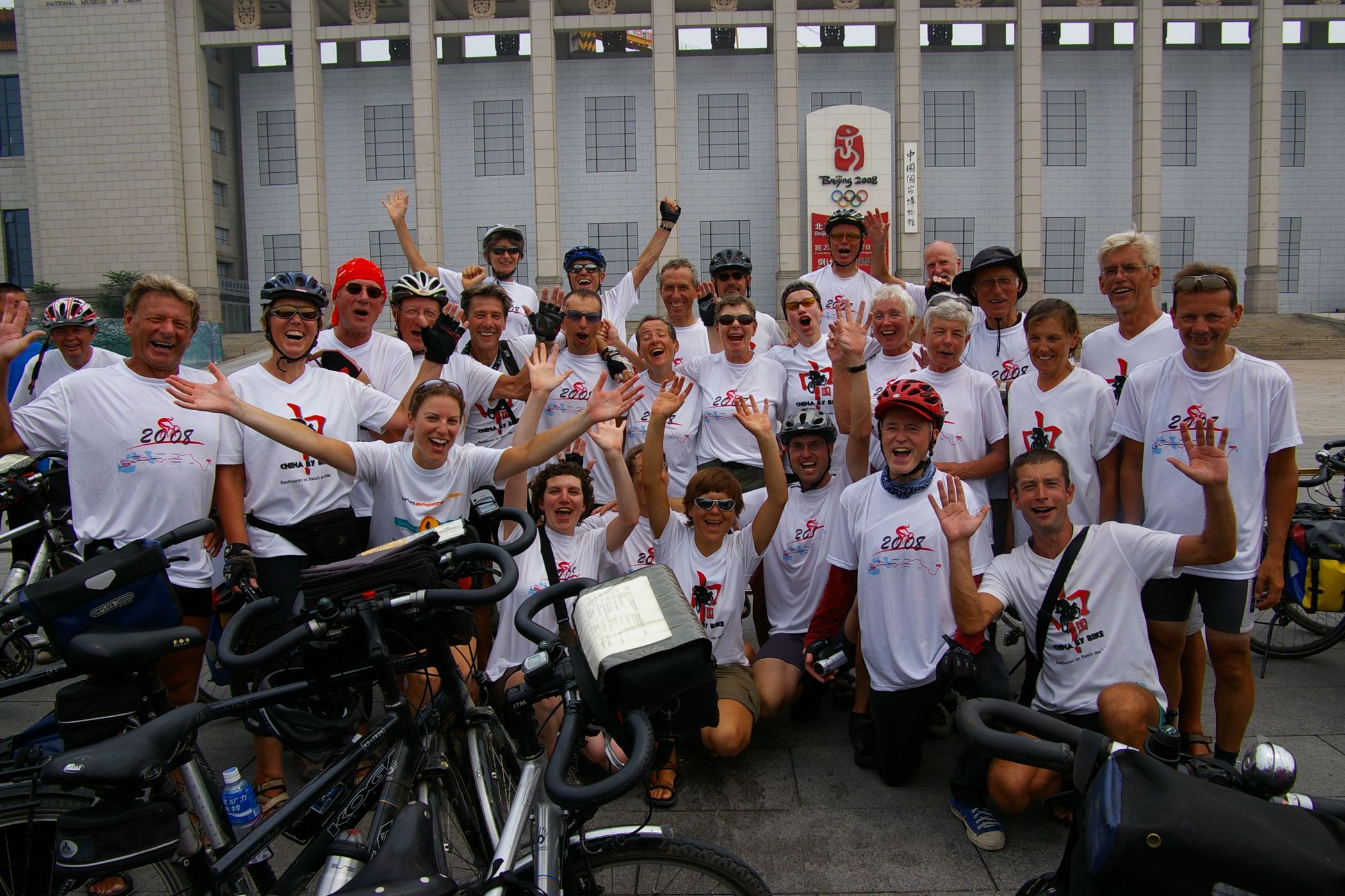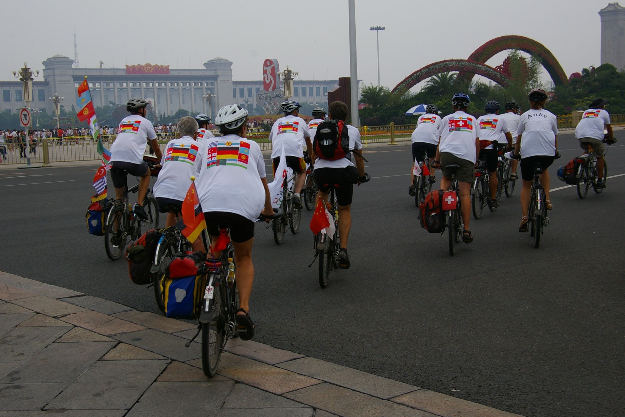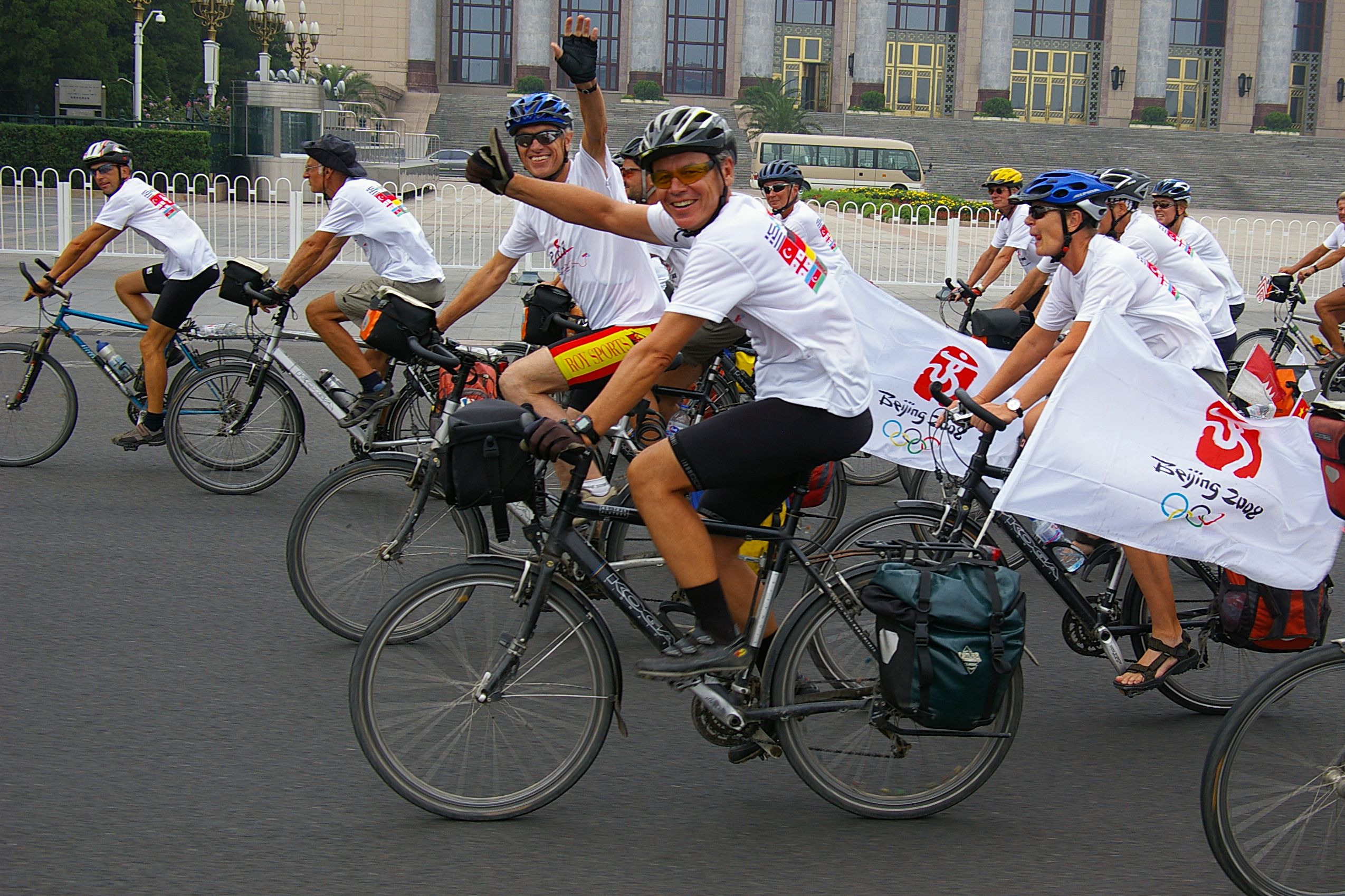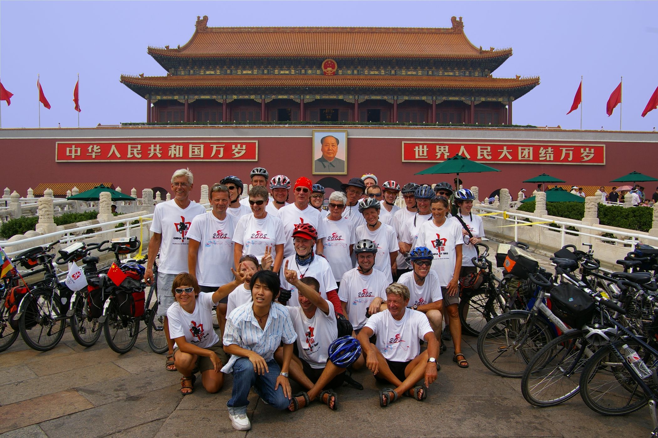 Tag der Ankunft in Peking. Nur ein kurzes Stück verbleibt noch bis zum Ziel. In unseren T-Shirts oder in einem weissen China-by-Bike machen wir als Radgruppe richtig was her. Wenig Verkehr, breite Straßen und das Gefühl es geschafft zu haben lassen uns die letzten Kilometern richtig genussvoll radeln. Wir fahren in unseren schönen T-Shirts durch die Straßen Pekings und erreichen als erstes am "Platz-des-himmlischen-Friedens" den Olympia-Count-Down. Dort stoßen wir neben dem ARD und NDR Team vor allem auf eine begeisterte und interessierte Menge. Zahlreiche Fotos werden geschossen, aber nicht nur von unseren Kameras: sehr viele Chinesen ziehen Ihre Handy-Kamera und lassen sich mit uns mit viel Spaß fotografieren. Der mitgebrachte Sekt wird aufgeschossen und wie bei einem Formel 1 Rennen in die Menge geschäumt. Jetzt haben wir unsere Ziel nun endgültig erreicht, die Freude ist groß. Aber die Begeisterung der Bevölkerung ist großartig und die Stimmung ist wirklich toll. Unsere nächster Punkt ist der Platz vor dem berühmten Mao Bild. Auch hier werden Fotos mit der begeisterten Menge geschossen. Wieder erwarten haben wir, trotz höchster Sicherheitsvorkehrungen seitens der Behörden, keinerlei Probleme dadurch, das wir hier einen gewaltigen Auflauf provozieren. Danach geht es zur deutschen Botschaft, wo auch die Leute der Busreise von Athen nach Peking eintreffen. Der Botschafter empfängt uns mit einer kurzen Rede und danach geht es in den Gastgarten mit Keksen und Getränken. Danach wollen wir nur noch ins Hotel, der Tag war anstrengend, weil es war nicht nur ein ereignisreicher sondern auch ein besonders heißer Tag.