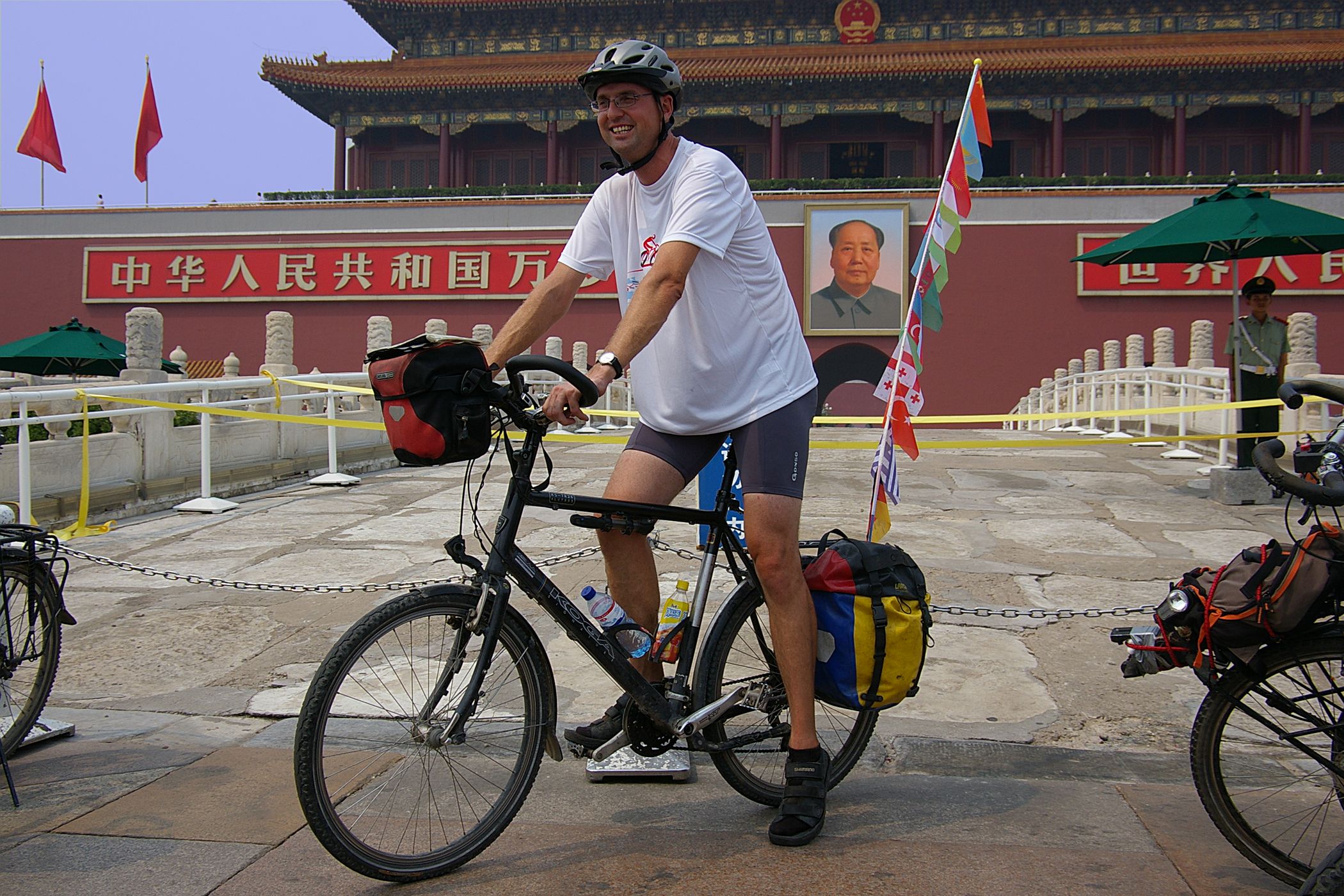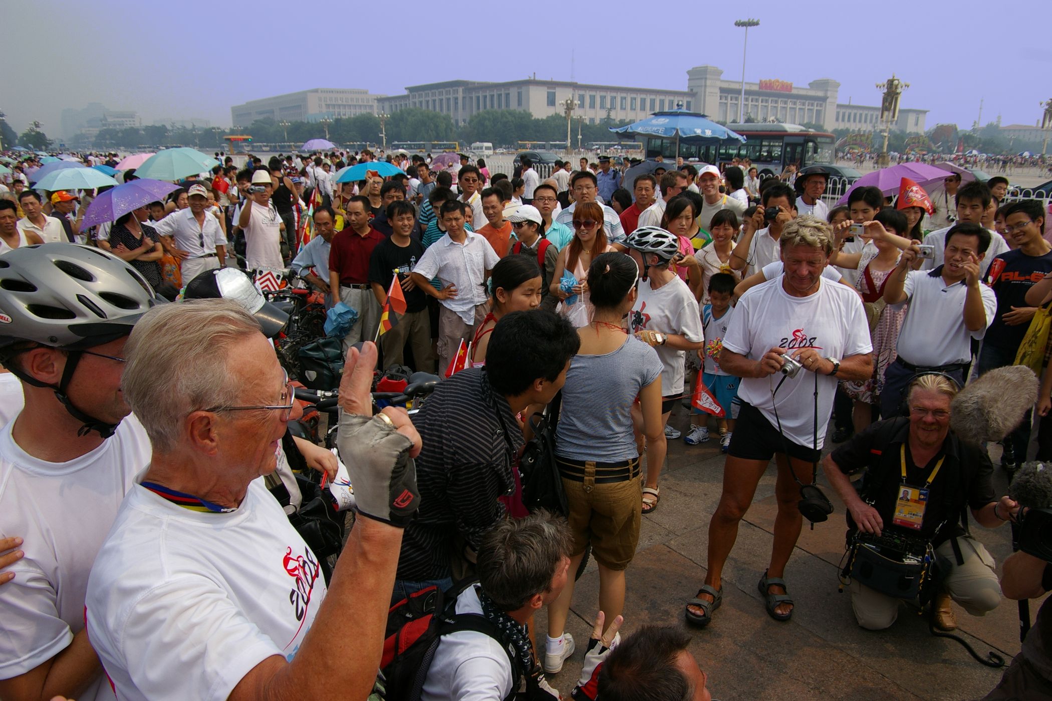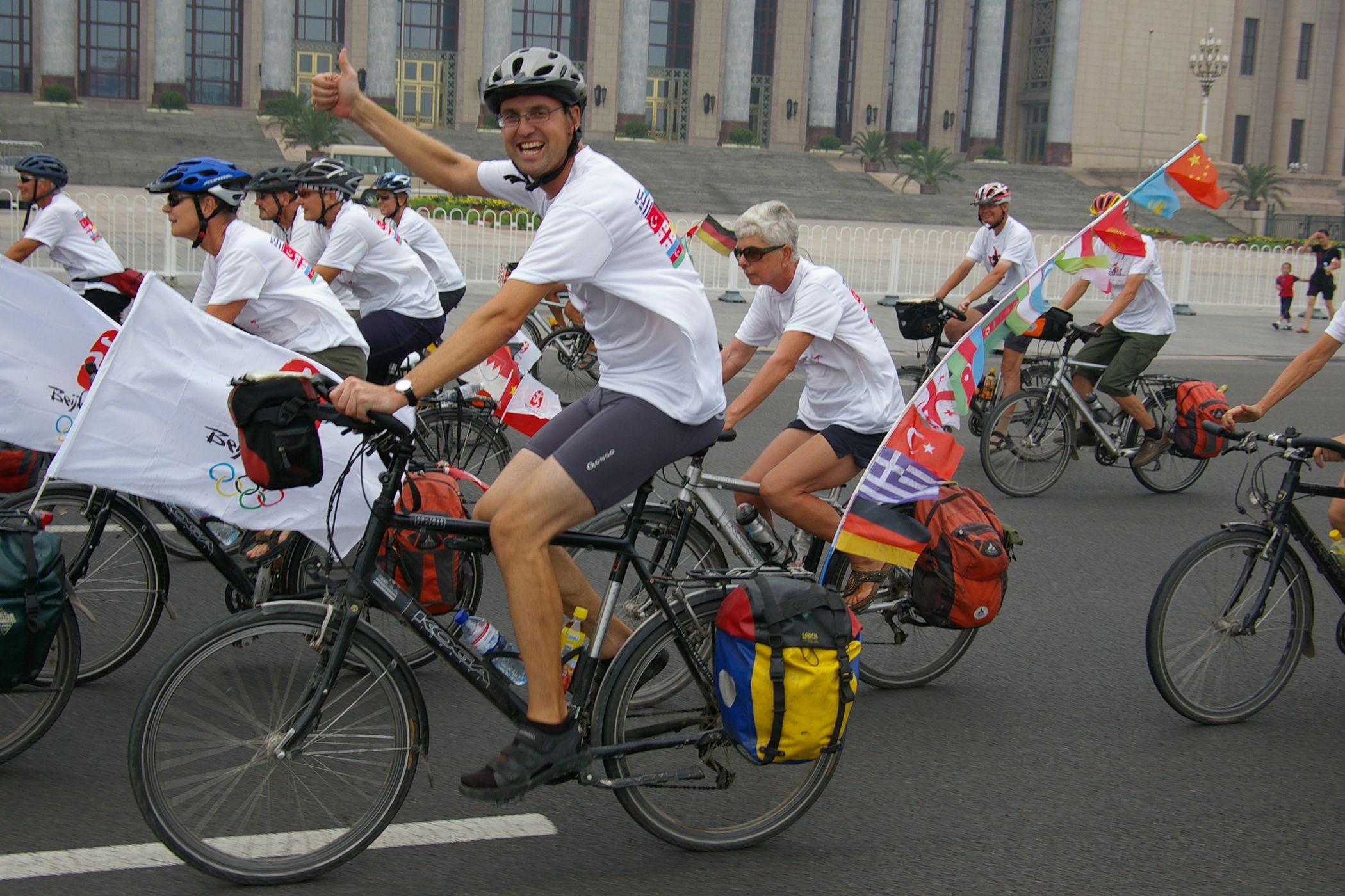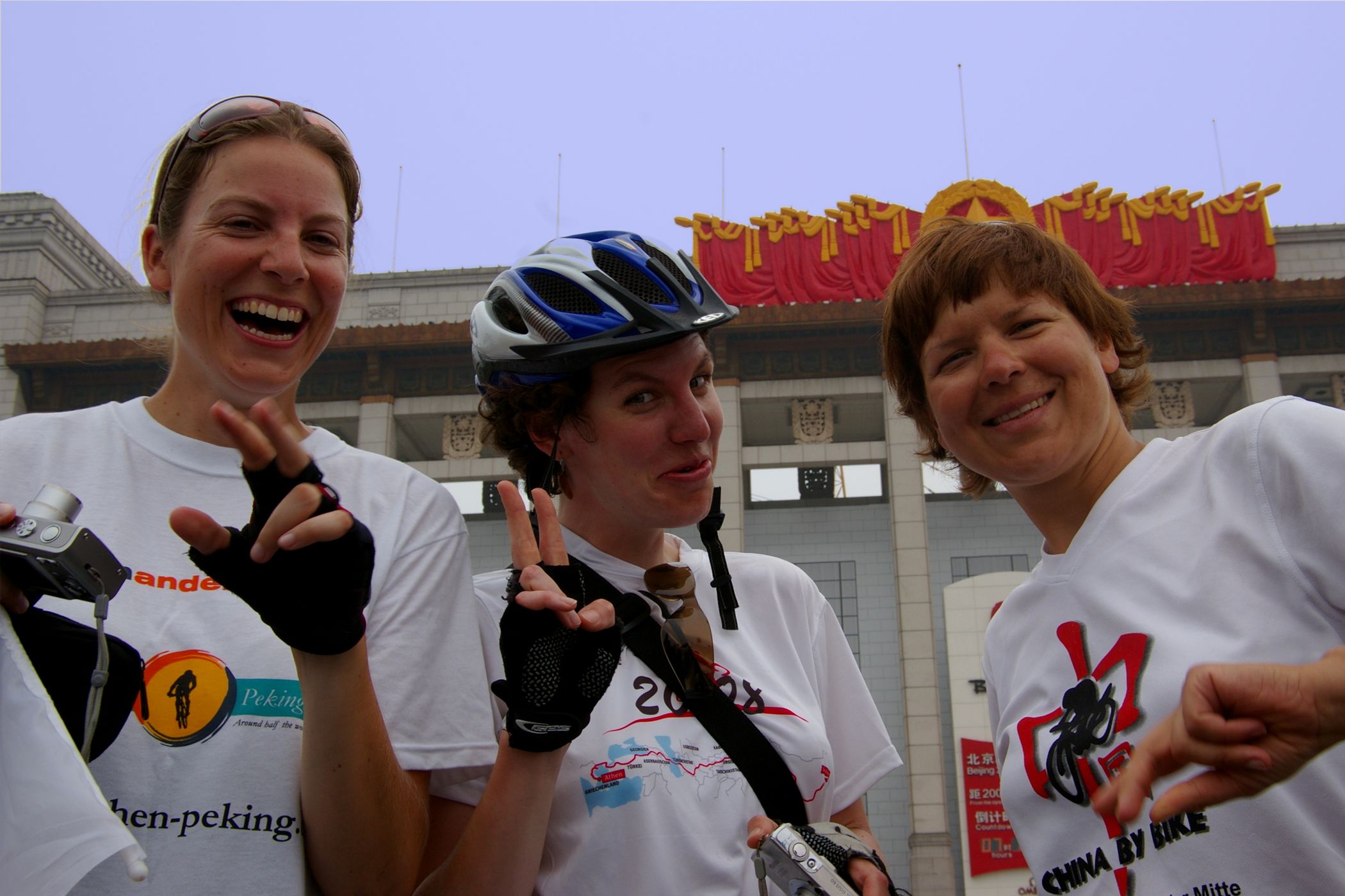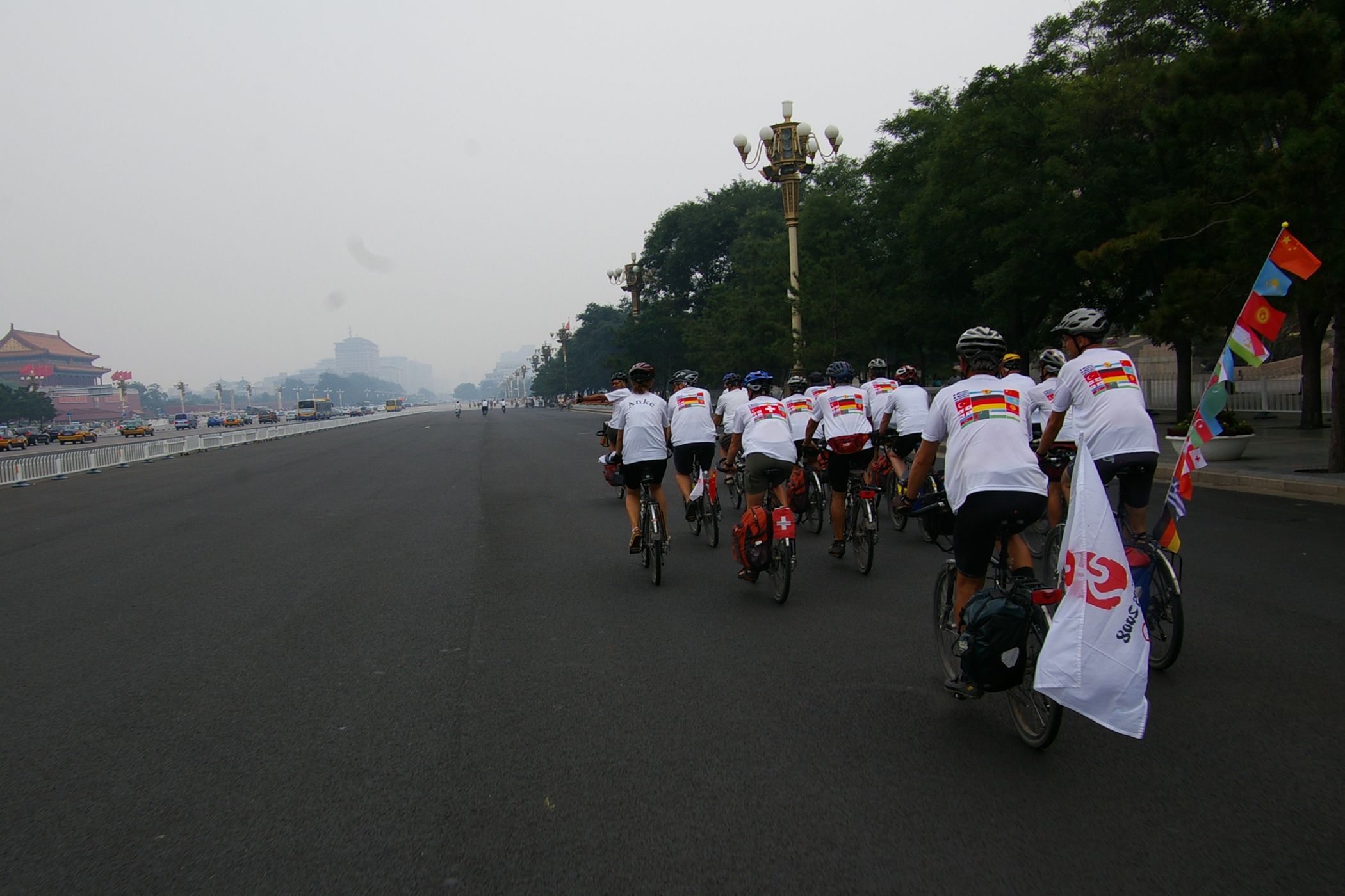 Tag der Ankunft in Peking. Nur ein kurzes Stück verbleibt noch bis zum Ziel. In unseren T-Shirts oder in einem weissen China-by-Bike machen wir als Radgruppe richtig was her. Wenig Verkehr, breite Straßen und das Gefühl es geschafft zu haben lassen uns die letzten Kilometern richtig genussvoll radeln. Wir fahren in unseren schönen T-Shirts durch die Straßen Pekings und erreichen als erstes am "Platz-des-himmlischen-Friedens" den Olympia-Count-Down. Dort stoßen wir neben dem ARD und NDR Team vor allem auf eine begeisterte und interessierte Menge. Zahlreiche Fotos werden geschossen, aber nicht nur von unseren Kameras: sehr viele Chinesen ziehen Ihre Handy-Kamera und lassen sich mit uns mit viel Spaß fotografieren. Der mitgebrachte Sekt wird aufgeschossen und wie bei einem Formel 1 Rennen in die Menge geschäumt. Jetzt haben wir unsere Ziel nun endgültig erreicht, die Freude ist groß. Aber die Begeisterung der Bevölkerung ist großartig und die Stimmung ist wirklich toll. Unsere nächster Punkt ist der Platz vor dem berühmten Mao Bild. Auch hier werden Fotos mit der begeisterten Menge geschossen. Wieder erwarten haben wir, trotz höchster Sicherheitsvorkehrungen seitens der Behörden, keinerlei Probleme dadurch, das wir hier einen gewaltigen Auflauf provozieren. Danach geht es zur deutschen Botschaft, wo auch die Leute der Busreise von Athen nach Peking eintreffen. Der Botschafter empfängt uns mit einer kurzen Rede und danach geht es in den Gastgarten mit Keksen und Getränken. Danach wollen wir nur noch ins Hotel, der Tag war anstrengend, weil es war nicht nur ein ereignisreicher sondern auch ein besonders heißer Tag.