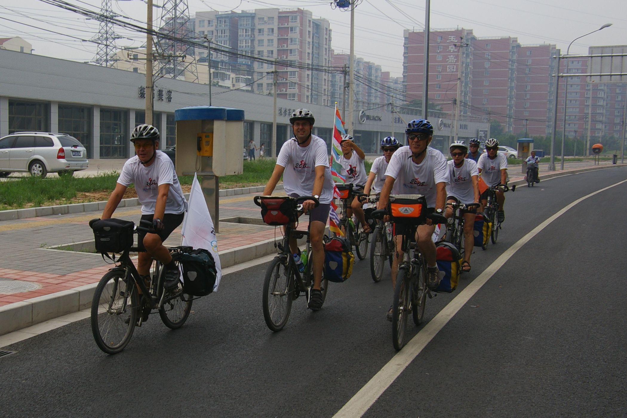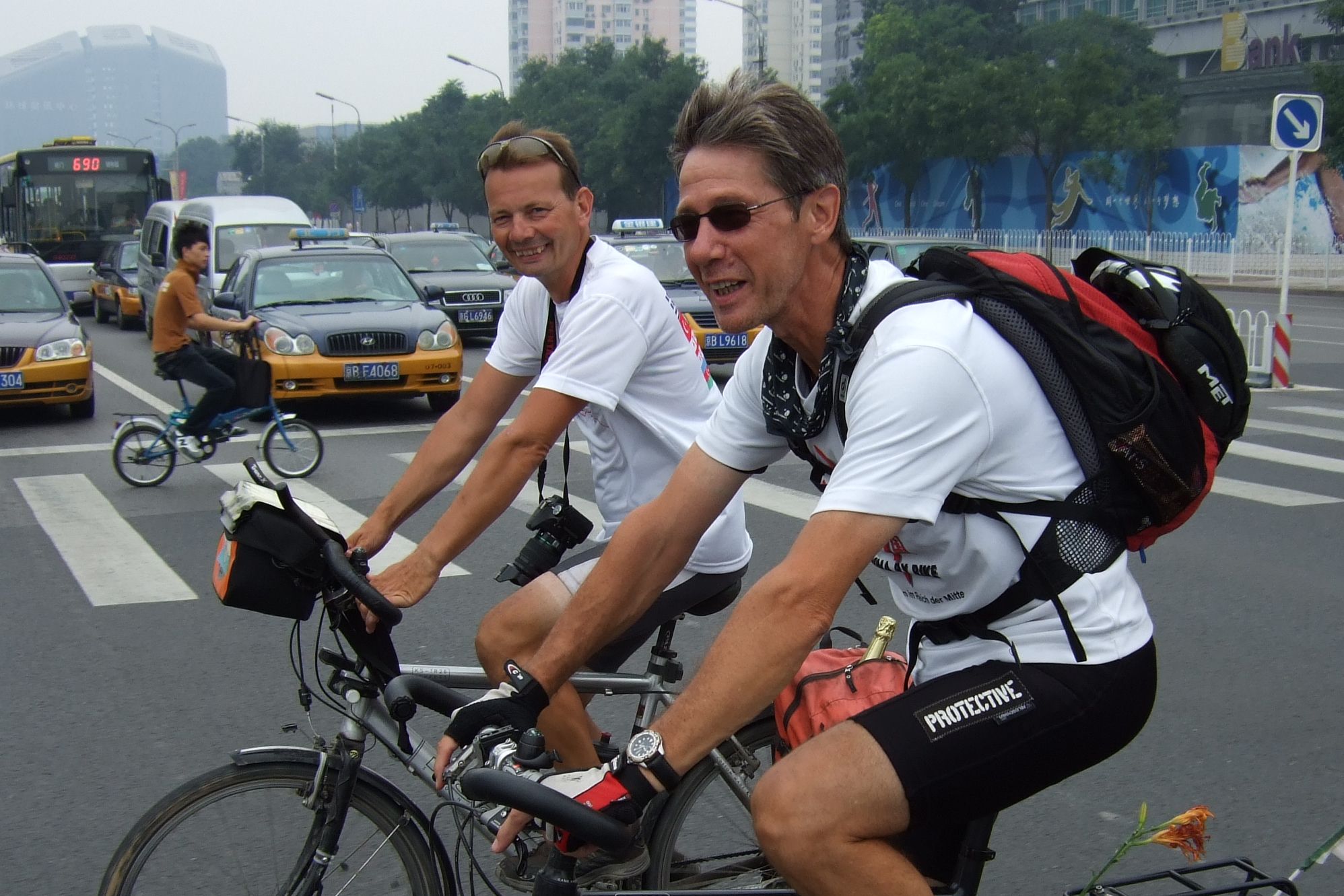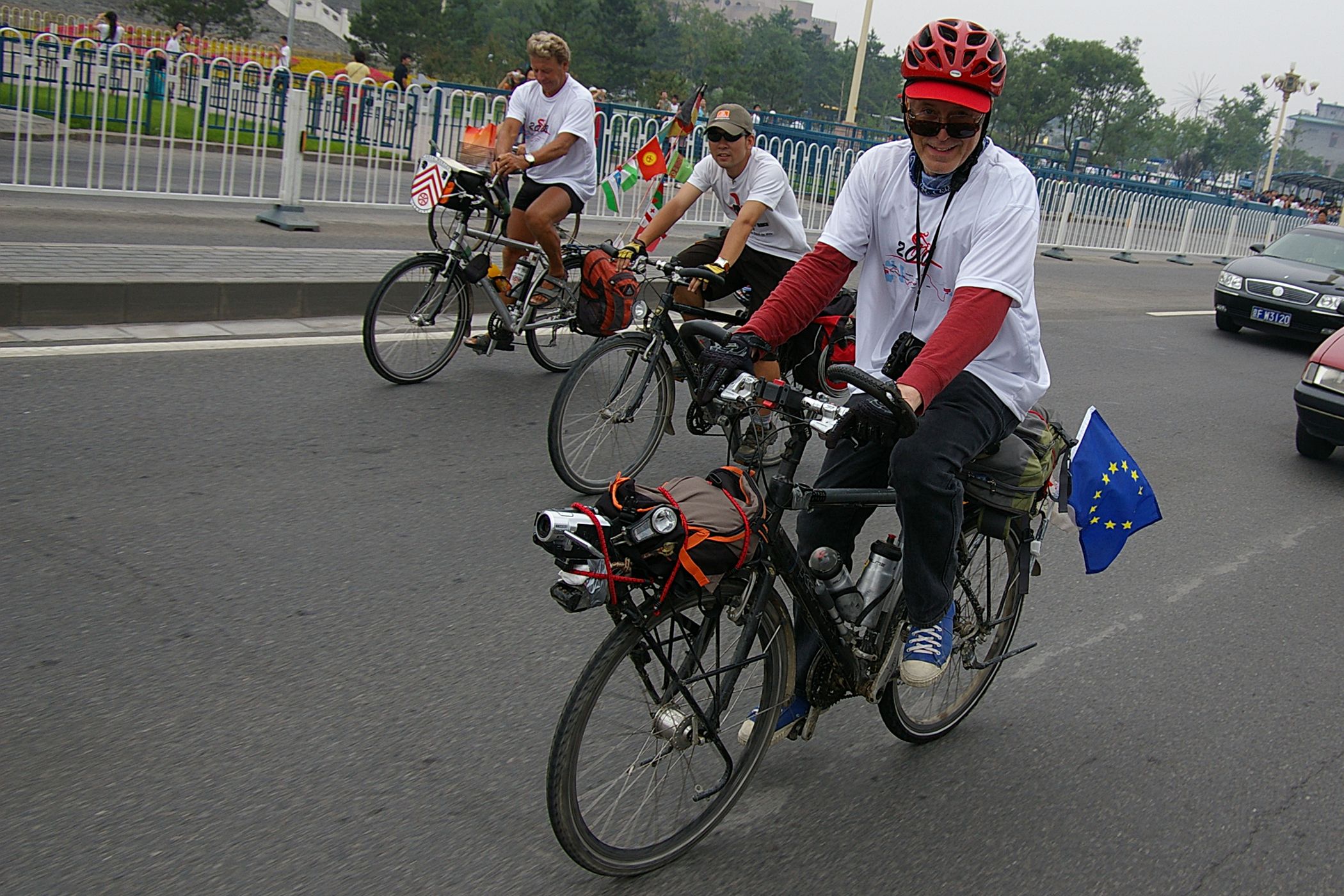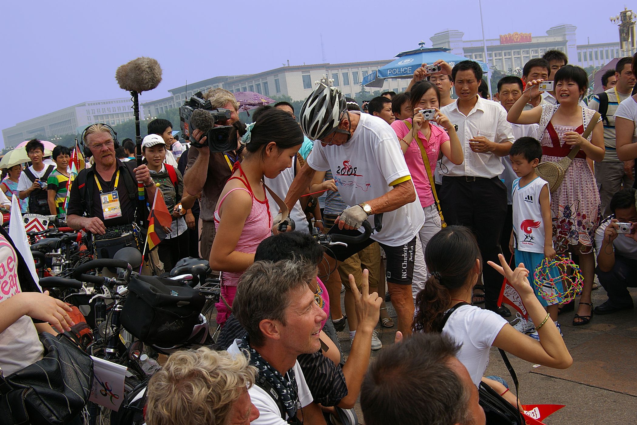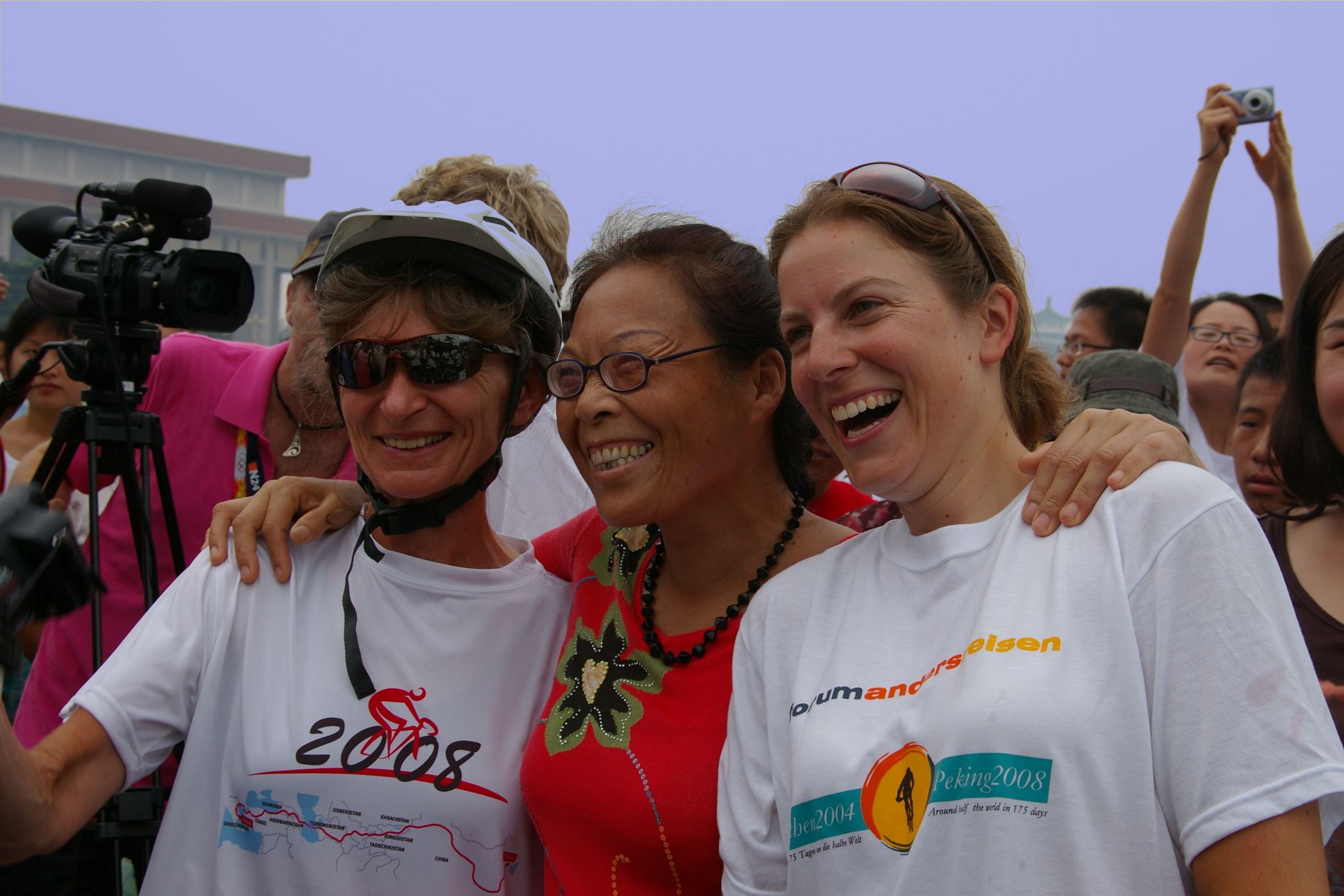 Tag der Ankunft in Peking. Nur ein kurzes Stück verbleibt noch bis zum Ziel. In unseren T-Shirts oder in einem weissen China-by-Bike machen wir als Radgruppe richtig was her. Wenig Verkehr, breite Straßen und das Gefühl es geschafft zu haben lassen uns die letzten Kilometern richtig genussvoll radeln. Wir fahren in unseren schönen T-Shirts durch die Straßen Pekings und erreichen als erstes am "Platz-des-himmlischen-Friedens" den Olympia-Count-Down. Dort stoßen wir neben dem ARD und NDR Team vor allem auf eine begeisterte und interessierte Menge. Zahlreiche Fotos werden geschossen, aber nicht nur von unseren Kameras: sehr viele Chinesen ziehen Ihre Handy-Kamera und lassen sich mit uns mit viel Spaß fotografieren. Der mitgebrachte Sekt wird aufgeschossen und wie bei einem Formel 1 Rennen in die Menge geschäumt. Jetzt haben wir unsere Ziel nun endgültig erreicht, die Freude ist groß. Aber die Begeisterung der Bevölkerung ist großartig und die Stimmung ist wirklich toll. Unsere nächster Punkt ist der Platz vor dem berühmten Mao Bild. Auch hier werden Fotos mit der begeisterten Menge geschossen. Wieder erwarten haben wir, trotz höchster Sicherheitsvorkehrungen seitens der Behörden, keinerlei Probleme dadurch, das wir hier einen gewaltigen Auflauf provozieren. Danach geht es zur deutschen Botschaft, wo auch die Leute der Busreise von Athen nach Peking eintreffen. Der Botschafter empfängt uns mit einer kurzen Rede und danach geht es in den Gastgarten mit Keksen und Getränken. Danach wollen wir nur noch ins Hotel, der Tag war anstrengend, weil es war nicht nur ein ereignisreicher sondern auch ein besonders heißer Tag.