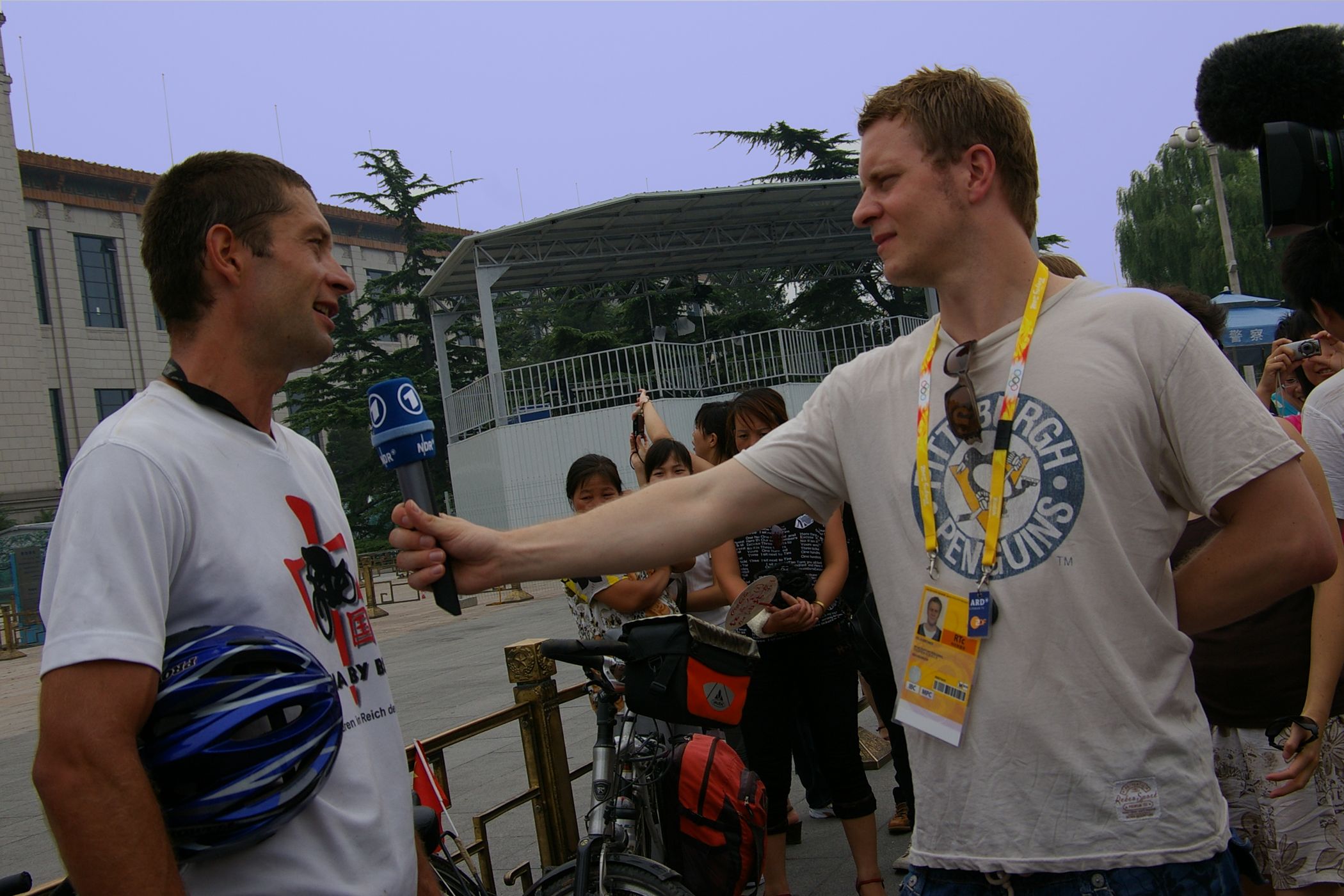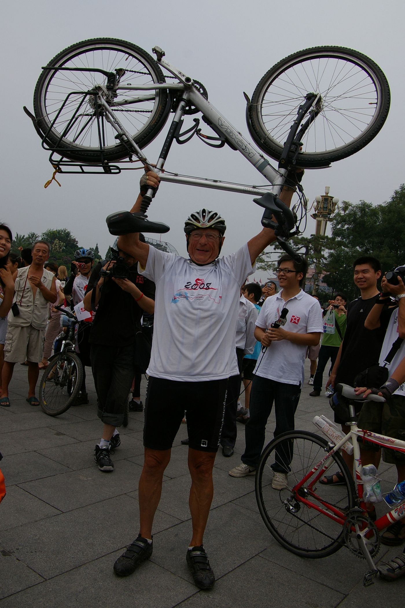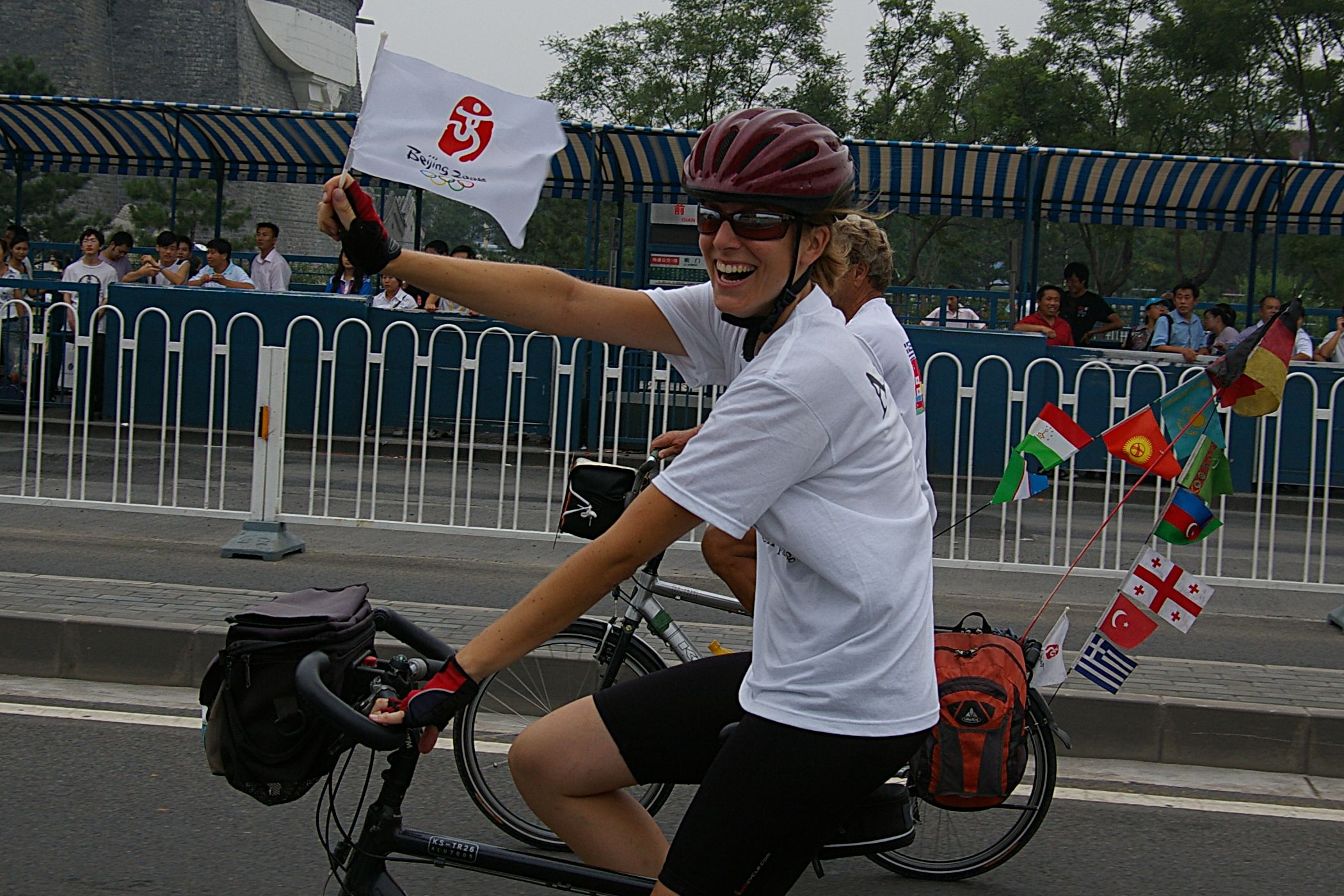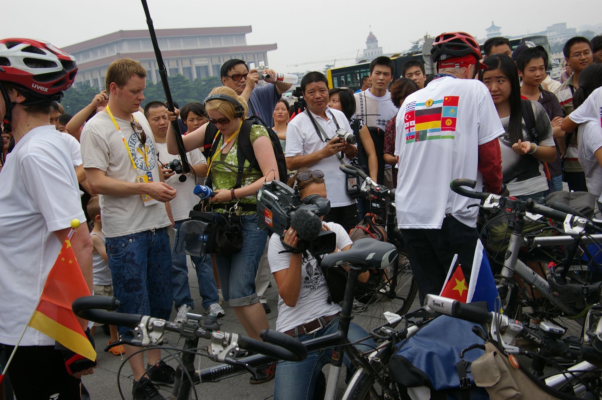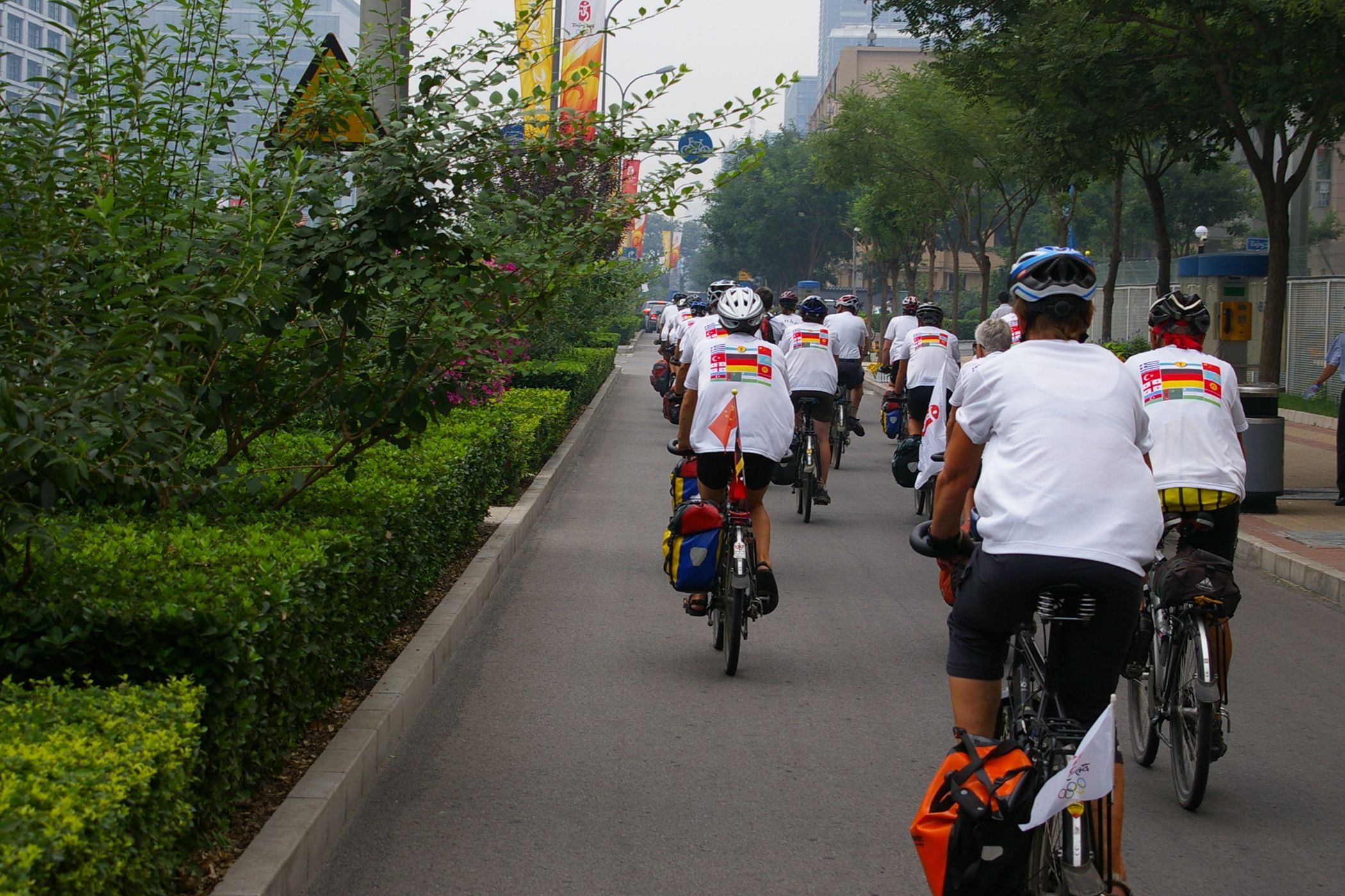 Tag der Ankunft in Peking. Nur ein kurzes Stück verbleibt noch bis zum Ziel. In unseren T-Shirts oder in einem weissen China-by-Bike machen wir als Radgruppe richtig was her. Wenig Verkehr, breite Straßen und das Gefühl es geschafft zu haben lassen uns die letzten Kilometern richtig genussvoll radeln. Wir fahren in unseren schönen T-Shirts durch die Straßen Pekings und erreichen als erstes am "Platz-des-himmlischen-Friedens" den Olympia-Count-Down. Dort stoßen wir neben dem ARD und NDR Team vor allem auf eine begeisterte und interessierte Menge. Zahlreiche Fotos werden geschossen, aber nicht nur von unseren Kameras: sehr viele Chinesen ziehen Ihre Handy-Kamera und lassen sich mit uns mit viel Spaß fotografieren. Der mitgebrachte Sekt wird aufgeschossen und wie bei einem Formel 1 Rennen in die Menge geschäumt. Jetzt haben wir unsere Ziel nun endgültig erreicht, die Freude ist groß. Aber die Begeisterung der Bevölkerung ist großartig und die Stimmung ist wirklich toll. Unsere nächster Punkt ist der Platz vor dem berühmten Mao Bild. Auch hier werden Fotos mit der begeisterten Menge geschossen. Wieder erwarten haben wir, trotz höchster Sicherheitsvorkehrungen seitens der Behörden, keinerlei Probleme dadurch, das wir hier einen gewaltigen Auflauf provozieren. Danach geht es zur deutschen Botschaft, wo auch die Leute der Busreise von Athen nach Peking eintreffen. Der Botschafter empfängt uns mit einer kurzen Rede und danach geht es in den Gastgarten mit Keksen und Getränken. Danach wollen wir nur noch ins Hotel, der Tag war anstrengend, weil es war nicht nur ein ereignisreicher sondern auch ein besonders heißer Tag.