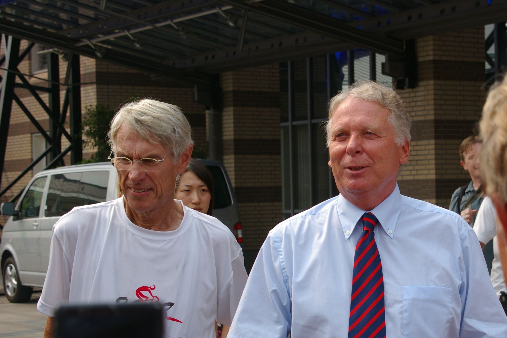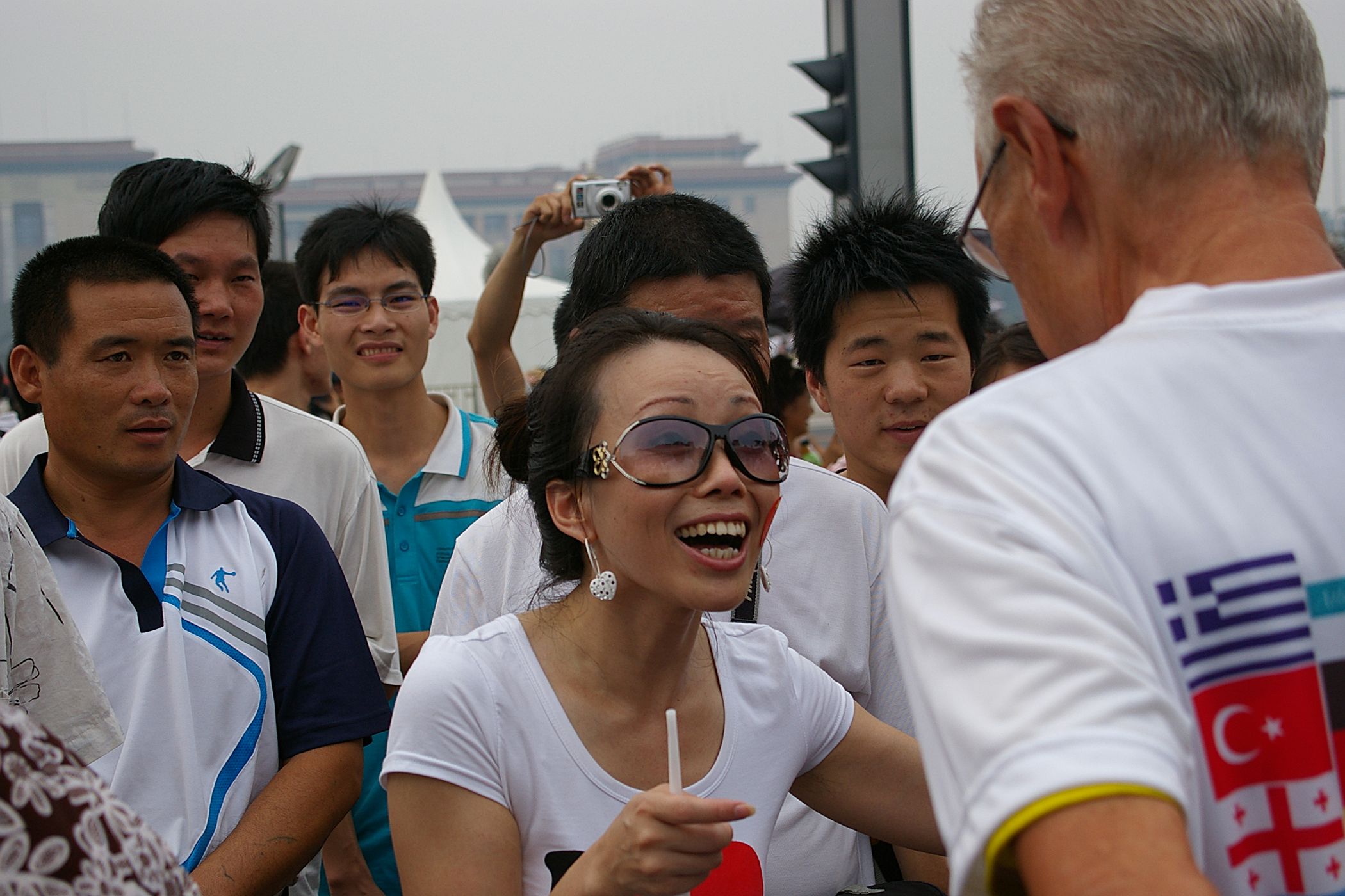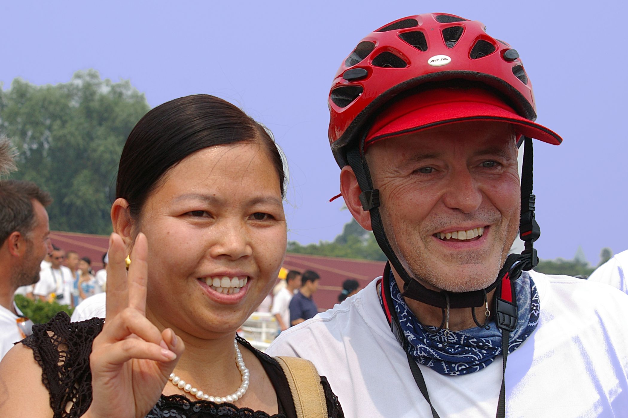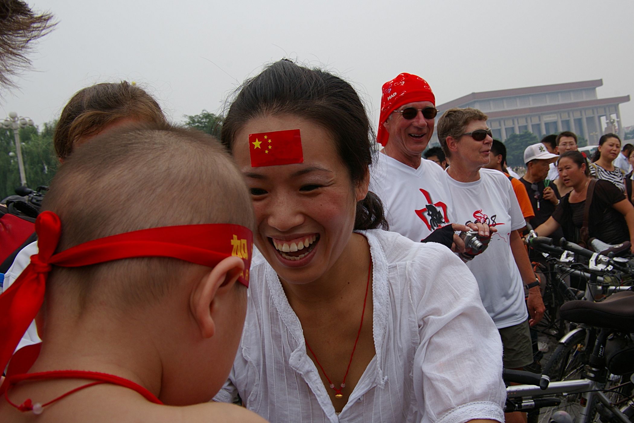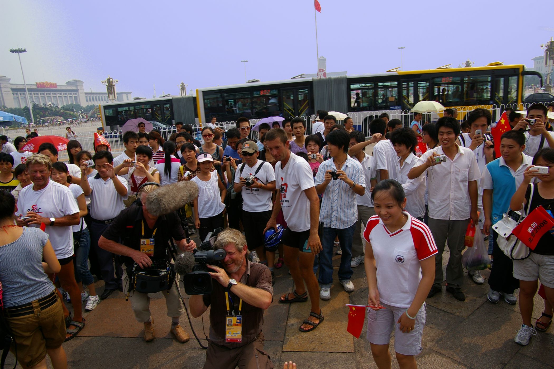 Tag der Ankunft in Peking. Nur ein kurzes Stück verbleibt noch bis zum Ziel. In unseren T-Shirts oder in einem weissen China-by-Bike machen wir als Radgruppe richtig was her. Wenig Verkehr, breite Straßen und das Gefühl es geschafft zu haben lassen uns die letzten Kilometern richtig genussvoll radeln. Wir fahren in unseren schönen T-Shirts durch die Straßen Pekings und erreichen als erstes am "Platz-des-himmlischen-Friedens" den Olympia-Count-Down. Dort stoßen wir neben dem ARD und NDR Team vor allem auf eine begeisterte und interessierte Menge. Zahlreiche Fotos werden geschossen, aber nicht nur von unseren Kameras: sehr viele Chinesen ziehen Ihre Handy-Kamera und lassen sich mit uns mit viel Spaß fotografieren. Der mitgebrachte Sekt wird aufgeschossen und wie bei einem Formel 1 Rennen in die Menge geschäumt. Jetzt haben wir unsere Ziel nun endgültig erreicht, die Freude ist groß. Aber die Begeisterung der Bevölkerung ist großartig und die Stimmung ist wirklich toll. Unsere nächster Punkt ist der Platz vor dem berühmten Mao Bild. Auch hier werden Fotos mit der begeisterten Menge geschossen. Wieder erwarten haben wir, trotz höchster Sicherheitsvorkehrungen seitens der Behörden, keinerlei Probleme dadurch, das wir hier einen gewaltigen Auflauf provozieren. Danach geht es zur deutschen Botschaft, wo auch die Leute der Busreise von Athen nach Peking eintreffen. Der Botschafter empfängt uns mit einer kurzen Rede und danach geht es in den Gastgarten mit Keksen und Getränken. Danach wollen wir nur noch ins Hotel, der Tag war anstrengend, weil es war nicht nur ein ereignisreicher sondern auch ein besonders heißer Tag.