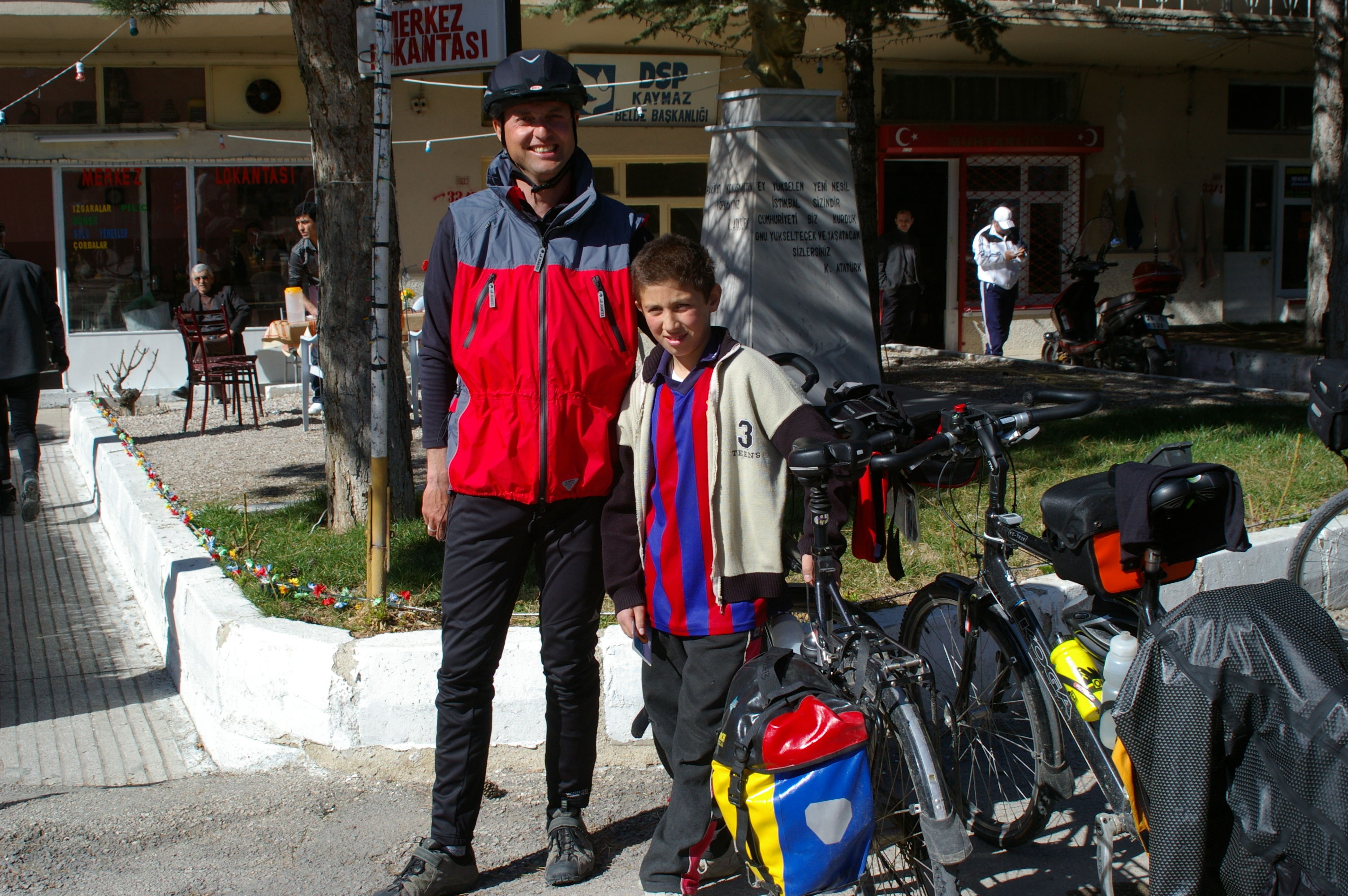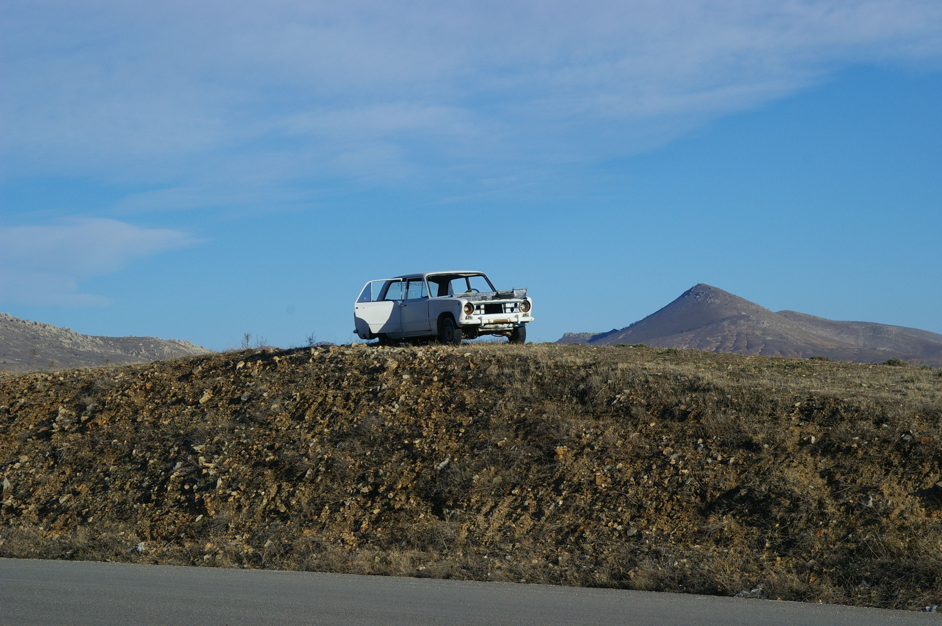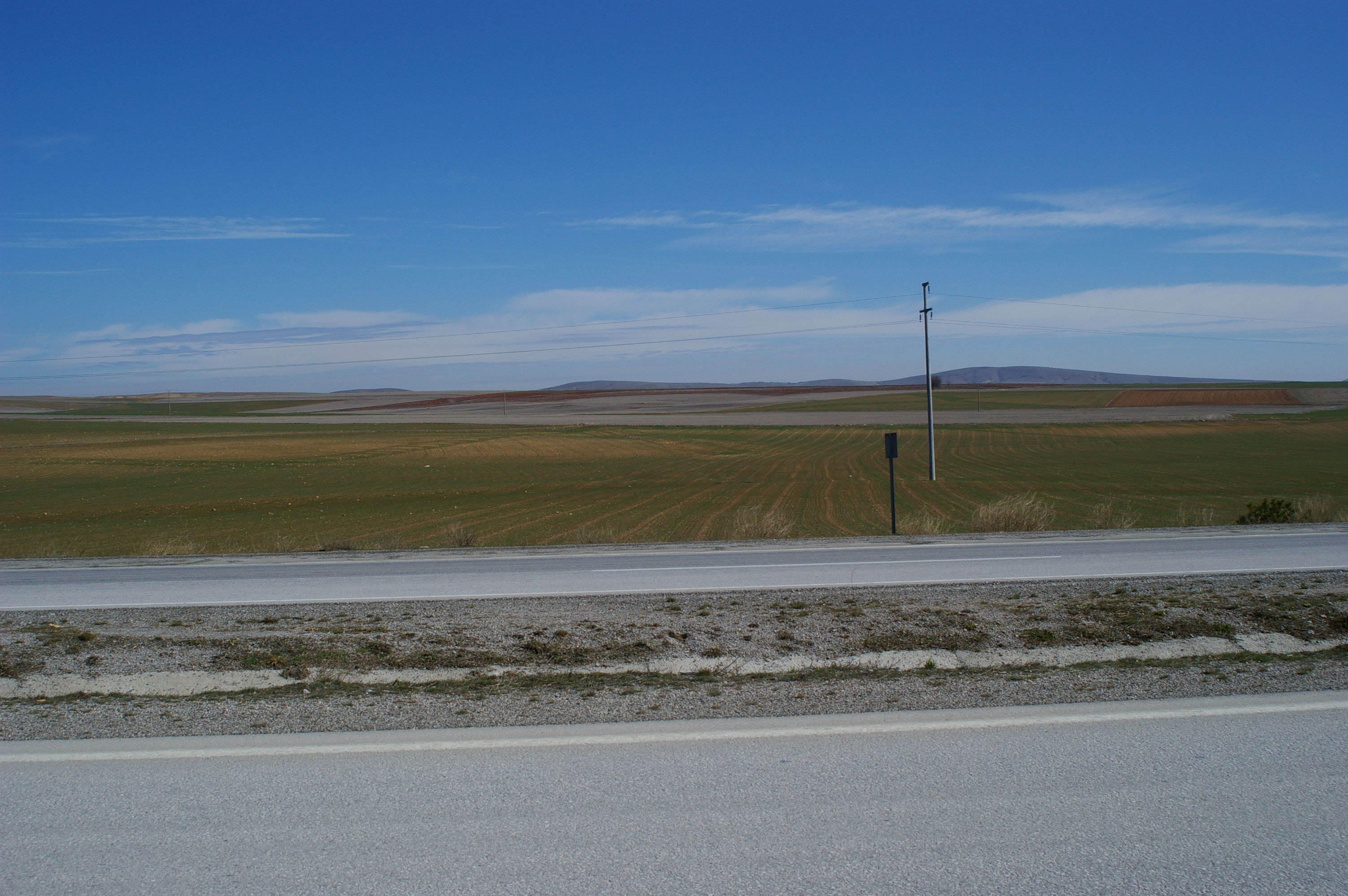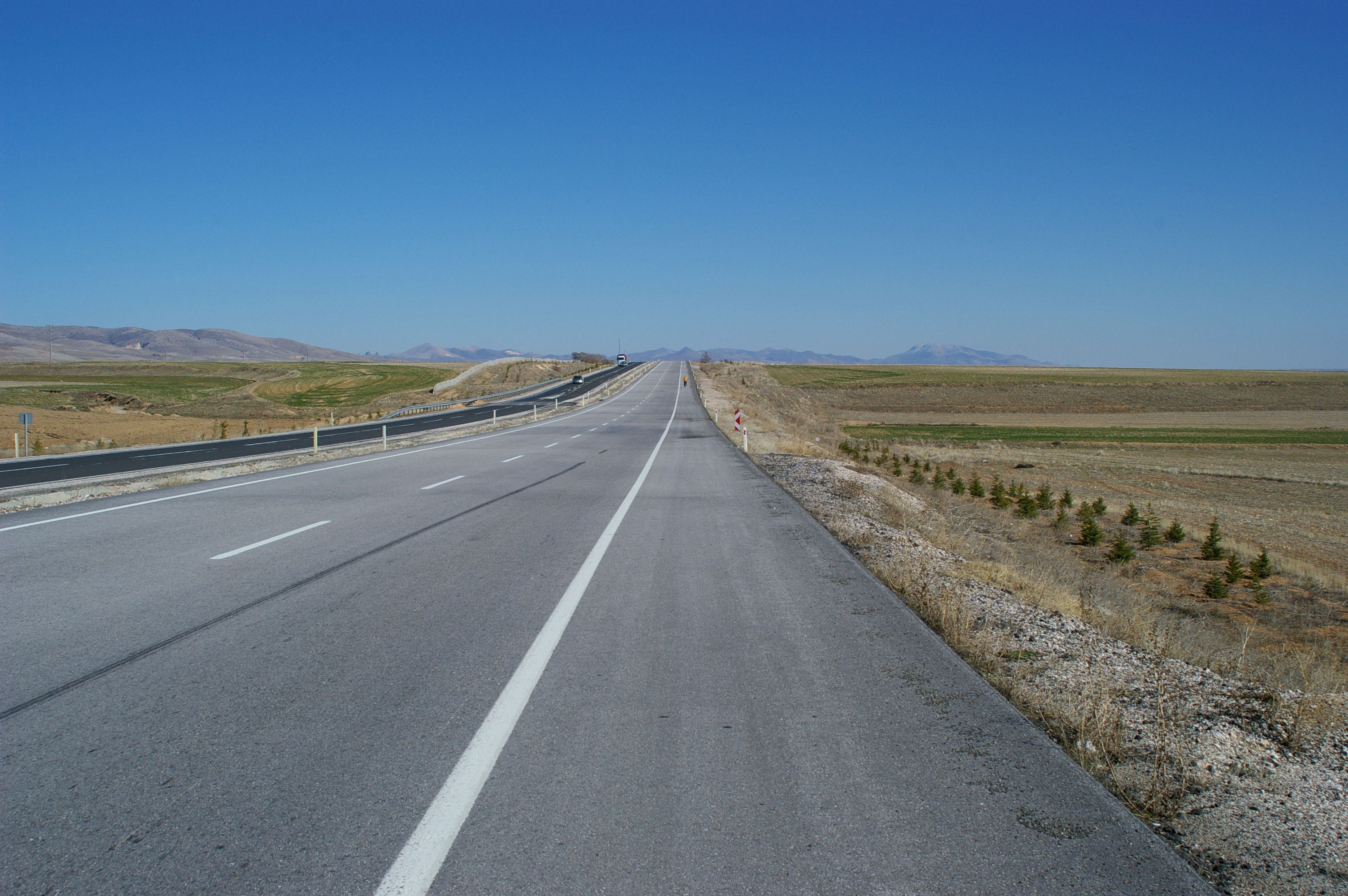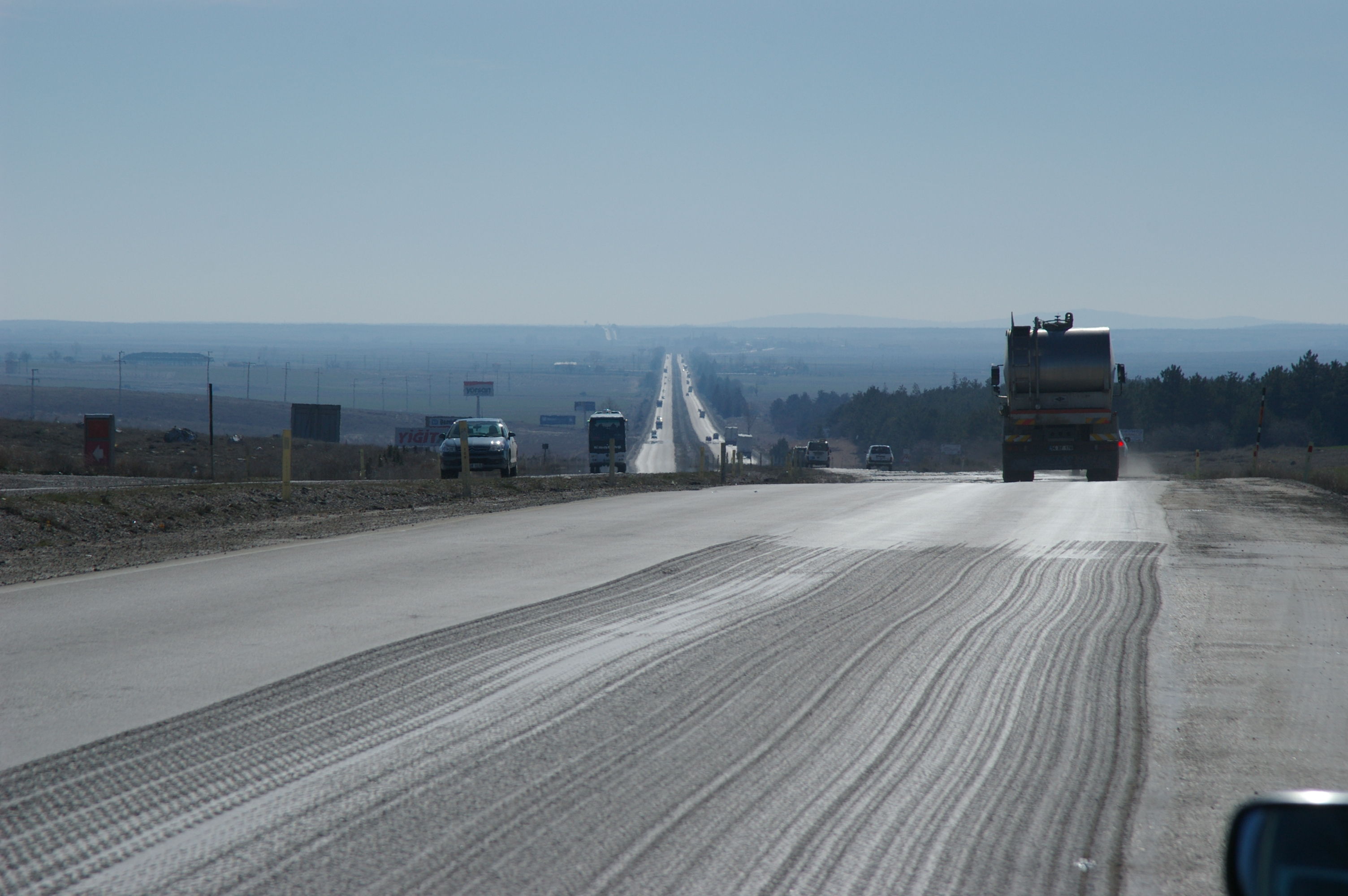Dieser Tag ist in die Kategorie "Keine besonderen Vorkomnisse" einzuordnen. Wir starten bei Kälte, die Räder sind voller Eis, weil es in der Nacht geschneit und geregnet hat. Laut Wettervorhersage sollte es minus 6 Grad haben, so kalt war es aber nicht. Bei strahlendem Sonnenschein fahren wir in Richtung Osten auf der anatolischen Hochebene, die Strasse ist endlos gerade, am Horizont kann man sehr oft die Strasse in gerader Linie verschwinden sehen. Gegen Ende des Tages häufen sich ein paar Reifenpannen, es liegt auf dem Pannenstreifen eine Unzahl an spitzen Drähten und Reifenreste. Wie es aussieht, werden die Reifen der LKW's wirklich bis sie zerfallen gefahren. Abends kehren wir in ein Motel ein, in unserem Zielort gibt es scheinbar keine geeignete Unterkunft. Wir sind ein bischen entäuscht, das wir von den Ortschaften so wenig sehen, da hat es sich die lokale Reiseleitung schon ein wenig einfach gemacht.