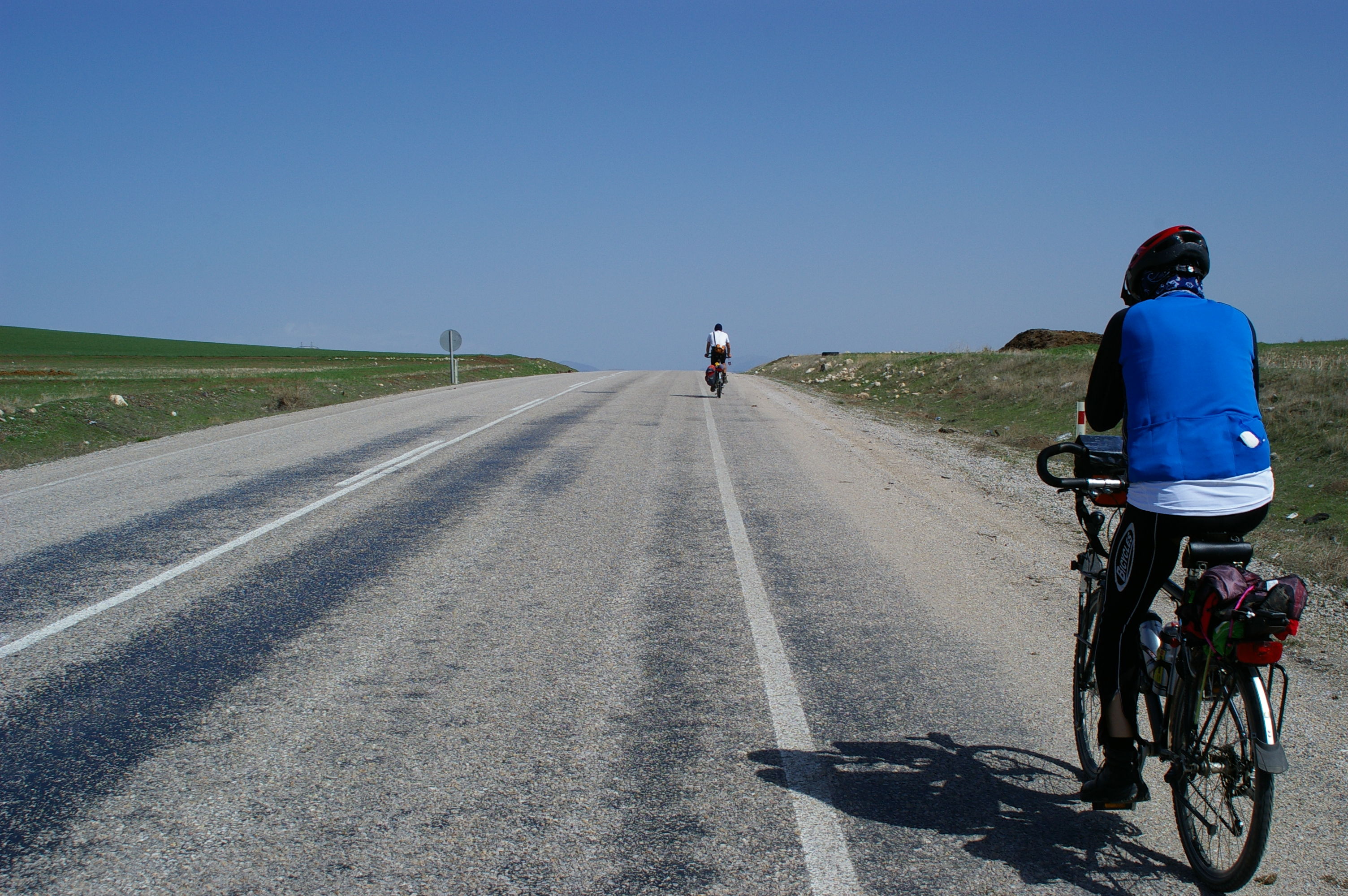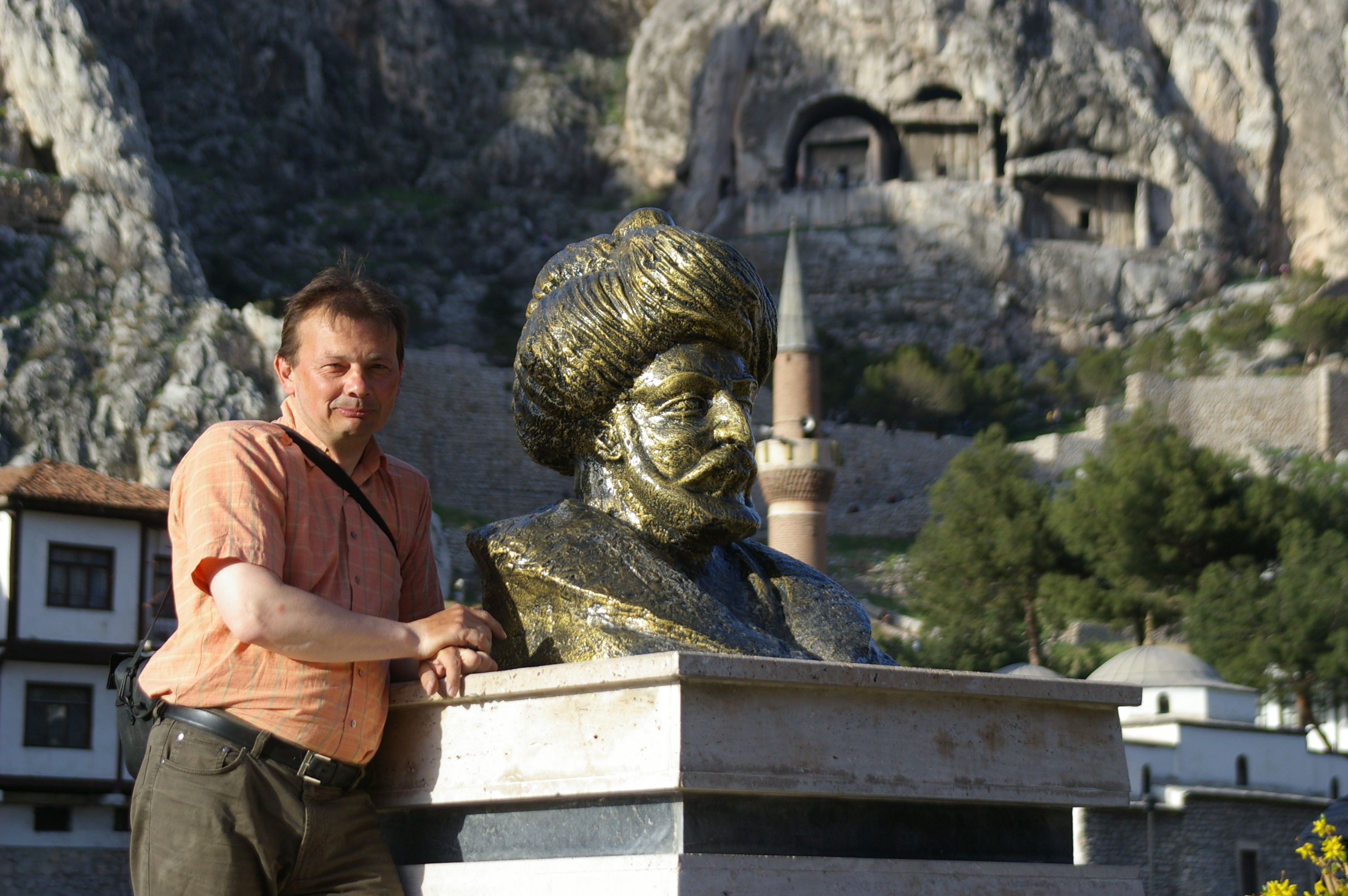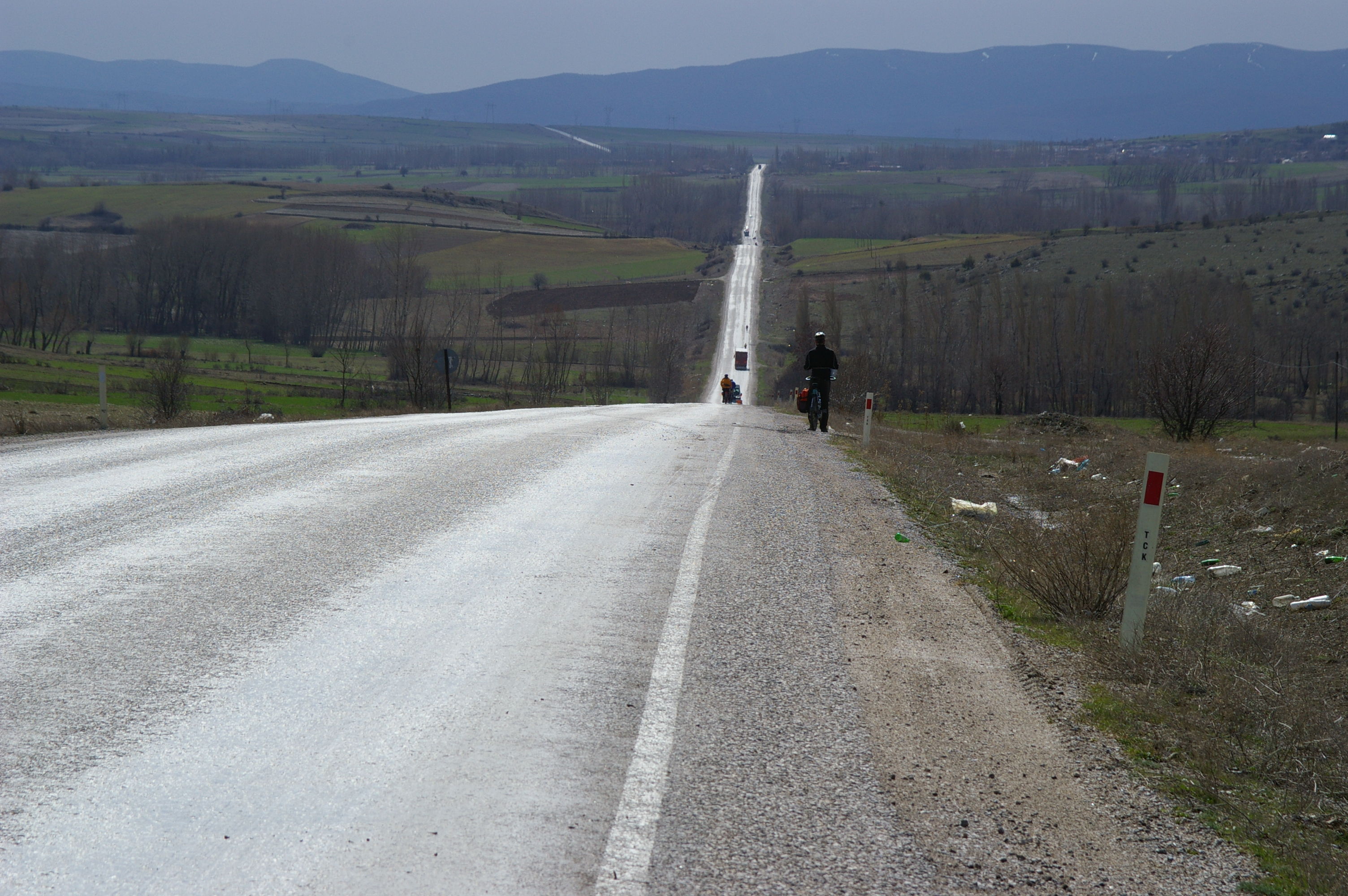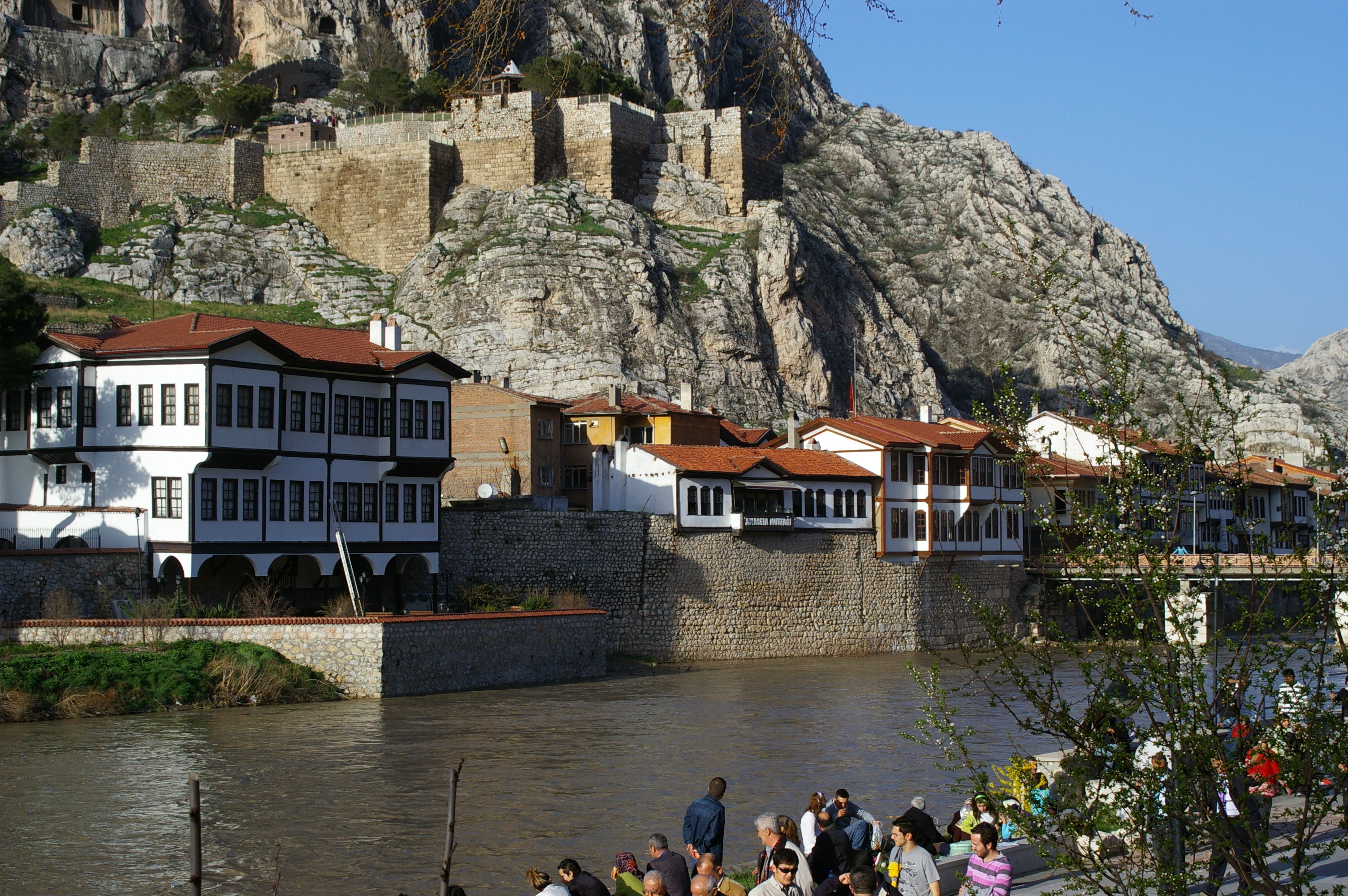 Nach der fast täglichen Fahrradreparatur gehts es einen Pass hoch. Heute fahren wir erstmals nicht auf der Autobahn, sondern eine Nebenstraße, die jedoch auch recht stark befahren ist. In etwa 1200 m Höhe ist es recht kühl, ich hatte eigentlich mit Regen gerechnet, weil die Wettervorhersage vor 3 Tagen einen Regentag angekündigt hatte. Aber, wie fast immer, haben wir wieder Glück mit dem Wetter es wird immer schöner und endet mit glasklarem blauen Himmel bei Sonnenschein. Den Rest des Tages geht es tendenziell bergab, der Zielort liegt auf ca 400 m Höhe. Es ist schon sehr frühlingshaft, frisches Grün ist überall zu sehen, einer der schönsten Radtage in der Türkei bisher. Wir haben zwar alle so genannte "pannensicher" Reifen, aber trotzdem halten uns heute wieder zwei Reifenpannen recht lange auf. So erreichen wir die Stadt Amasya in der späten Nachmittagssonne, etwas später als geplant. Amasya liegt an einem Fluss, der die Stadt teilt. Schöne alte Häuser und eine Uferpromenade voller Leben gefallen uns. Wir radeln entlang der Uferpromenade und sind uns einig, dass wir nach dem Eintreffen in unserem Hotel sofort wieder in die Stadt fahren um Fotos zu machen und das Flair der Stadt zu erleben.