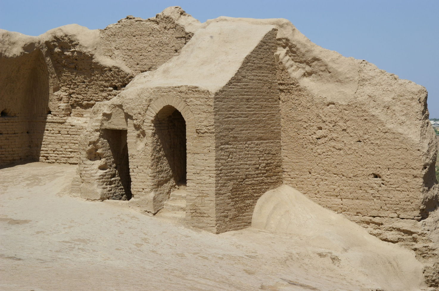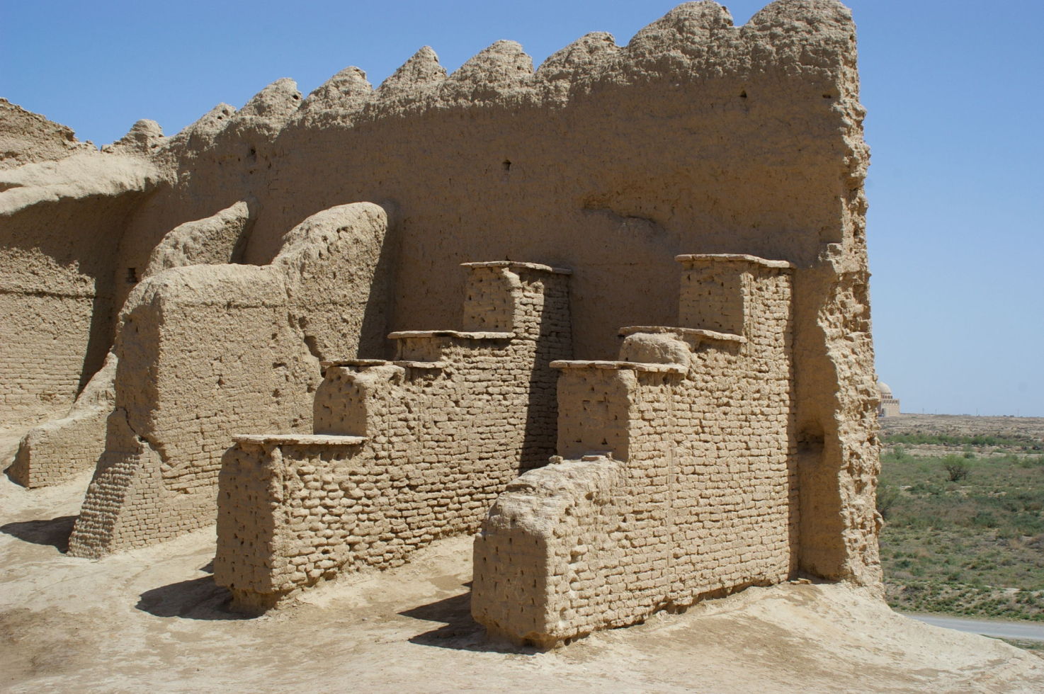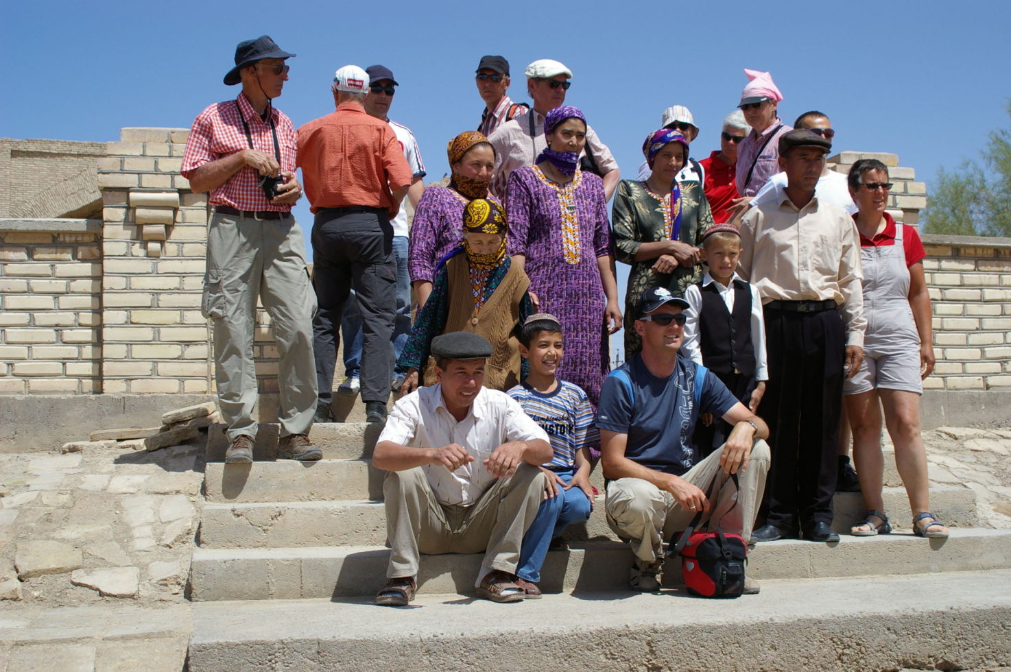 Nach drei anstrengenden Radtagen durch die Wüste kommt uns ein Ruhetag gerade recht. Mit unserem Bus fahren wir 25 km in Richtung Osten und besichtigen dort das Weltkulturerbe Merv. Merv ist deswegen besonders interessant, weil die Stadt im Laufe der Geschichte mehrfach wieder aufgebaut wurde, aber im Gegensatz zu vielen anderen alten Städten nicht übereinander sondern nebeneinander. So ist vieles erhalten geblieben, zumindest aus der Sicht eines Archäologen. Nach der Besichtigung besuchen wir noch einen Basar, die Leute sind sehr freundlich hier, der Markt ist sehr einfach und ursprünglich. Da Turkmenistan kein Tourismusland ist werden wir von der Bevölkerung mit Interesse registriert, weil viele Touristen waren hier bestimmt noch nicht.