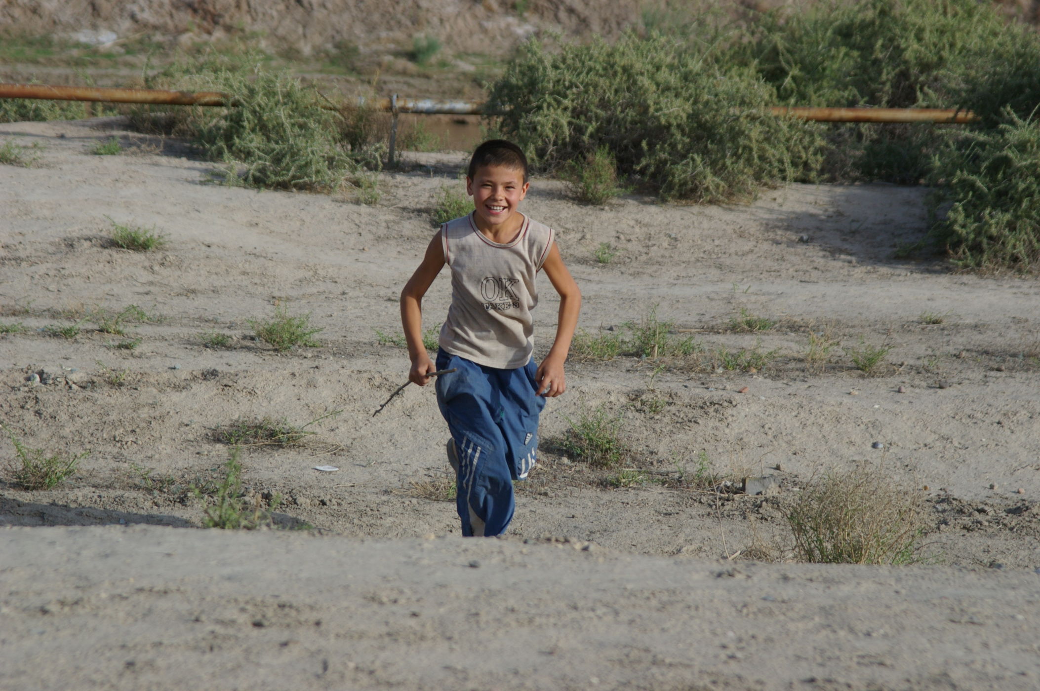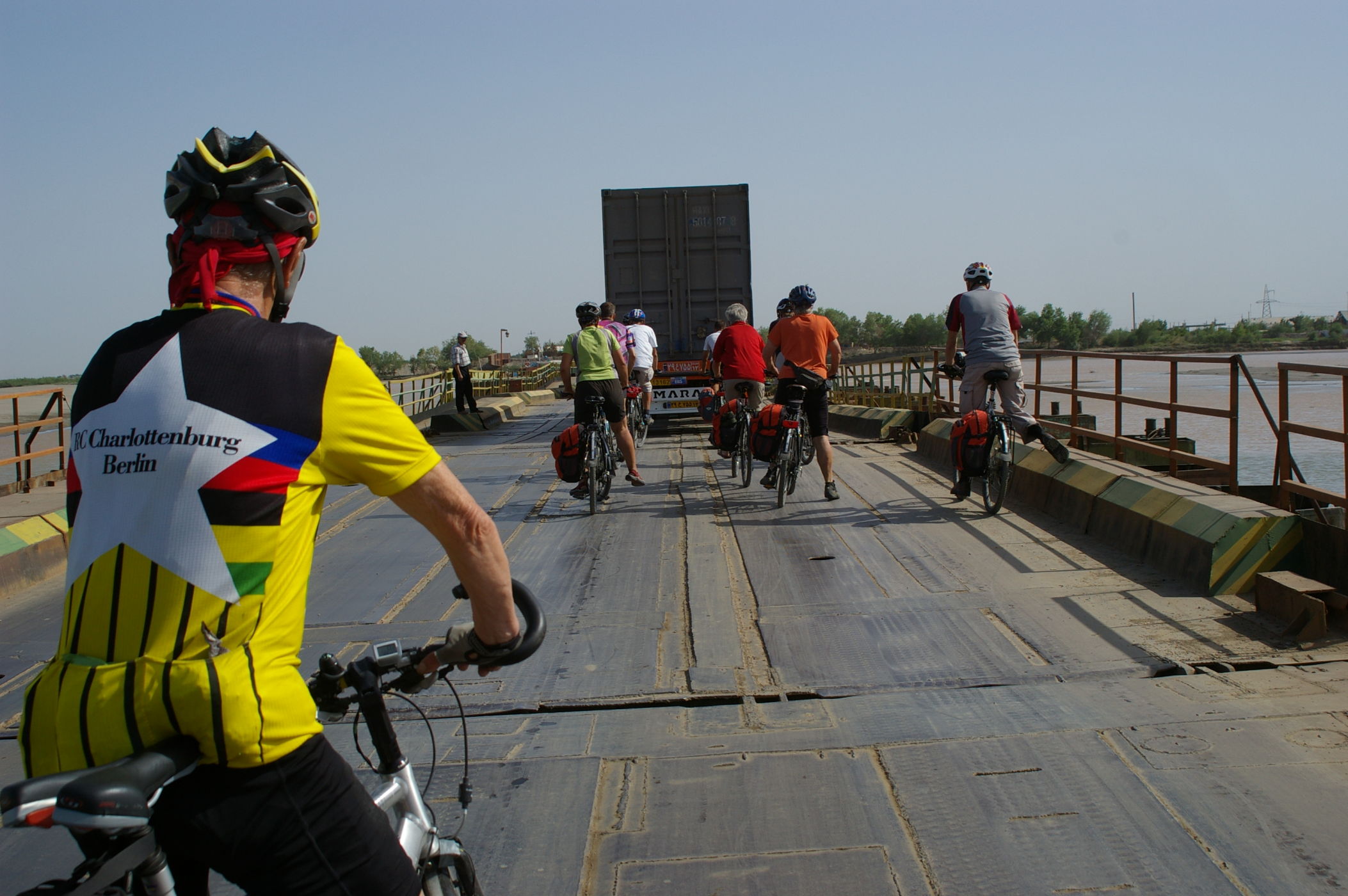Nach eine Fahrt unter Polizeigeleit an die Grenze haben wir Glück beim Grenzübertritt. Wir kommen knapp vor der Mittagspause und werden gerade noch in die Abfertigungsgebäude hineingelassen. Nach weniger als 3 Stunden sind alle Formalitäten erledigt. Nur das Gepäck musste ca. 2 km ohne Begleitfahrzeug transportiert werden. Da haben alle fest angepackt und so war es auch kein grosses Problem. Auf der usbekischen Seite sind die Grenzbeamten freundlich und schnell, ein gutes Ohmen für unseren Aufenthalt in Usbekistan. Nach 25 km Fahrt erreichen wir ein Dorf, Uli merkt an: "Toll hier, da gibt es wieder freundliche Menschen auf der Strasse". In einem Obstgarten ist unser Zeltcamp, die neue lokale Reiseleitung ist bemüht aber ein wenig unbeholfen.