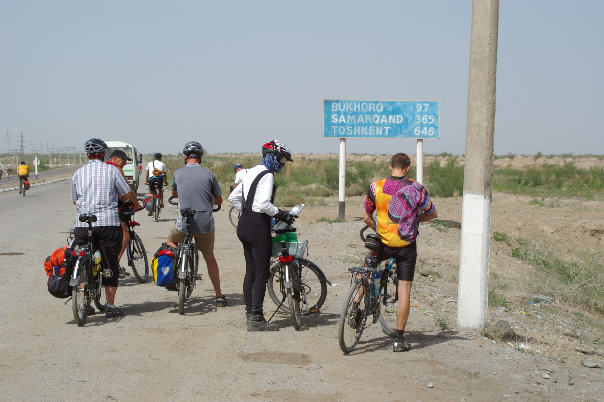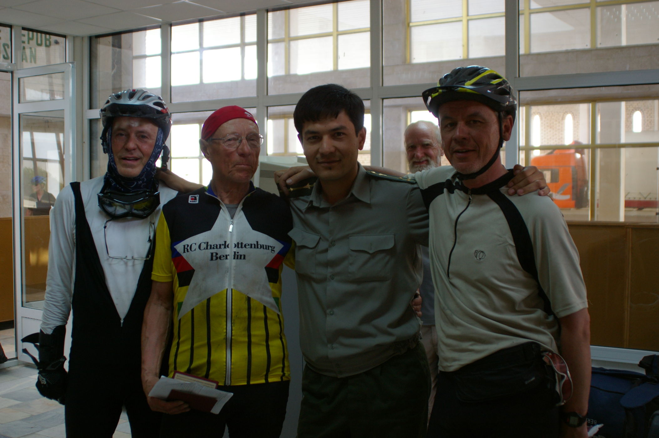 Nach eine Fahrt unter Polizeigeleit an die Grenze haben wir Glück beim Grenzübertritt. Wir kommen knapp vor der Mittagspause und werden gerade noch in die Abfertigungsgebäude hineingelassen. Nach weniger als 3 Stunden sind alle Formalitäten erledigt. Nur das Gepäck musste ca. 2 km ohne Begleitfahrzeug transportiert werden. Da haben alle fest angepackt und so war es auch kein grosses Problem. Auf der usbekischen Seite sind die Grenzbeamten freundlich und schnell, ein gutes Ohmen für unseren Aufenthalt in Usbekistan. Nach 25 km Fahrt erreichen wir ein Dorf, Uli merkt an: "Toll hier, da gibt es wieder freundliche Menschen auf der Strasse". In einem Obstgarten ist unser Zeltcamp, die neue lokale Reiseleitung ist freundlich aber ein wenig unbeholfen.