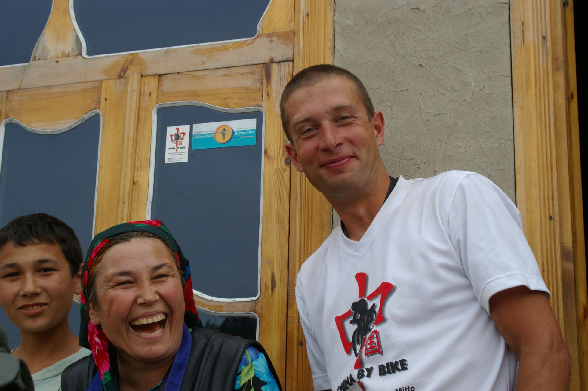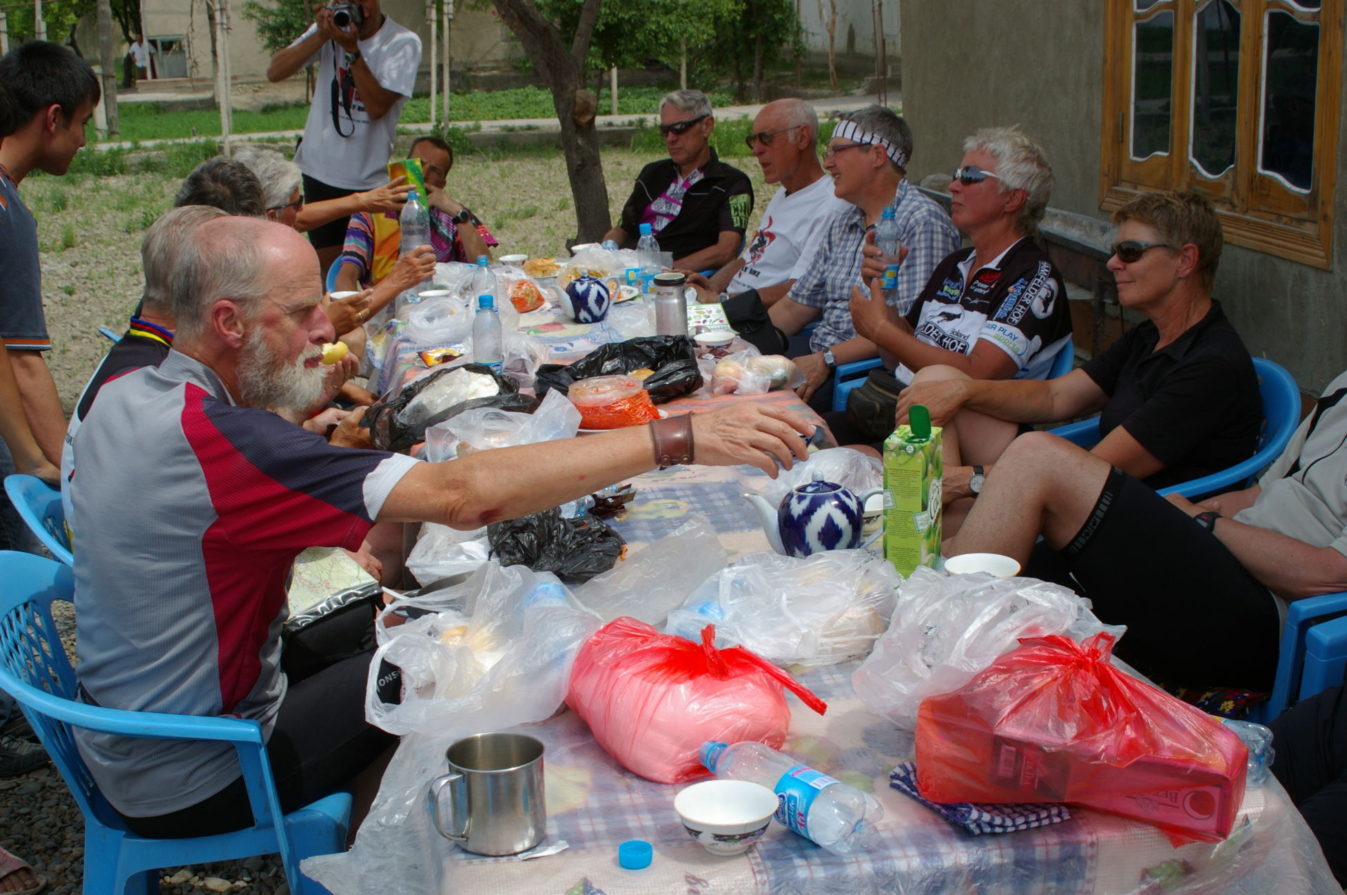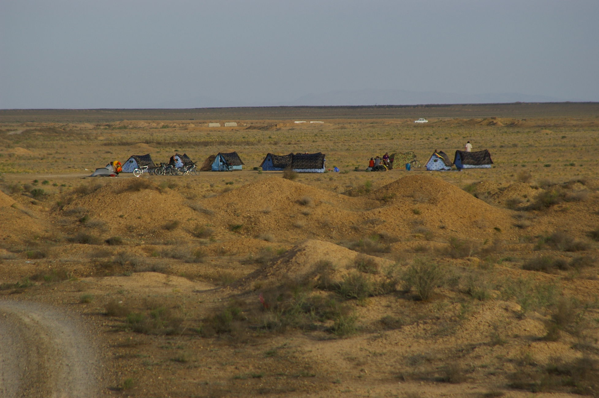 Der Weg nach Samarkand beginnt sehr gemütlich. Es ist flach und die Strecke ist kurz. Wegen eines Missverständnisses kürzen wir die Strecke ein wenig ab und fahren auf der Autobahn mit dem scheinbar hier überall üblichen Polzeischutz direkt in den Ort Galaasyia. Dort kaufen wir am Markt ein paar gute Sachen für die Mittagspause. Das Mittagsessen wird wieder zu einem netten Erlebnis, wir sitzen vor einer Teestube und das ganze Dorf läuft zusammen. Eine Gelegenheit zahlreiche hübsche Fotos zu machen. Danach tauchen wir wieder in die Wüste ein. Es gibt eine Zeltübernachtung sehr nahe zu einem kleinen See den wir für ein erfrischendes Bad nutzen.