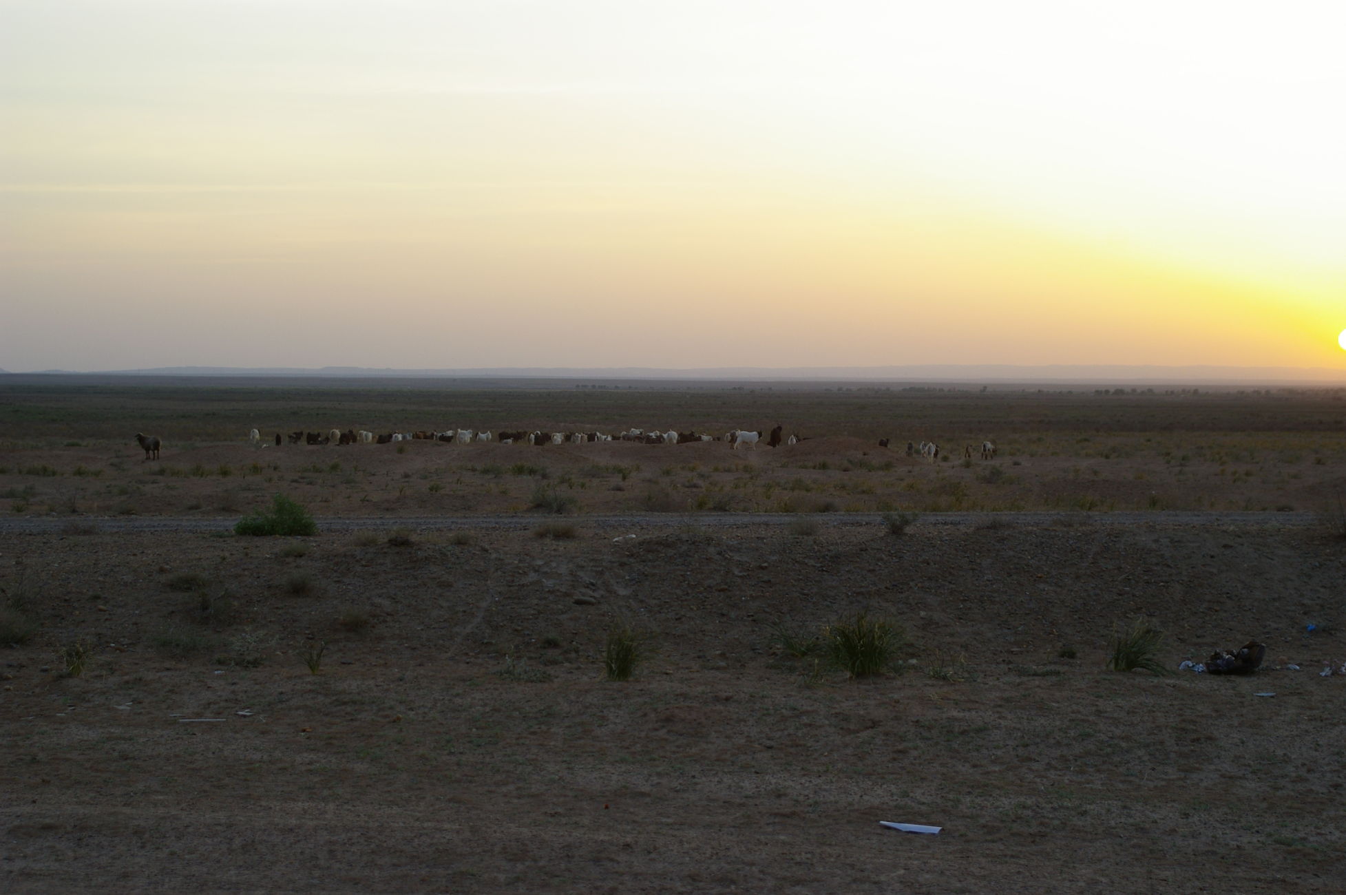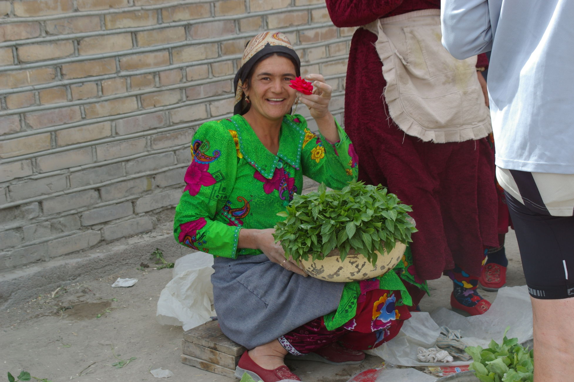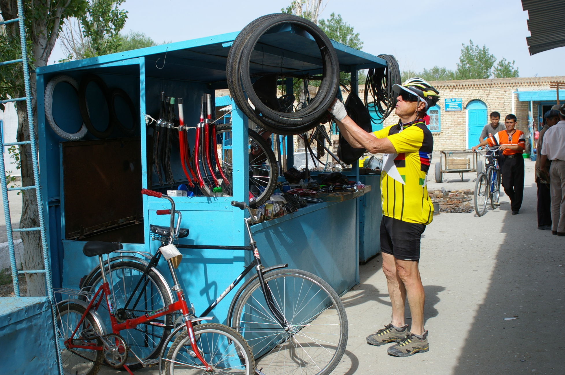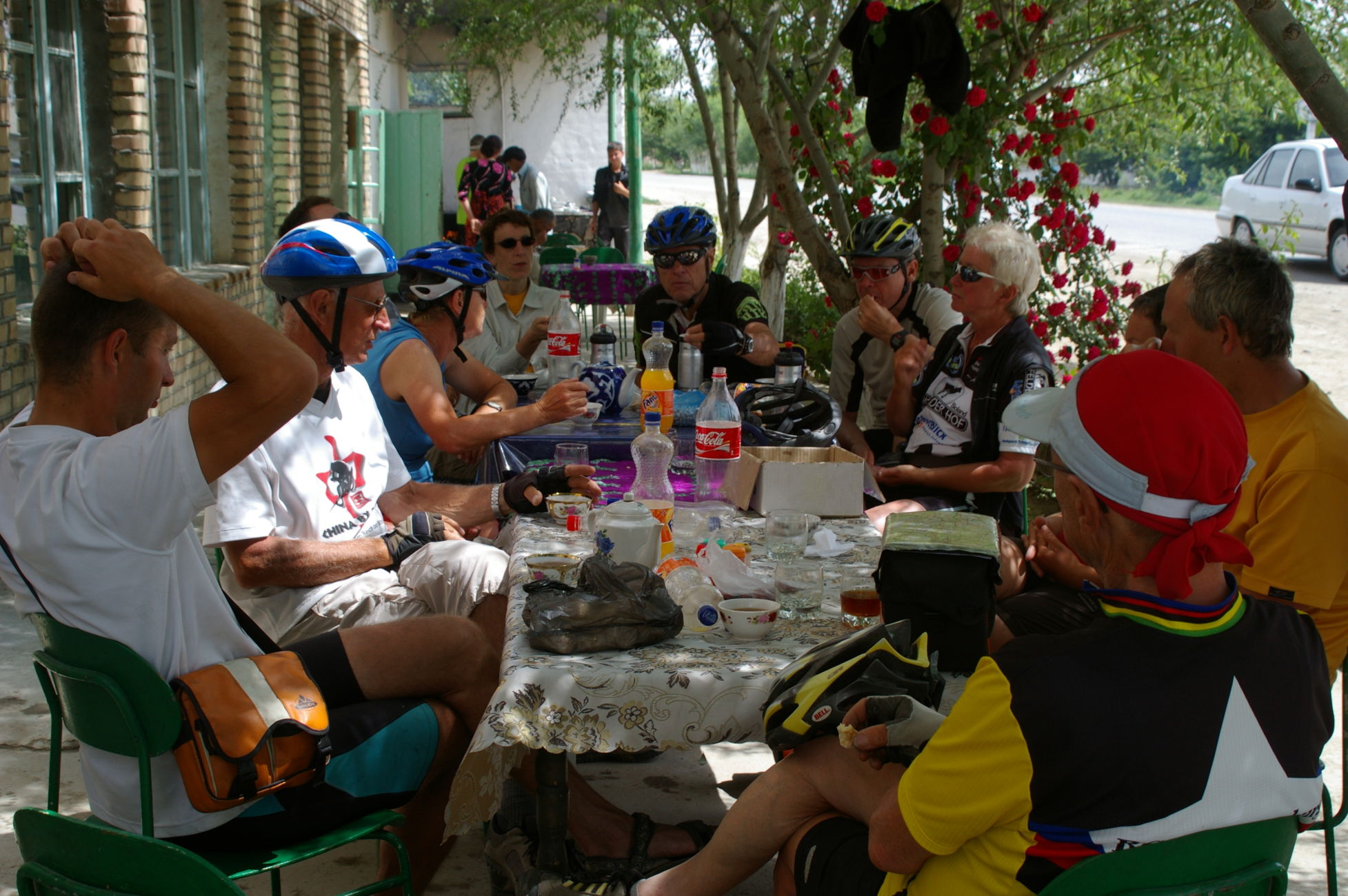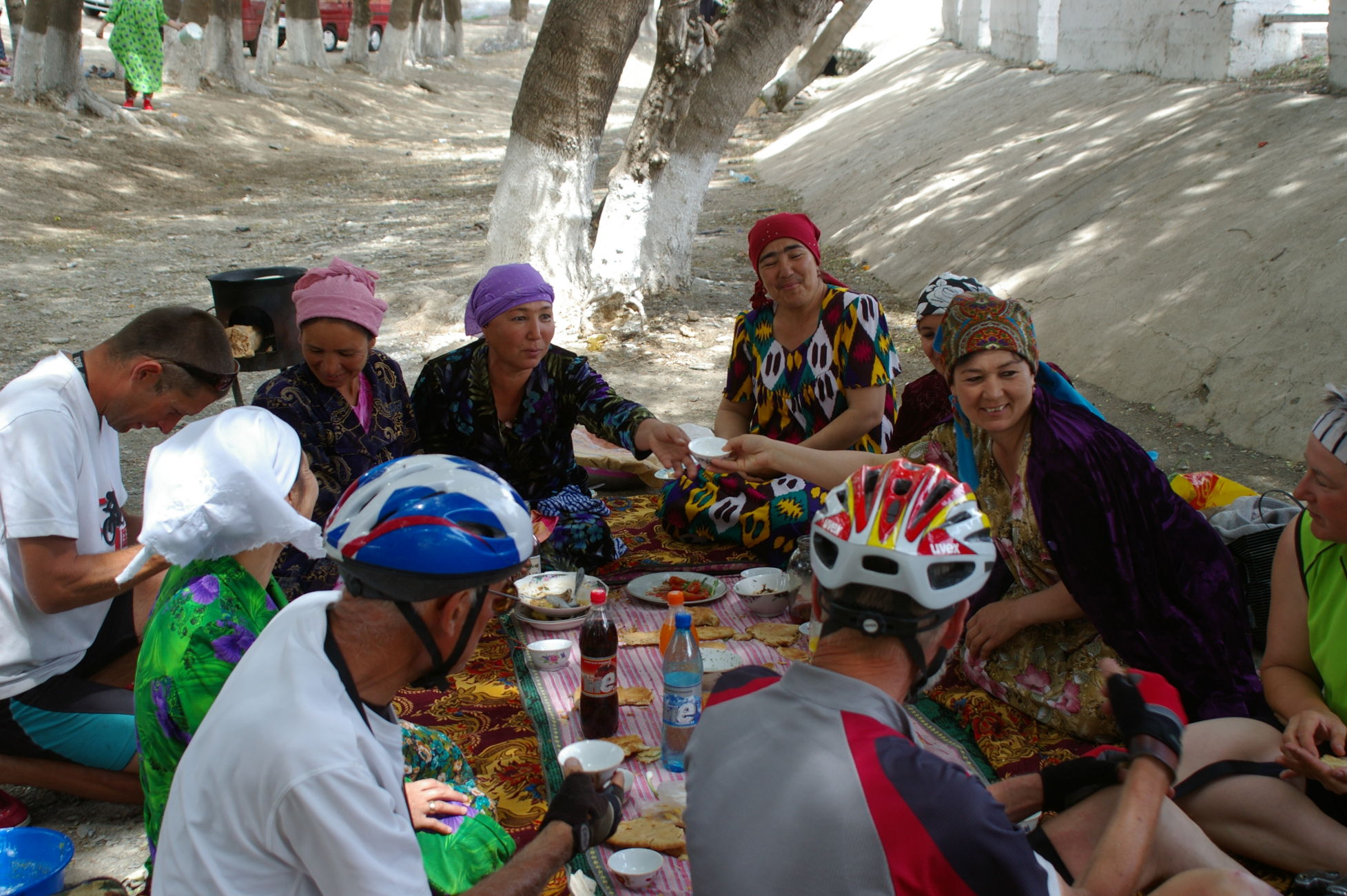Von dem kleinen See fahren wir weiter Richtung Samarkand in den Ort Nurata. Unterwegs halten wir an einem Basar, hier finden sich alle möglichen und unmöglichen Dinge zu kaufen. Ich finde eine schöne alte chinesische Fahrradklingel, die auch gleich montiert ist. Schon wie am Vortag bildet sich innerhalb kurzer Zeit ein richtiger Menschenauflauf, so das die Polizei gleich nervös wird. Nach langer Fahrt in der Ebene durch die Wüsten haben wir heute wieder mal ein bisschen Berg, der uns allen aber keine Probleme bereitet, weil das Wetter ist nicht so heiß und wir sind offensichtlich in bester Form. Die heutige Übernachtung ist in einem Privatquartier, in dem Ort gibt es kein Hotel. Weil das Wetter schön ist schlafen ein paar von uns einfach im Garten.