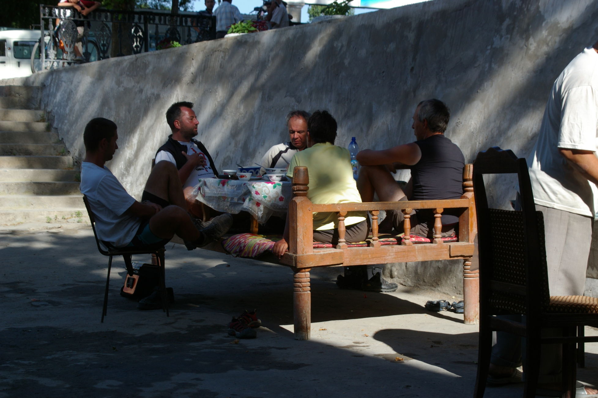 Der Grenzübertritt ist heute sehr zeitaufwendig. Der Grenzbeamte nimmt alles sehr genau, lässt sich das Bargeld, welches deklariert werden muss, vorzählen und meint unsere Gebäck sei eine besondere Gefahr für die usbekische Sicherheit. So vergehen einige Stunden, bis alle die Grenze passiert haben. Danach fahren wir ins Fagana Tal.