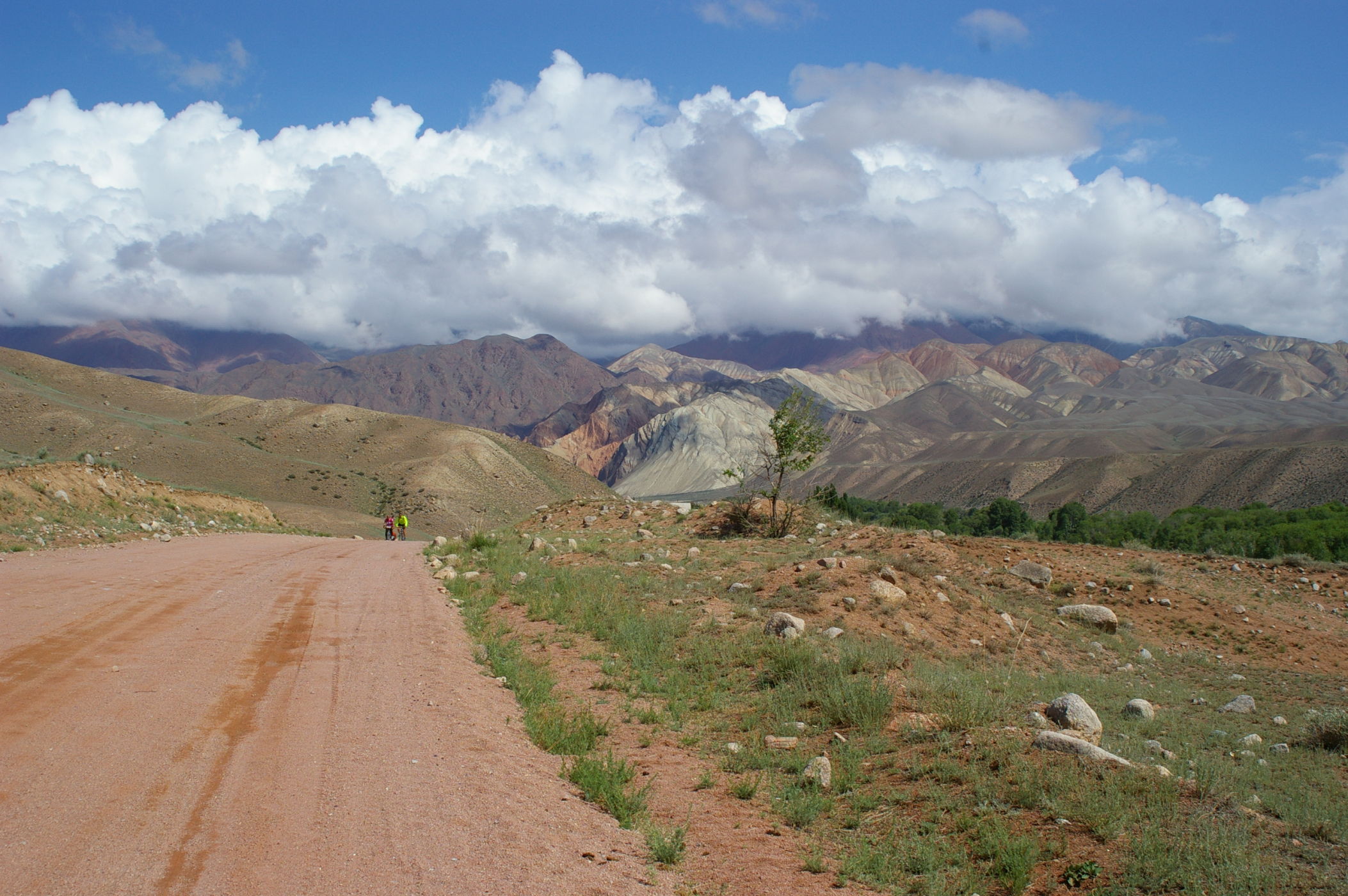 Nach einem leckeren Frühstück mit Spiegelei und selbstgemachter Brombermarmelade starten wir in Richtung Kyzart Pass. Anfangs ist es etwas mühsam, weil die Strasse ist eine wellige Schotterpiste. Doch auch heute sind wir von der Landschaft begeistert, auch das Wetter ist wieder perfekt, trotzdem es die ganze Nacht geregnet hatte. Zu Mittag sind wir etwas verwirrt, weil unsere Begleitfahrzeuge nicht kommen. Es stellt sich heraus, das der VW-Bus seinen Geist aufgegeben hat, und die beiden Fahrzeuge kommen schliesslich doch im Schlepptau. Wir fahren auf eine Höhe von 2300 Meter und schlagen wieder unser Zeltcamp auf.