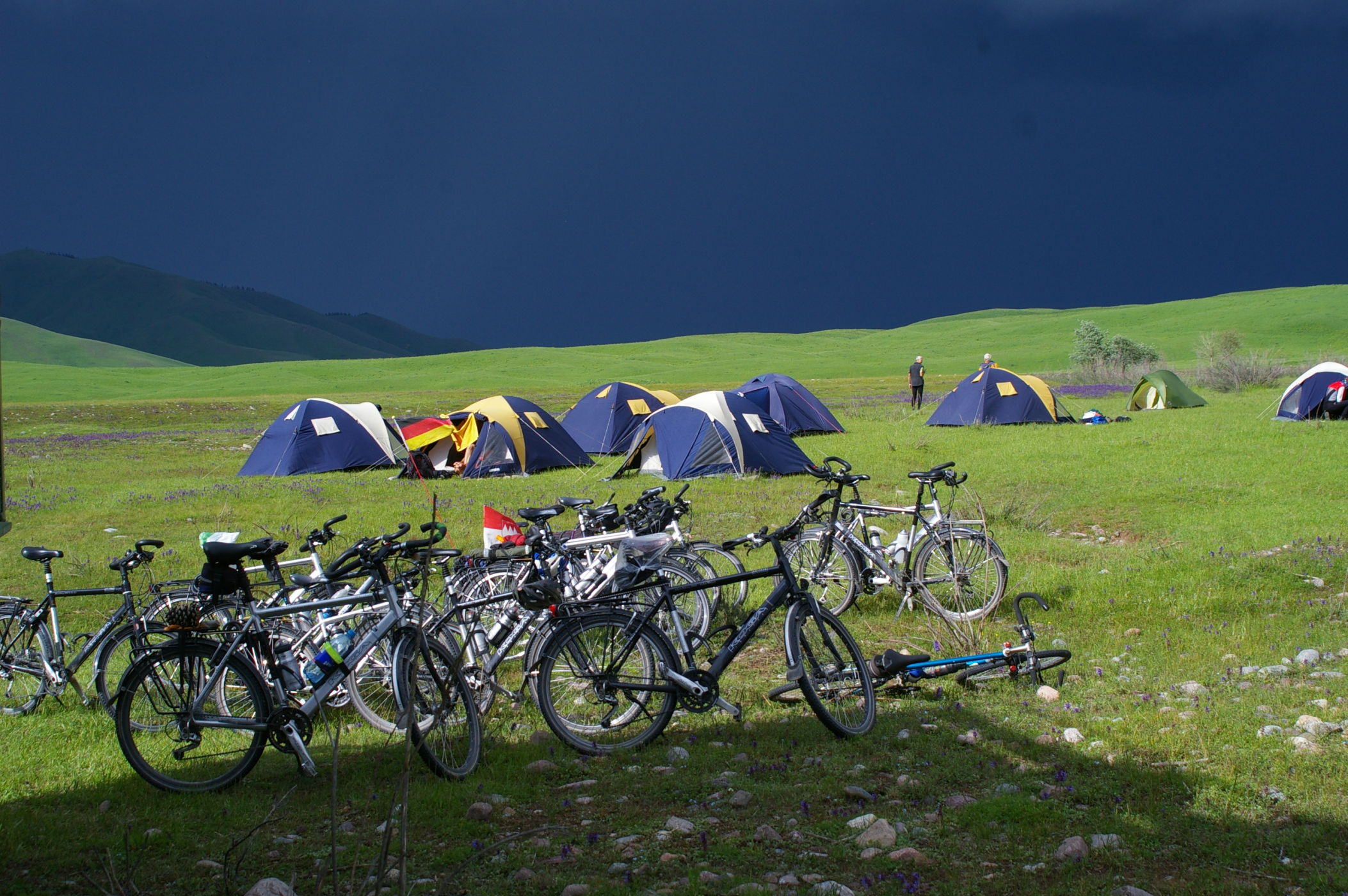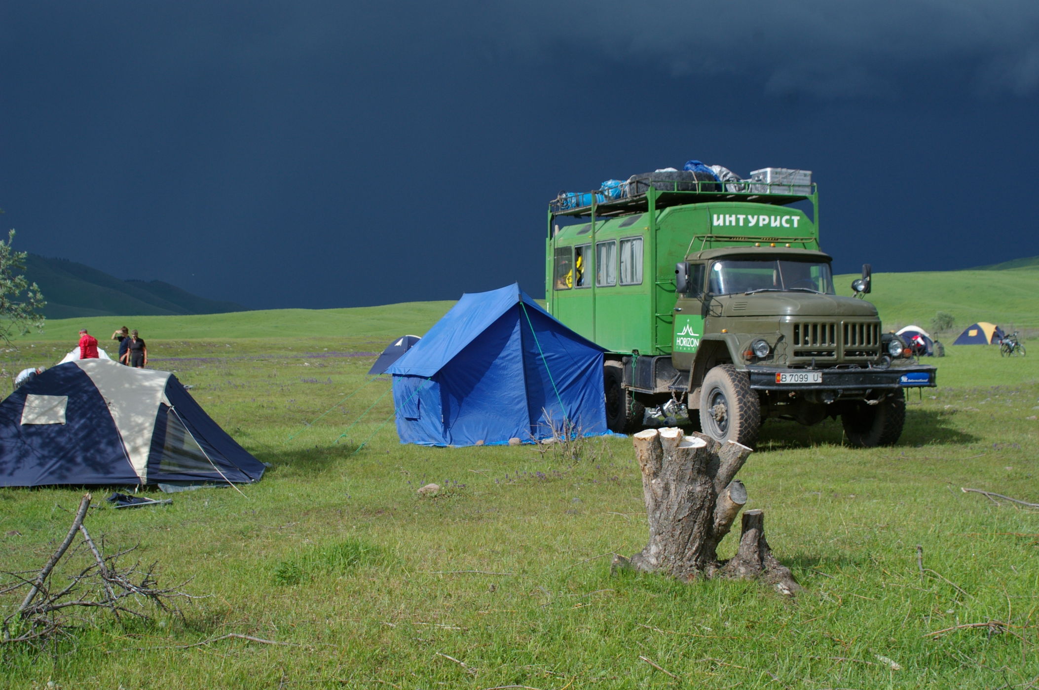 Nach den zwei Ruhetagen fahren wir bis knapp an die kasachische Grenze. Morgens scheint das Wetter perfekt, doch im Laude des Tages entwickeln sich Gewitter. Während der Fahrt flüchten wir in einen Viehunterstand, und können den Zeltplatz trocken erreichen. Nachdem die Zelte aufgestellt sind erreicht uns die nächste Gewitterfront, da bieten uns die Zelte aber schon Schutz.
