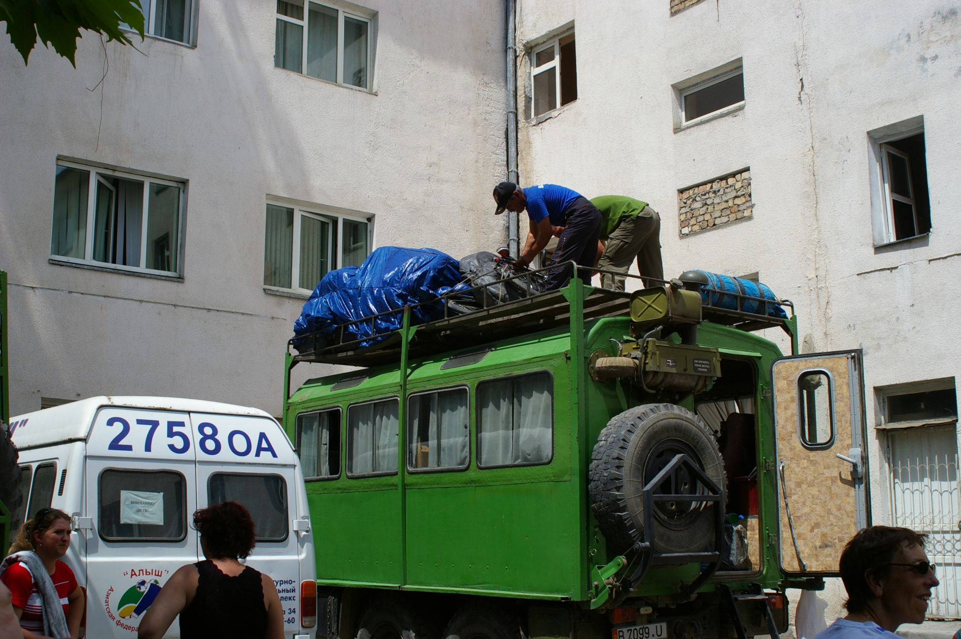 Vormittags haben wir noch einen halben Ruhetag, der Großteil der Gruppe sieht sich die Felszeichnungen an. Andere machen einen Bummel durch die Stadt oder einen Besuch in einem Internetkaffee. Ich hatte Glück und konnte in einem Internetkaffee meine Webseite in 15 Minuten auf den letzten Stand bringen. Die Fahrt zum Zielort am Nachmittag gibt uns die ersten Eindrücke von Kirgistan. Diese sind durchwegs besser als erwartet, wir hatten auch ein eher rückständiges Land erwartet und wurden eines besseren belehrt. Wir finden einen netten Zeltplatz im Grünen.