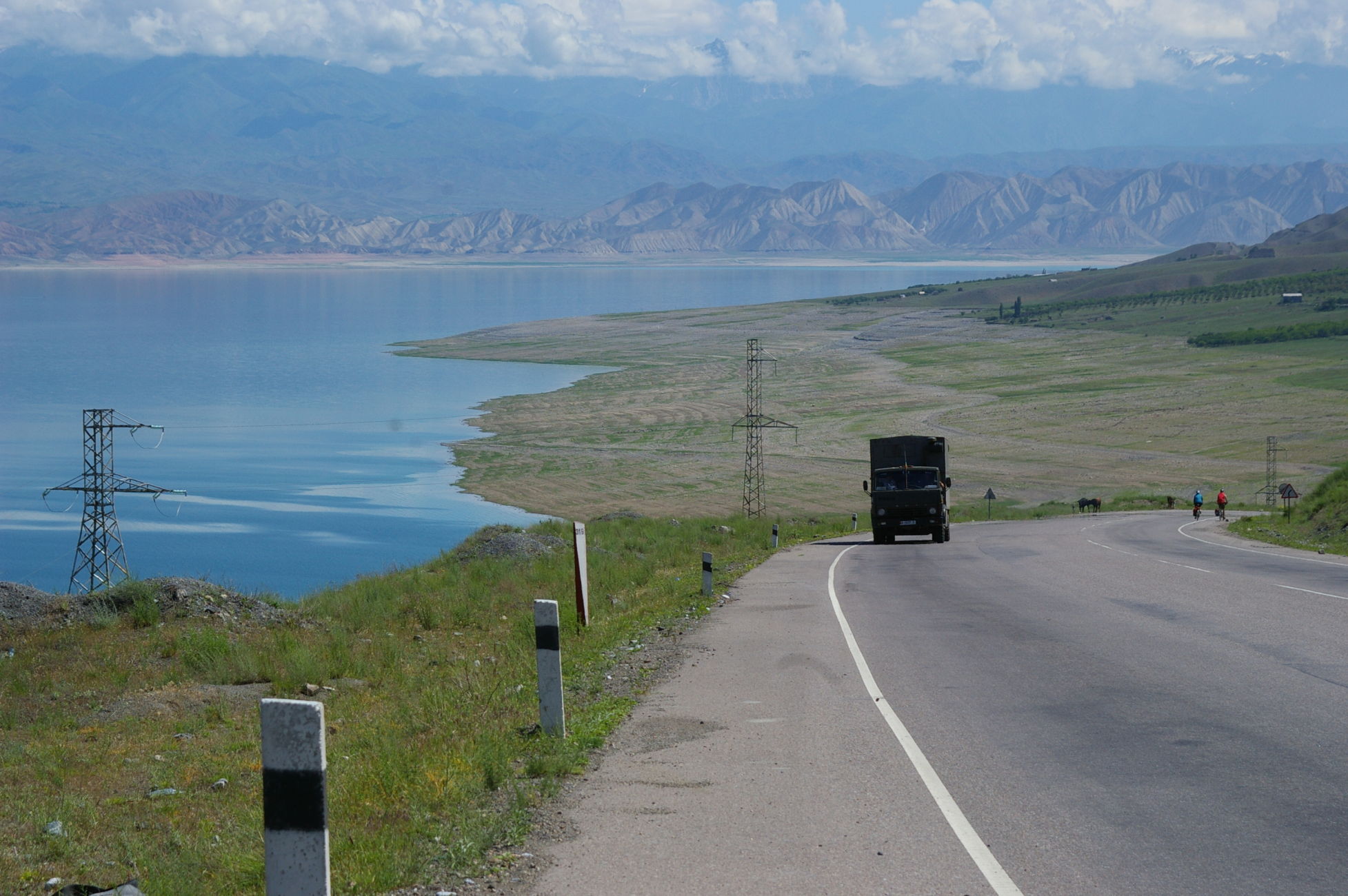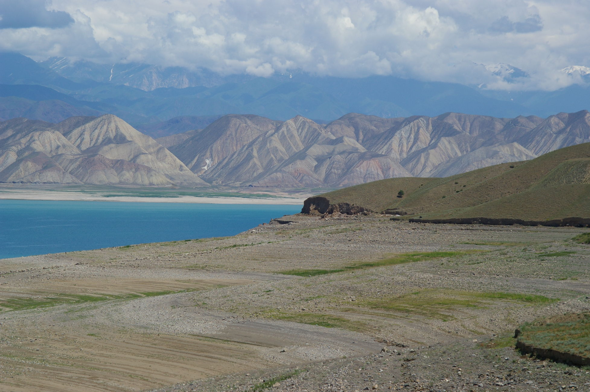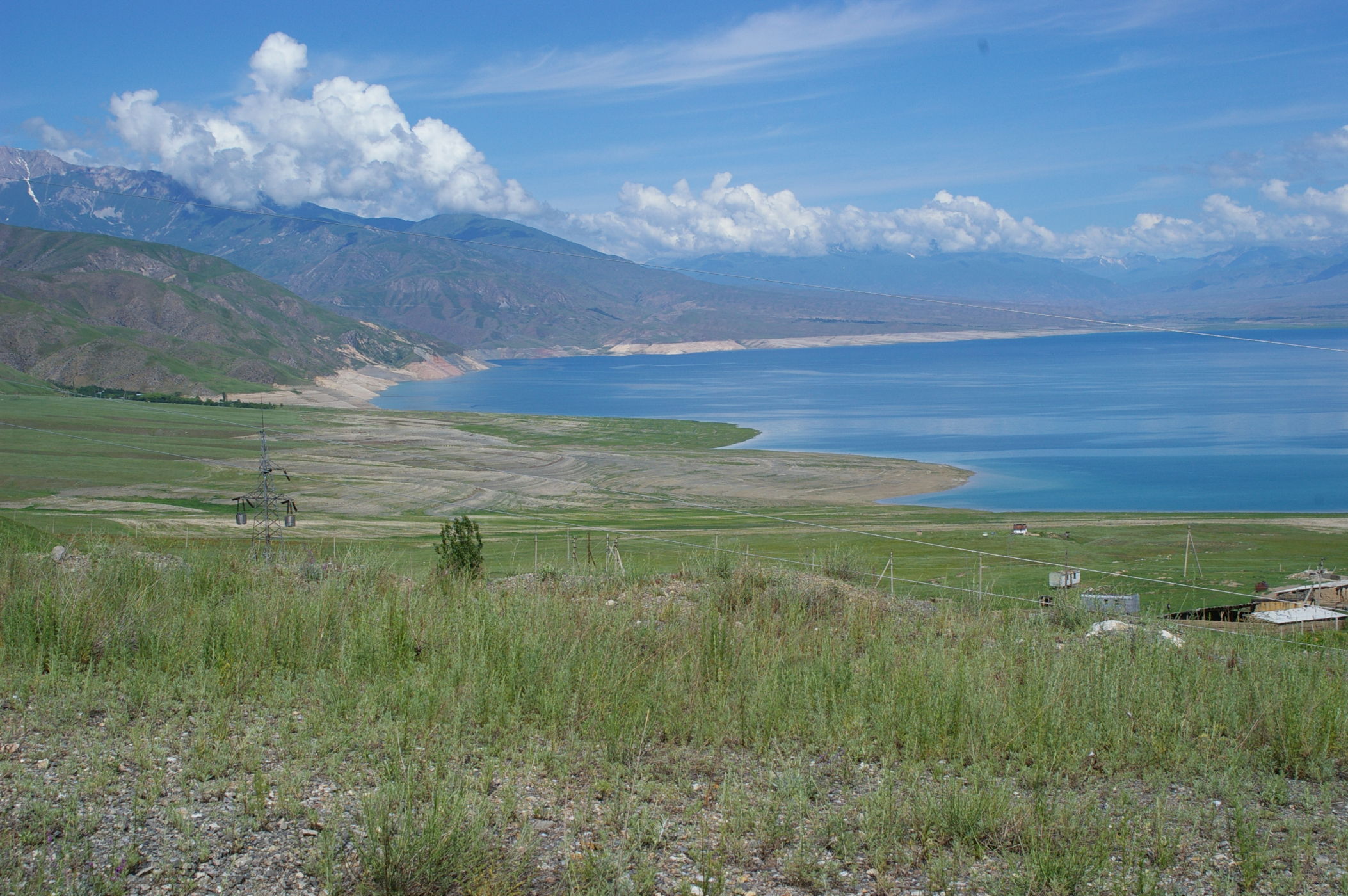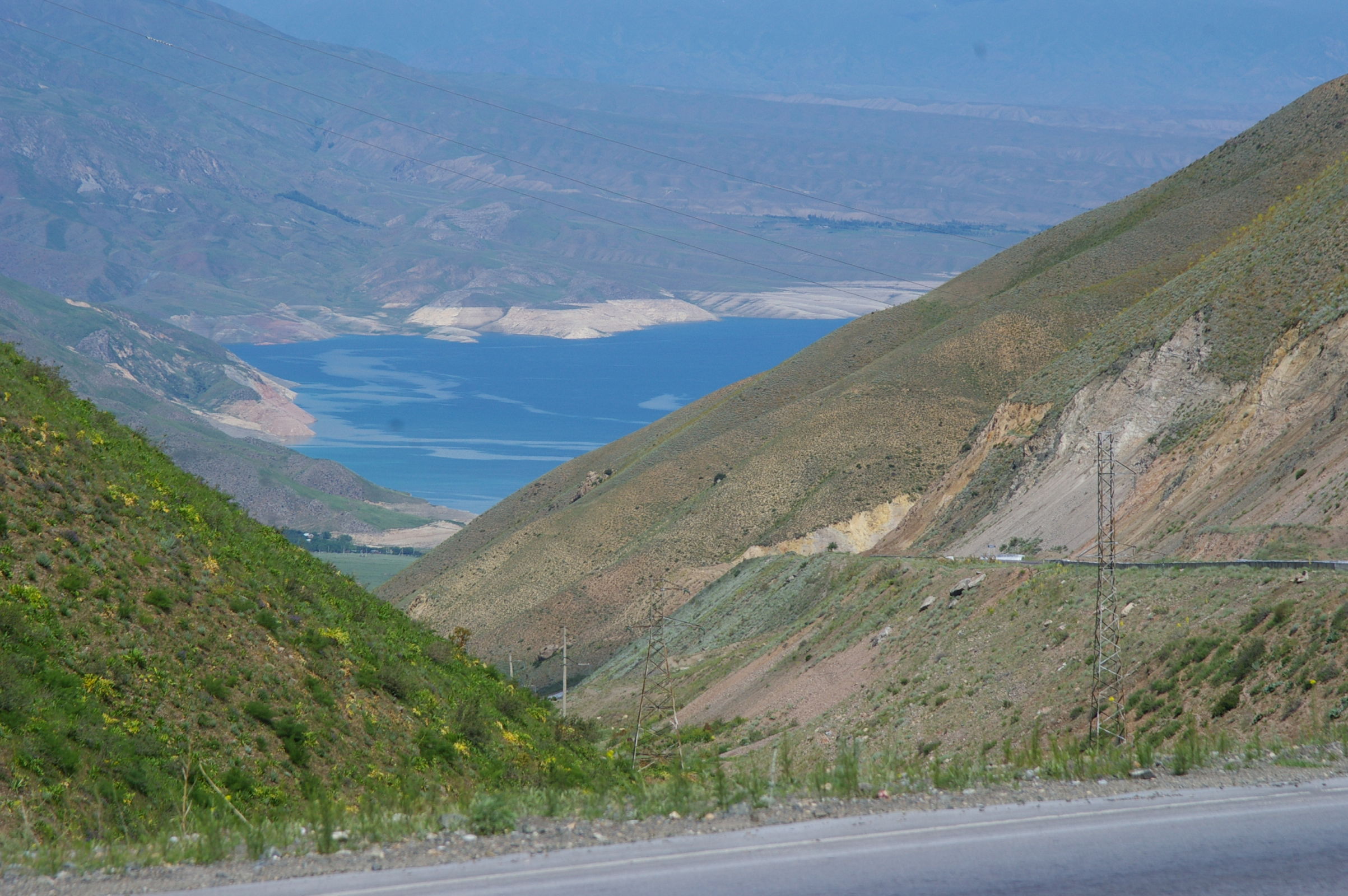 Heute war ein genialer Tag: schönes Wetter, super Landschaft, interessante Strecke mit einem kleinen Paß dazwischen. Von der Passhöhe aus können wir fast den ganzen Stausee überblicken. Dieser scheint momentan sehr wenig Wasser zu führen. Auch können wir das Ziel des nächsten Tages schon ausmachen, weil die Route entlang des Stausees auf die gegenüberliegende Seite führt. Wir fahren heute in kleineren Gruppen, das ist ganz angenehm. Die Übernachtungsstelle ist ein Zeltplatz direkt am Fluss. Ich stelle mein Zelt direkt an den Fluss in den Sand, ein Gefühl wie am Meer.