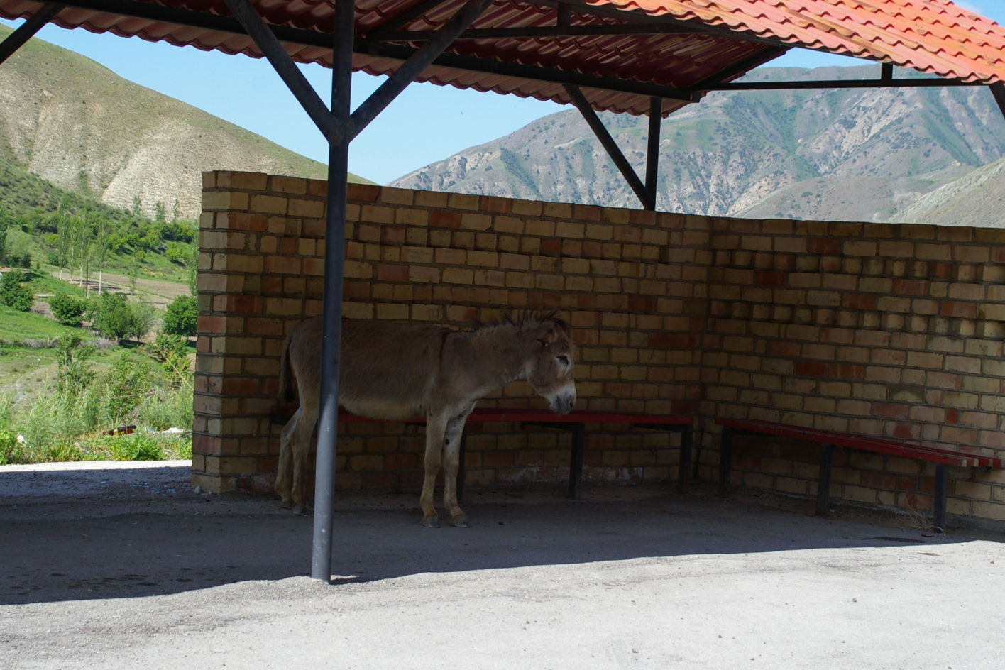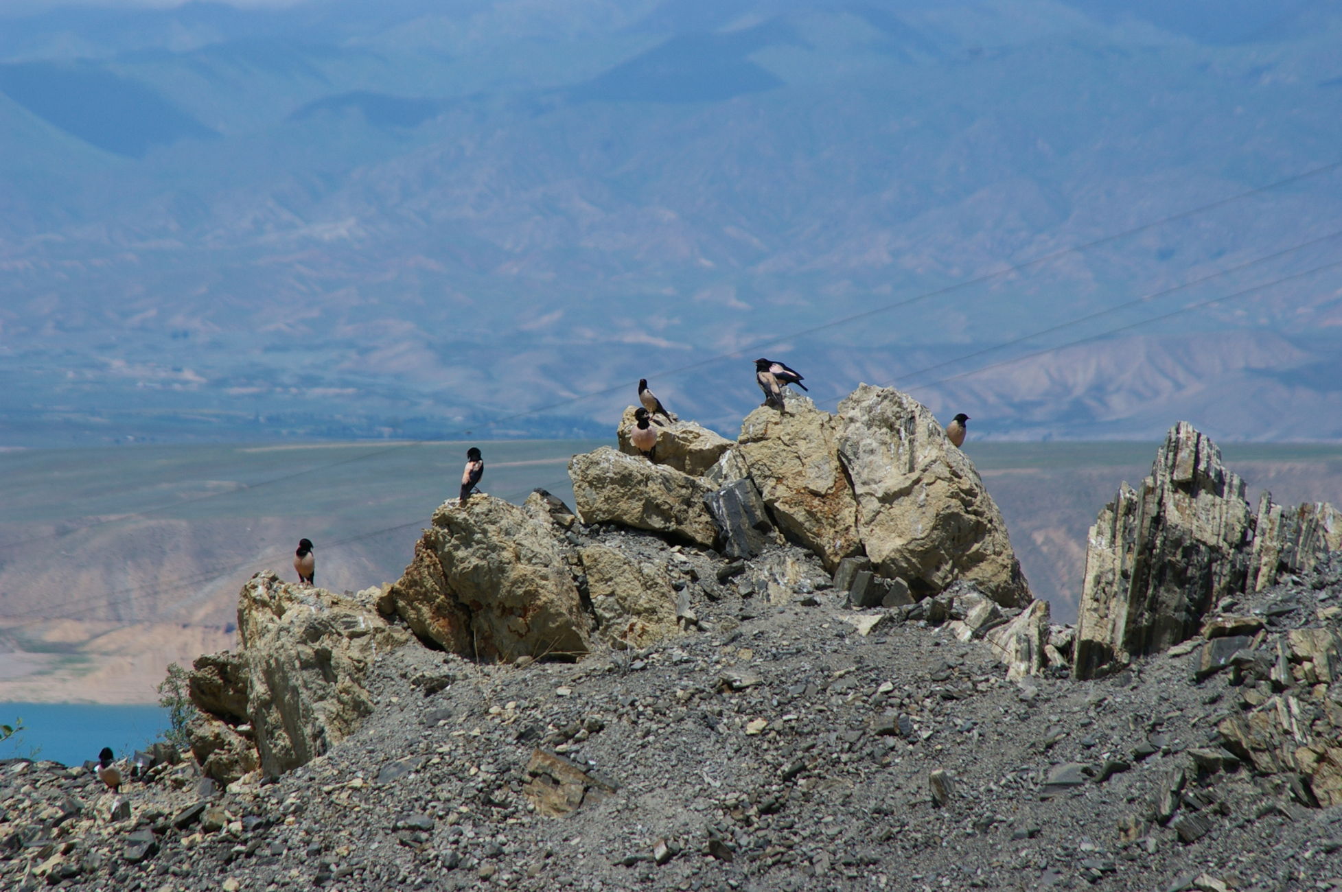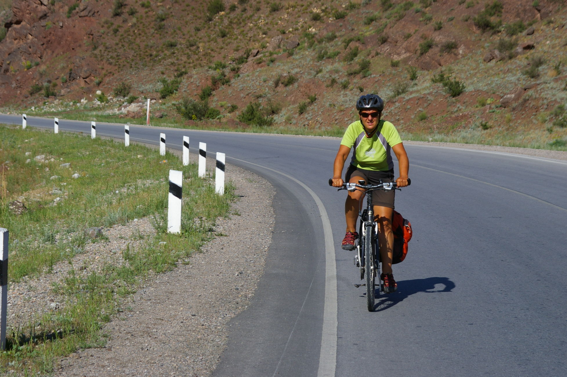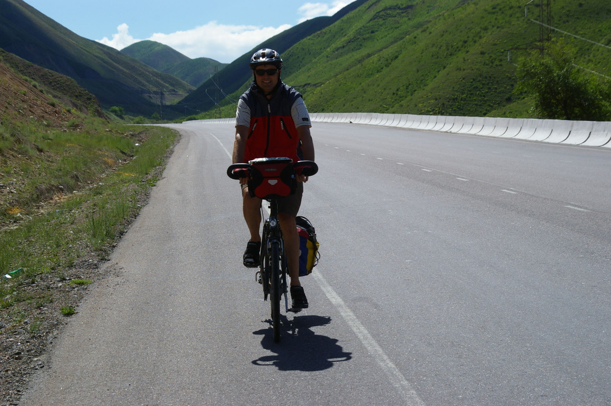 Heute war ein genialer Tag: schönes Wetter, super Landschaft, interessante Strecke mit einem kleinen Paß dazwischen. Von der Passhöhe aus können wir fast den ganzen Stausee überblicken. Dieser scheint momentan sehr wenig Wasser zu führen. Auch können wir das Ziel des nächsten Tages schon ausmachen, weil die Route entlang des Stausees auf die gegenüberliegende Seite führt. Wir fahren heute in kleineren Gruppen, das ist ganz angenehm. Die Übernachtungsstelle ist ein Zeltplatz direkt am Fluss. Ich stelle mein Zelt direkt an den Fluss in den Sand, ein Gefühl wie am Meer.