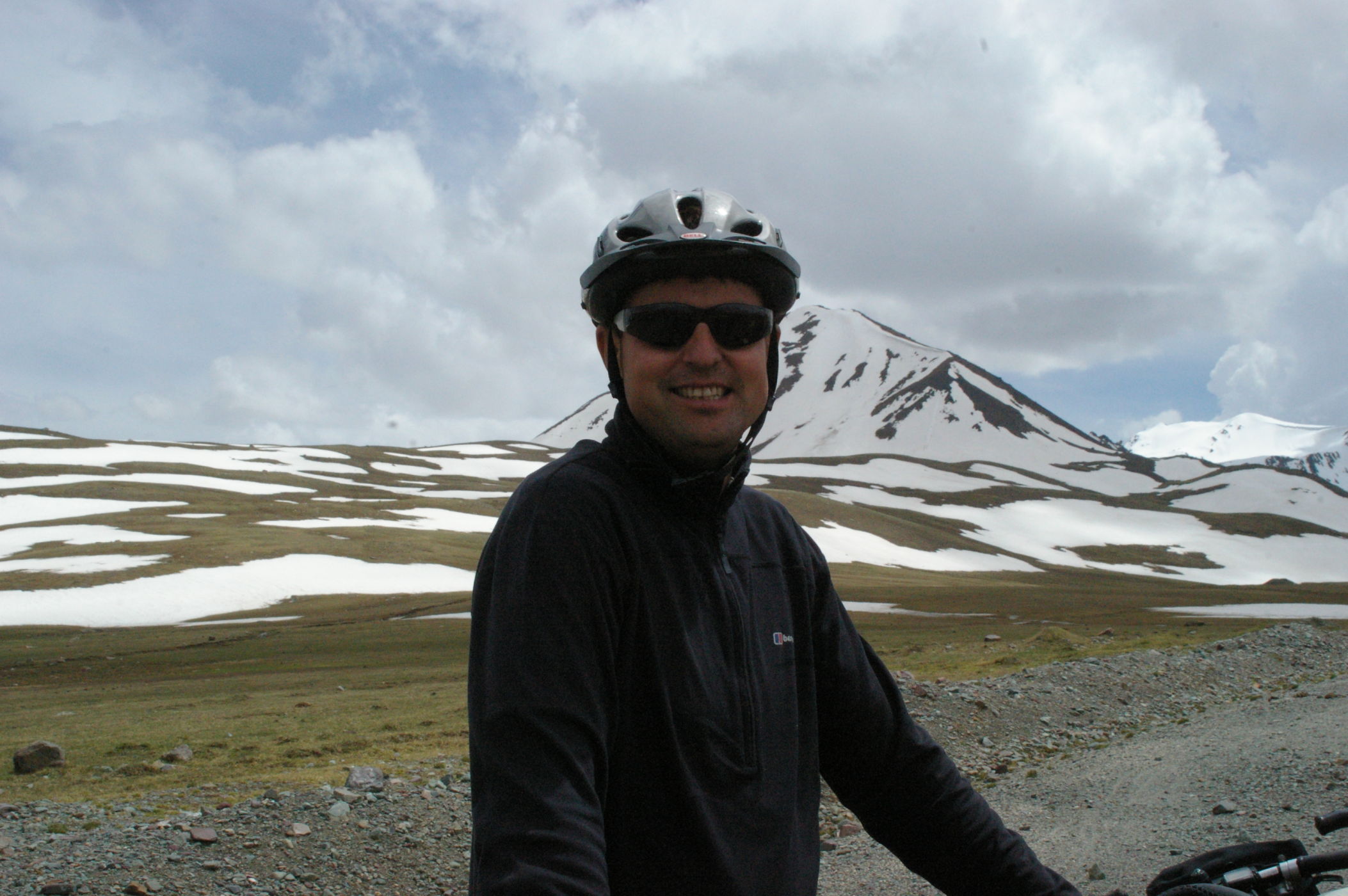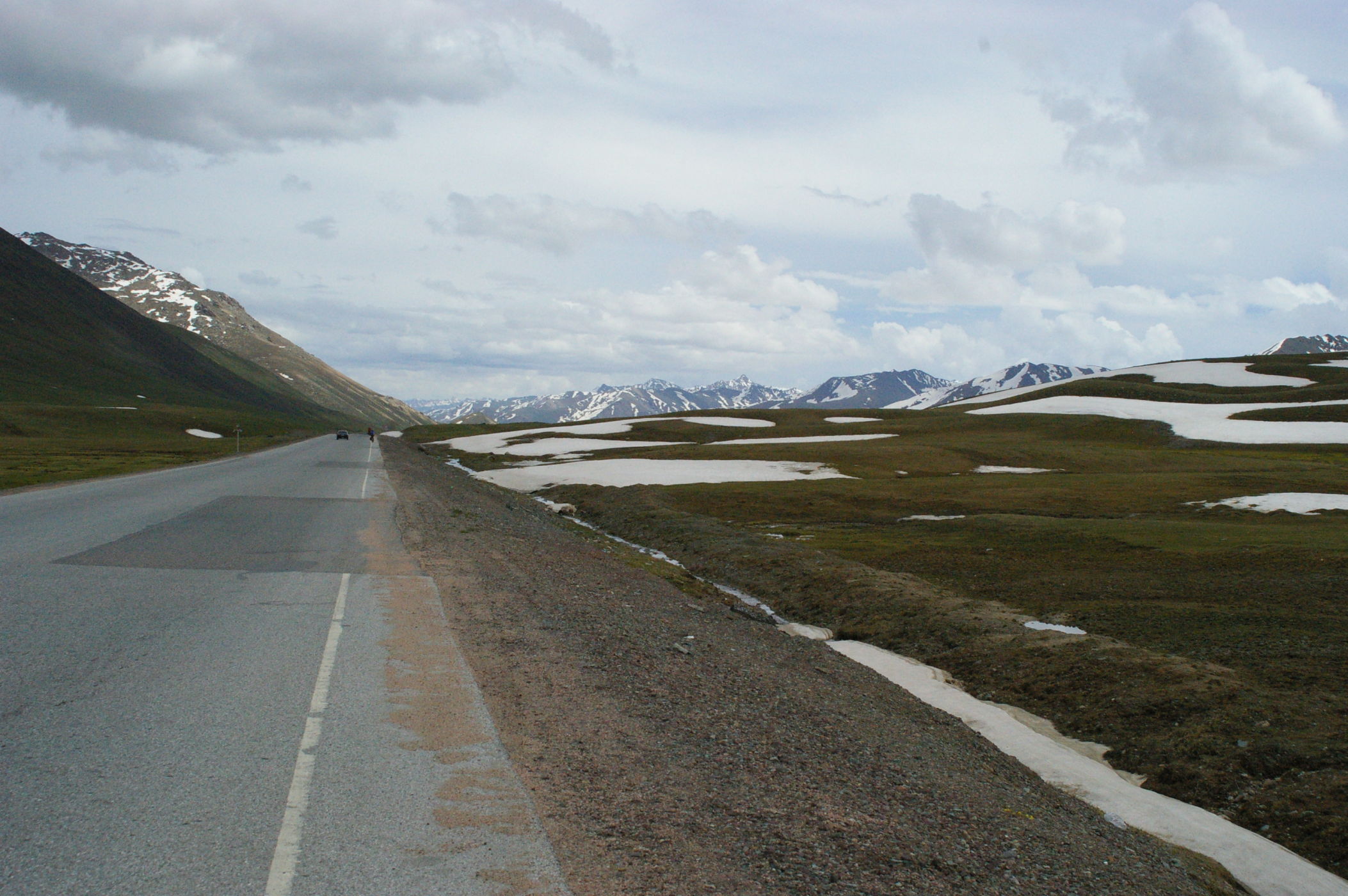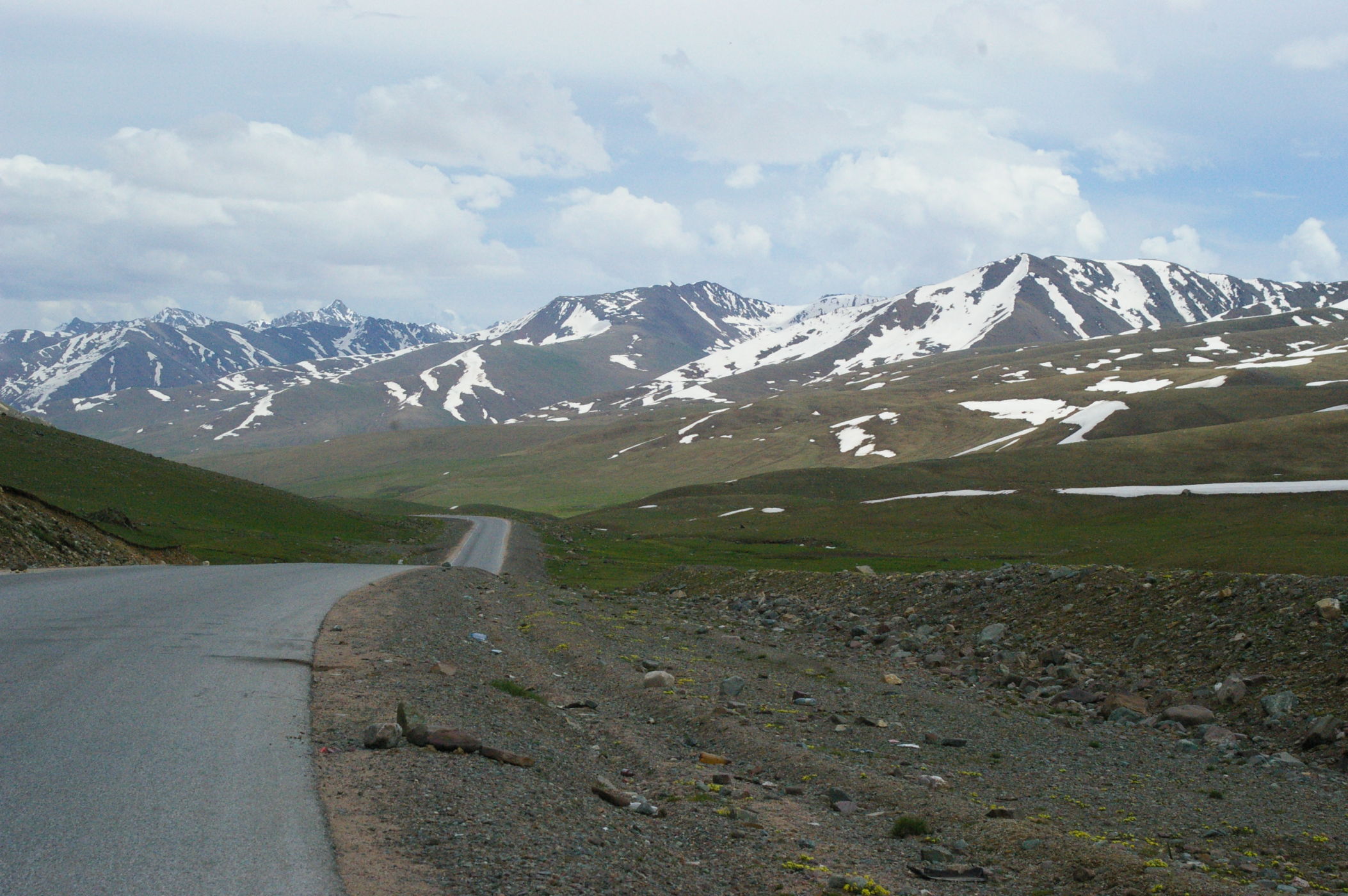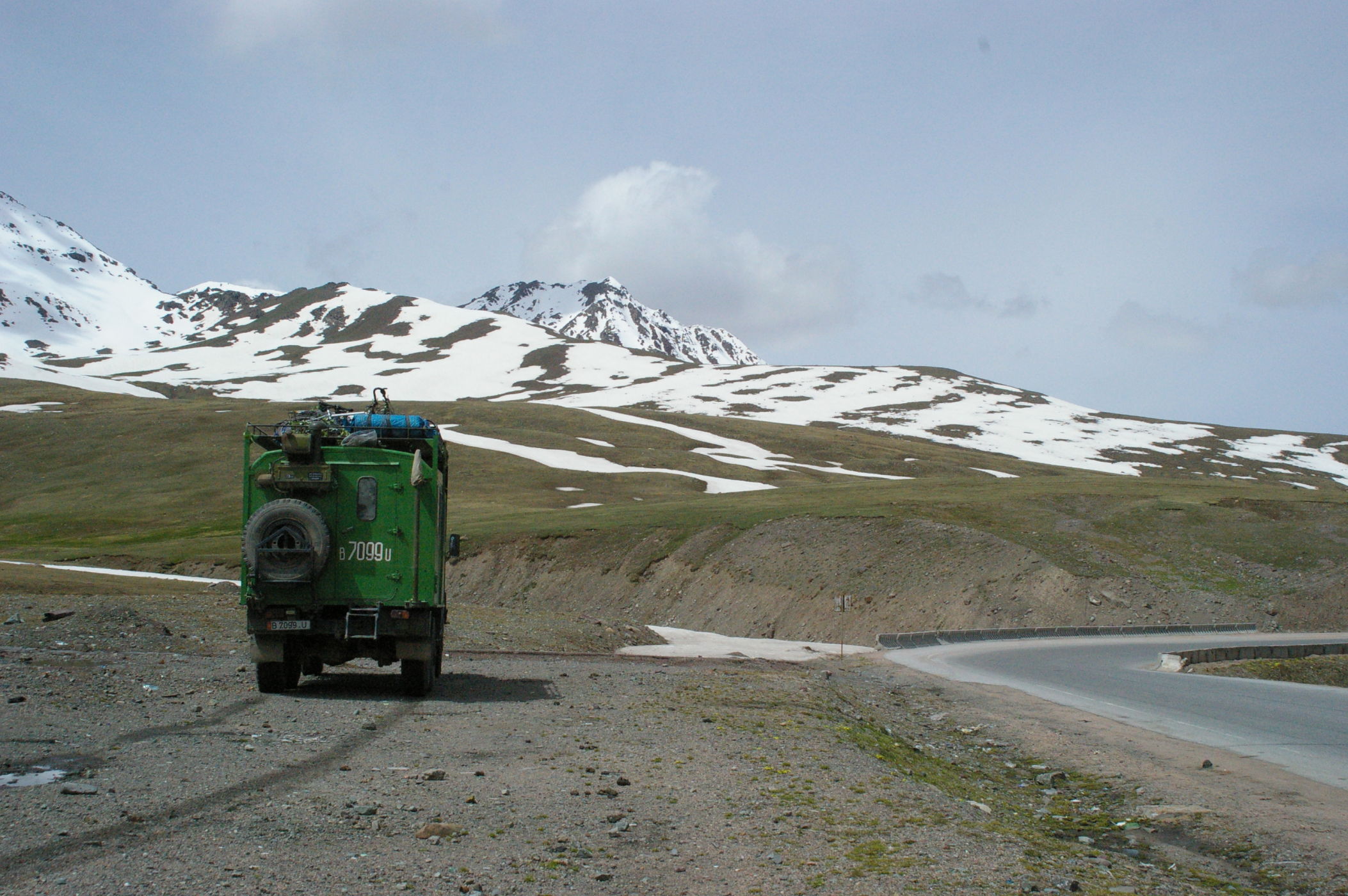 Der Pass auf 3178 m ist ganz anders als der letzte Pass in Tatschikistan. Es führt eine perfekte Strasse mit leichter Steigung den Berg hoch. Keine wilden Schluchten und keine gefährlichen Engpässe, dafür eine grossartige Landschaft. Ausserdem nutzen einige von uns ganz unsportlich langsam fahrende LKW's als Lift. Auf der Passhöhe haben wir unser Picknick umgeben von schneebedeckten Bergen. Die Abfahrt ist eine wirkliches Erlebniss, endlose fast unberührte Landschaft, nur ein paar Zelte und bestes Wetter. Da gibt es viel zu sehen, die Fotos können da nur einen blassen Eindrück vermitteln. Am Abend haben wir wieder einen schönen Zeltplatz, die Stimmung in der Gruppe ist nach diesem schönen Tag bestens.