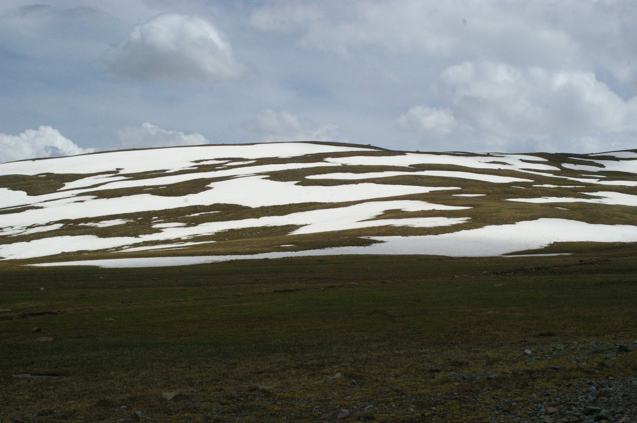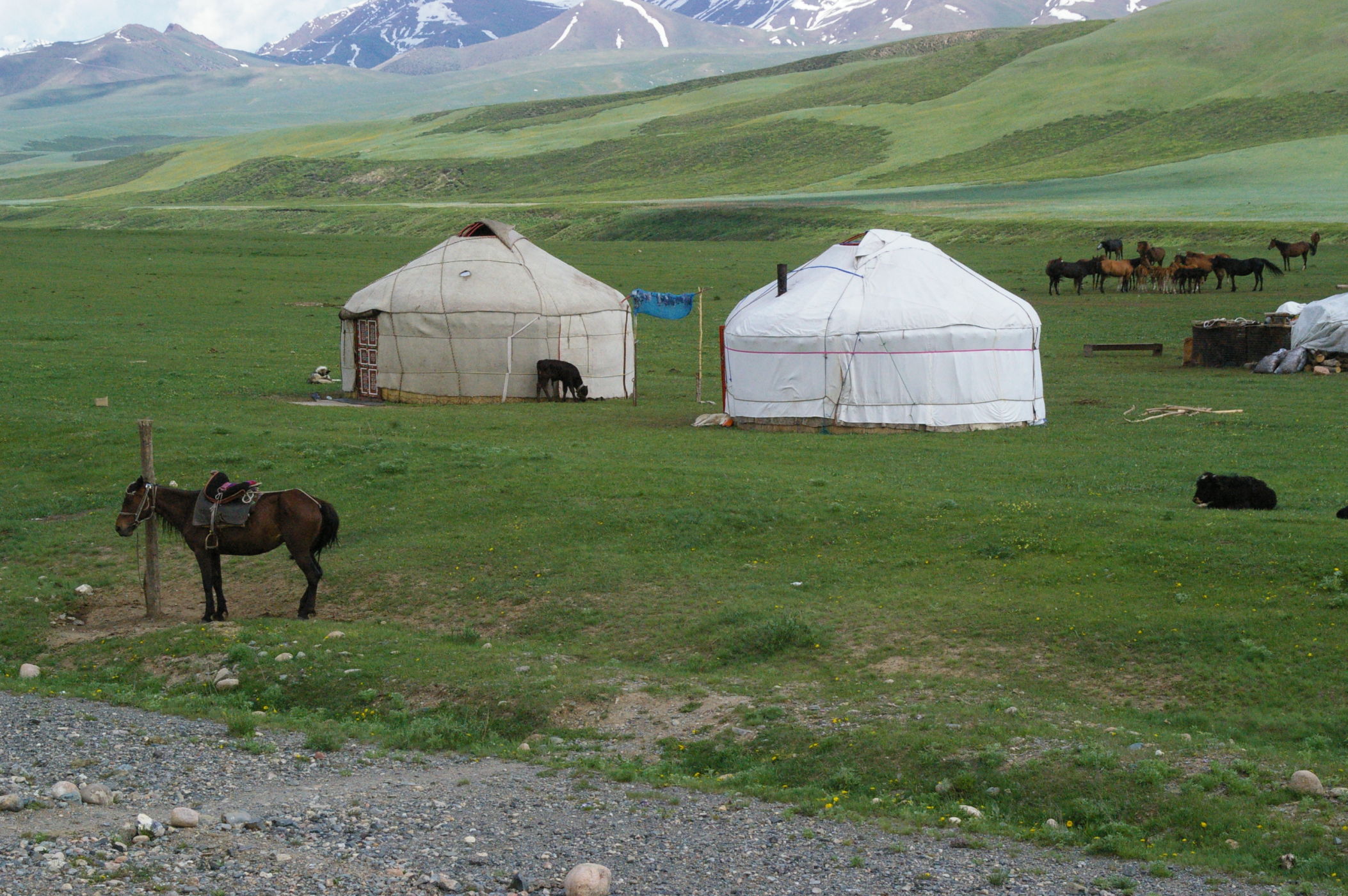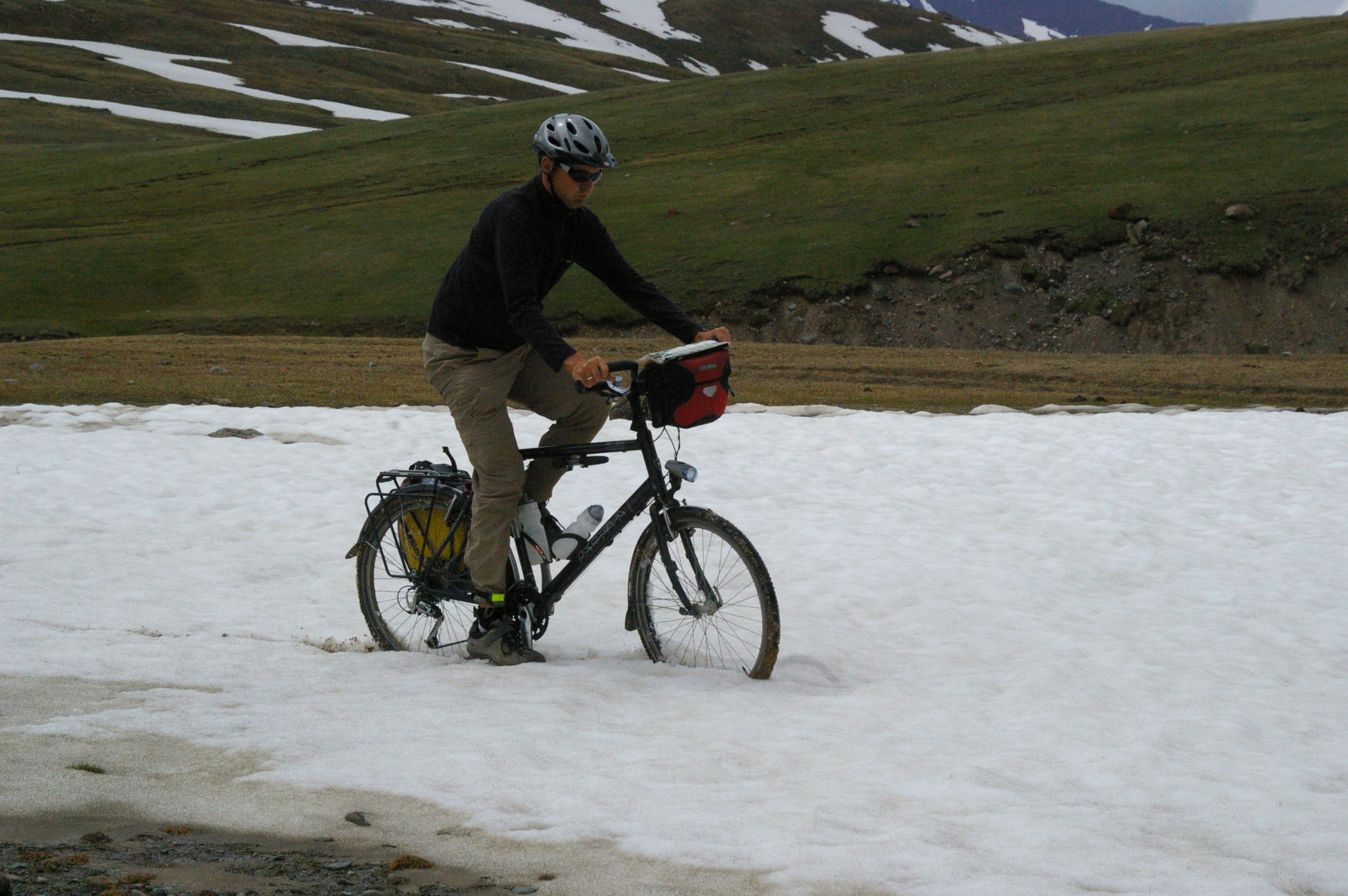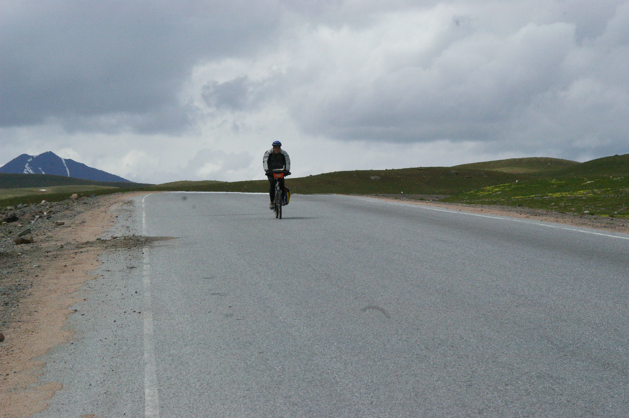 Der Pass auf 3178 m ist ganz anders als der letzte Pass in Tatschikistan. Es führt eine perfekte Strasse mit leichter Steigung den Berg hoch. Keine wilden Schluchten und keine gefährlichen Engpässe, dafür eine grossartige Landschaft. Ausserdem nutzen einige von uns ganz unsportlich langsam fahrende LKW's als Lift. Auf der Passhöhe haben wir unser Picknick umgeben von schneebedeckten Bergen. Die Abfahrt ist eine wirkliches Erlebniss, endlose fast unberührte Landschaft, nur ein paar Zelte und bestes Wetter. Da gibt es viel zu sehen, die Fotos können da nur einen blassen Eindrück vermitteln. Am Abend haben wir wieder einen schönen Zeltplatz, die Stimmung in der Gruppe ist nach diesem schönen Tag bestens.