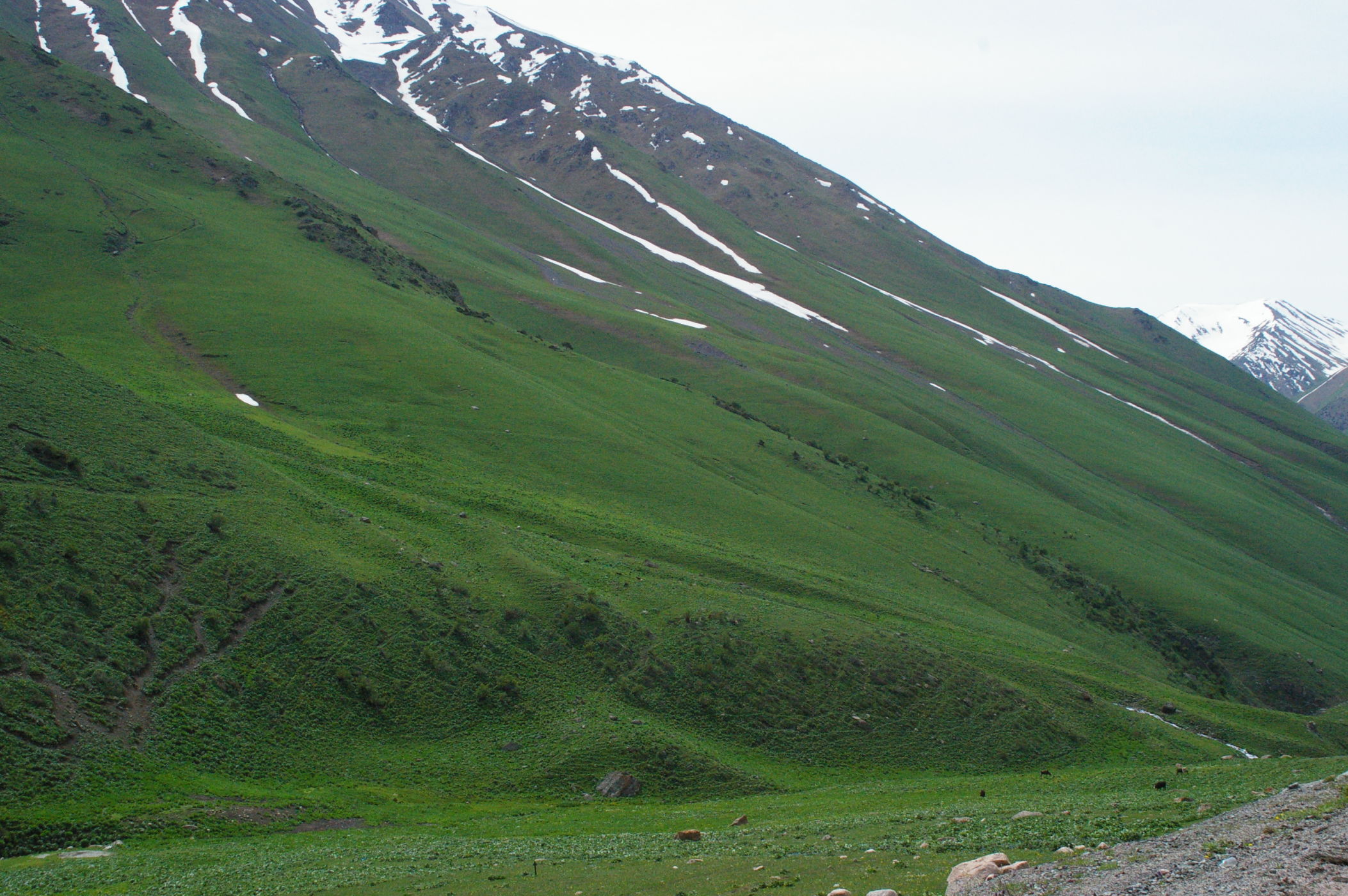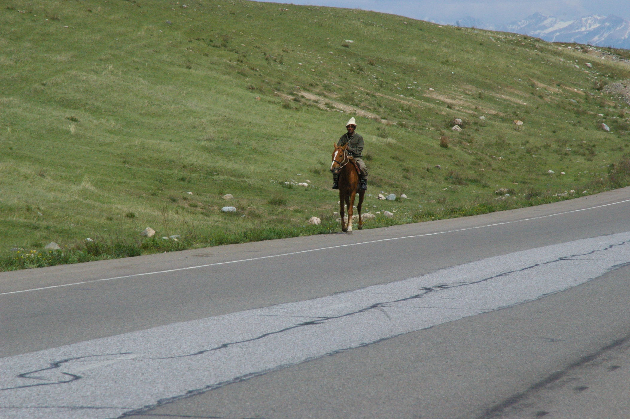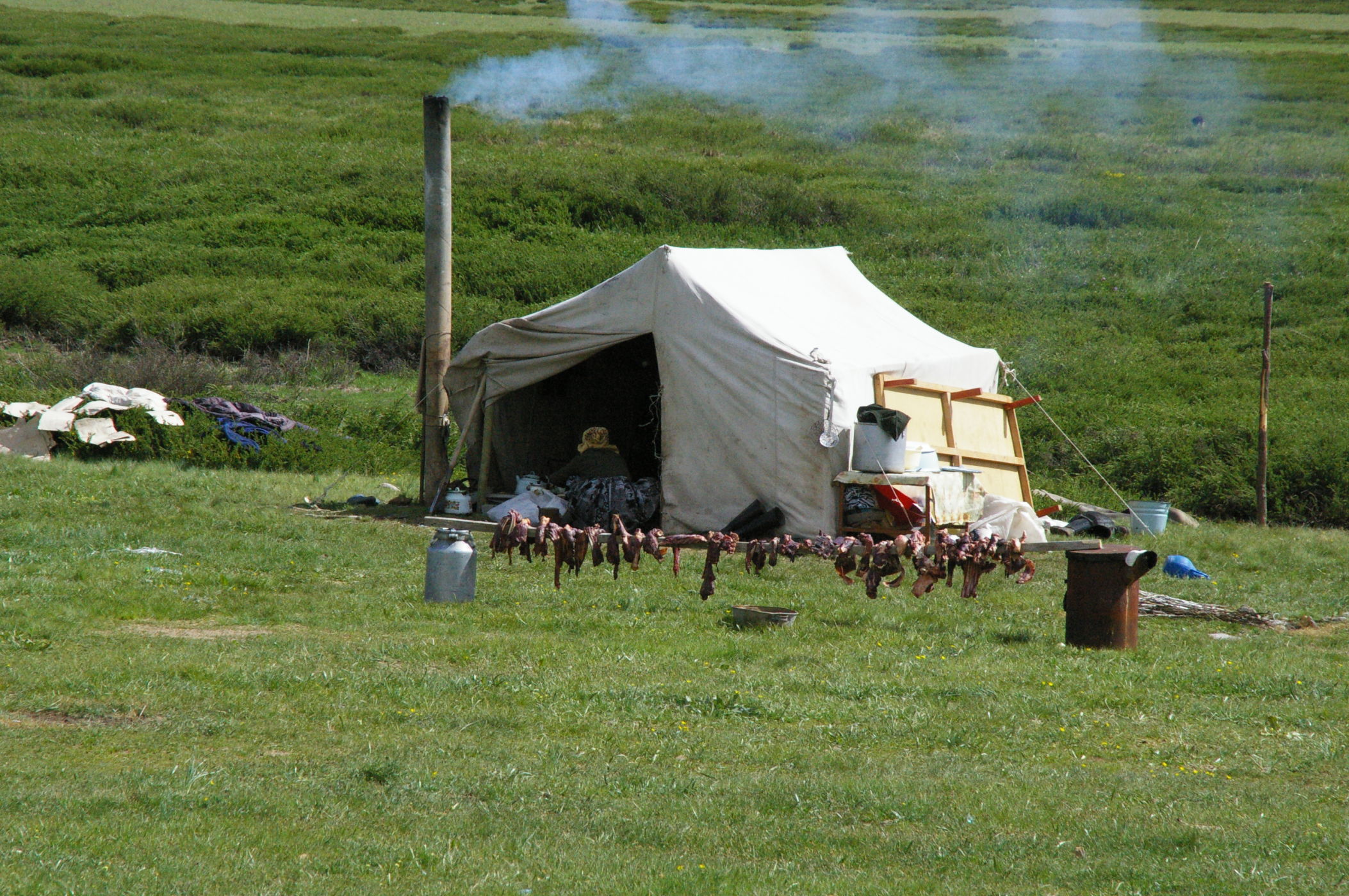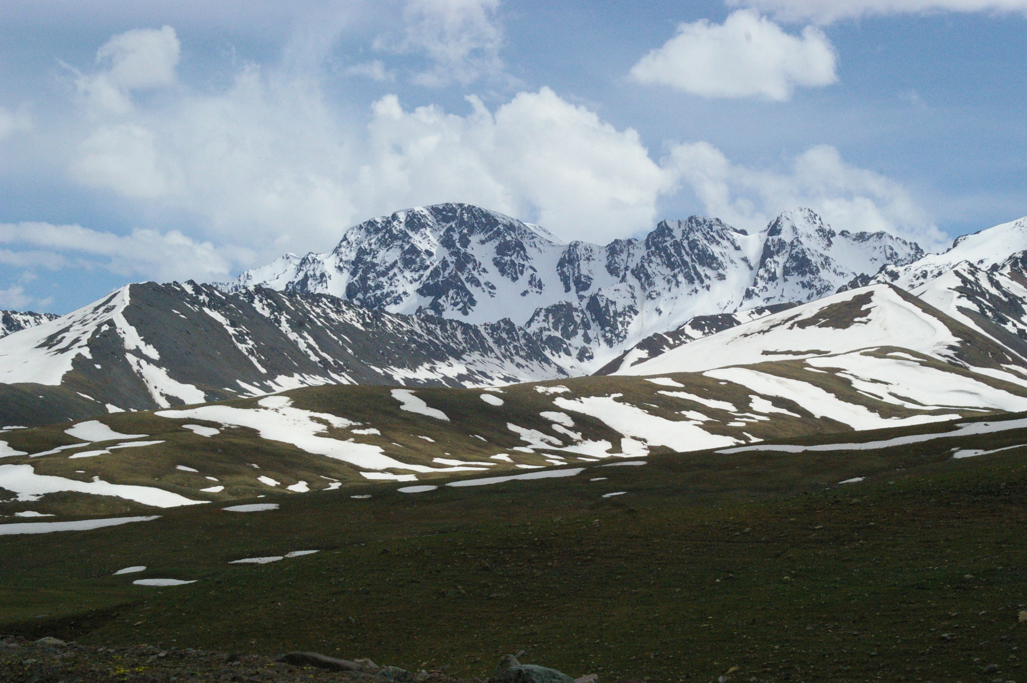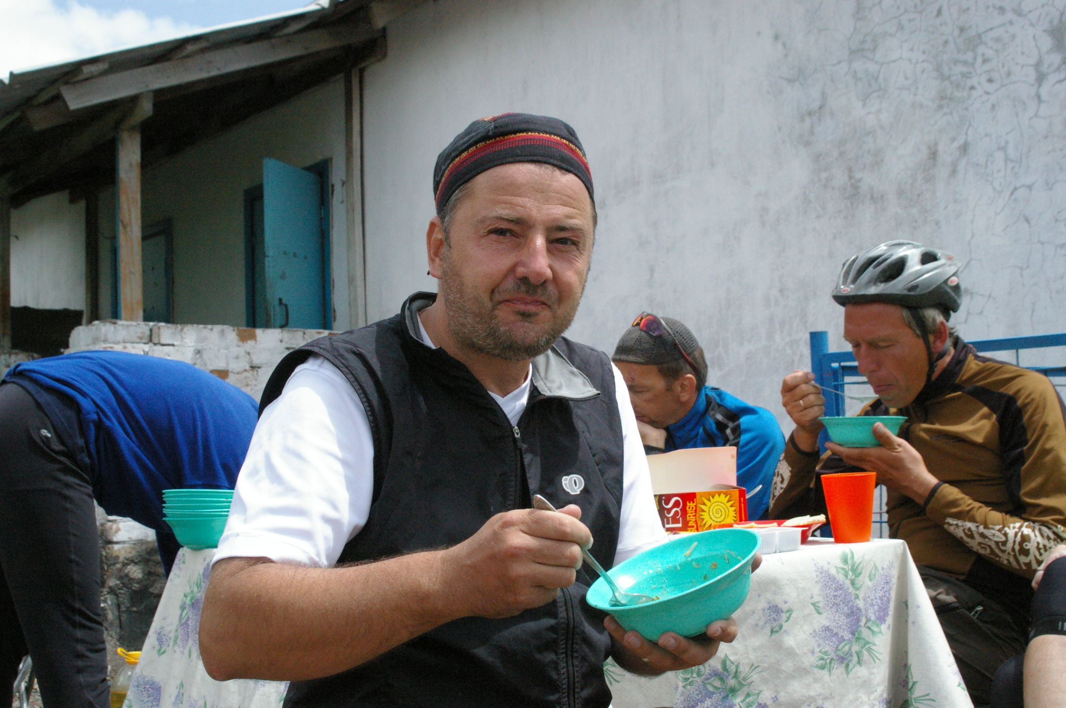Der Pass auf 3178 m ist ganz anders als der letzte Pass in Tatschikistan. Es führt eine perfekte Strasse mit leichter Steigung den Berg hoch. Keine wilden Schluchten und keine gefährlichen Engpässe, dafür eine grossartige Landschaft. Ausserdem nutzen einige von uns ganz unsportlich langsam fahrende LKW's als Lift. Auf der Passhöhe haben wir unser Picknick umgeben von schneebedeckten Bergen. Die Abfahrt ist eine wirkliches Erlebniss, endlose fast unberührte Landschaft, nur ein paar Zelte und bestes Wetter. Da gibt es viel zu sehen, die Fotos können da nur einen blassen Eindrück vermitteln. Am Abend haben wir wieder einen schönen Zeltplatz, die Stimmung in der Gruppe ist nach diesem schönen Tag bestens.