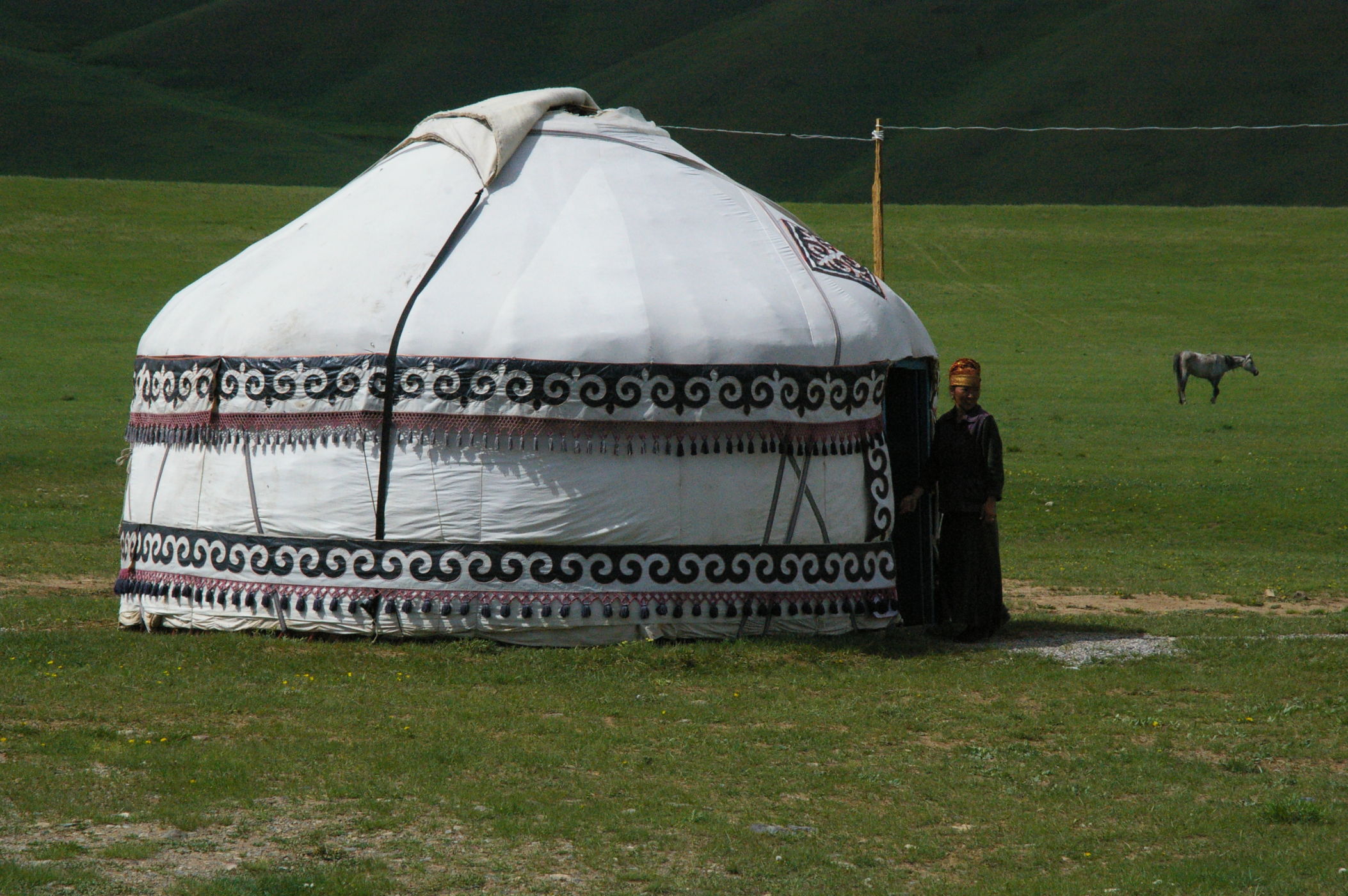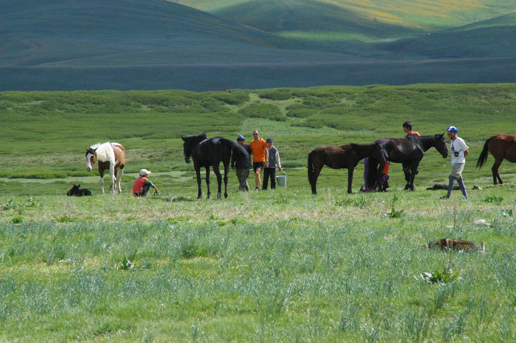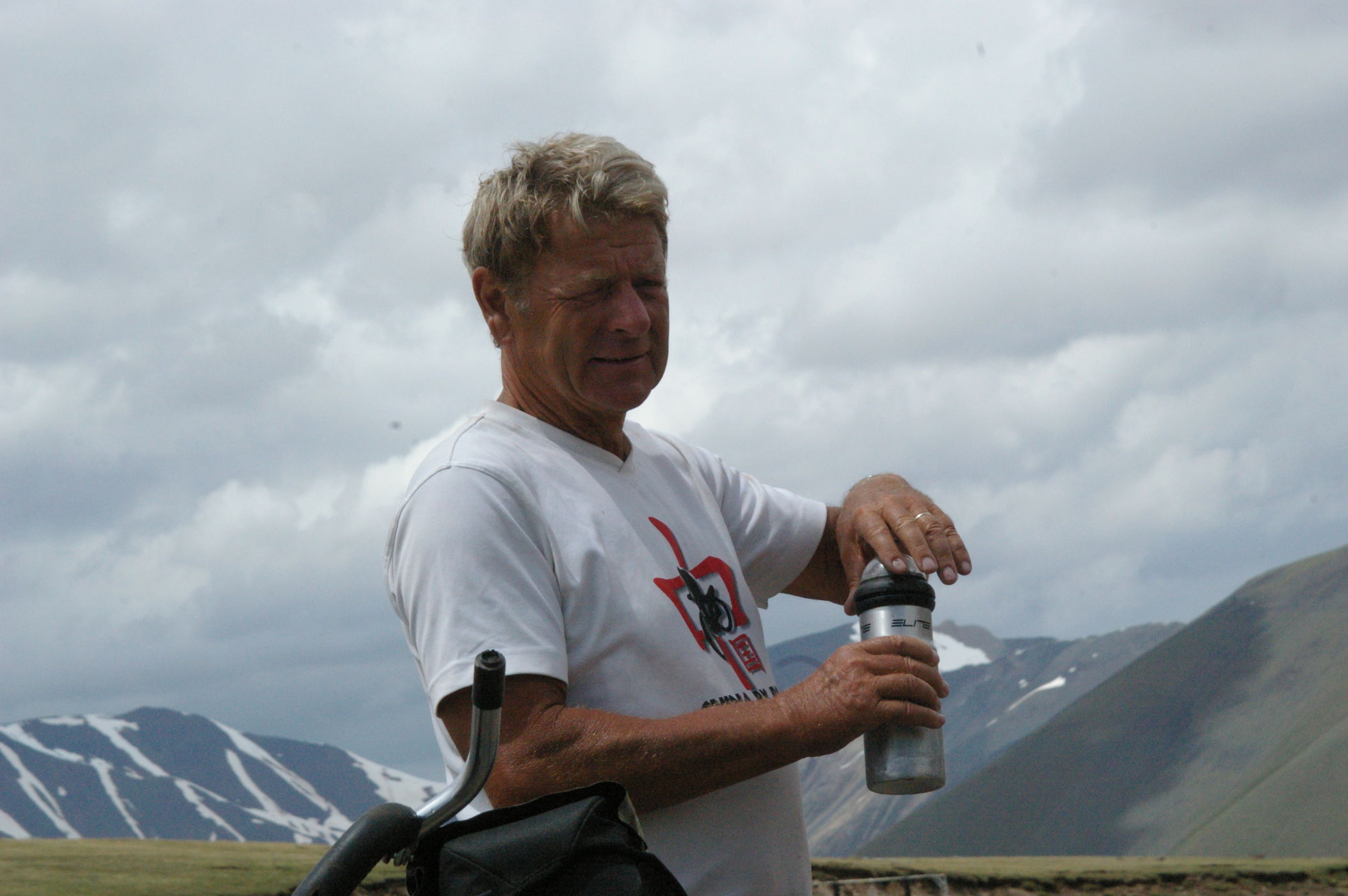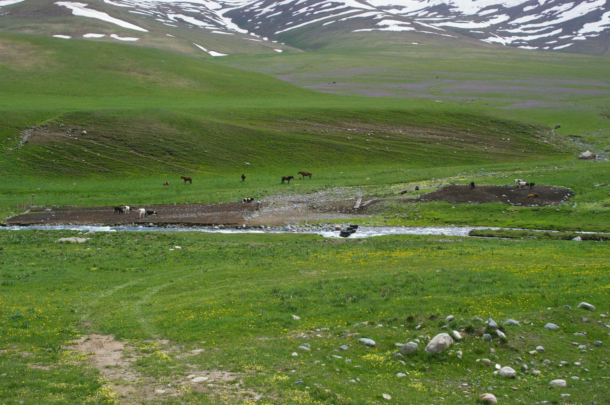 Der Pass auf 3178 m ist ganz anders als der letzte Pass in Tatschikistan. Es führt eine perfekte Strasse mit leichter Steigung den Berg hoch. Keine wilden Schluchten und keine gefährlichen Engpässe, dafür eine grossartige Landschaft. Ausserdem nutzen einige von uns ganz unsportlich langsam fahrende LKW's als Lift. Auf der Passhöhe haben wir unser Picknick umgeben von schneebedeckten Bergen. Die Abfahrt ist eine wirkliches Erlebniss, endlose fast unberührte Landschaft, nur ein paar Zelte und bestes Wetter. Da gibt es viel zu sehen, die Fotos können da nur einen blassen Eindrück vermitteln. Am Abend haben wir wieder einen schönen Zeltplatz, die Stimmung in der Gruppe ist nach diesem schönen Tag bestens.