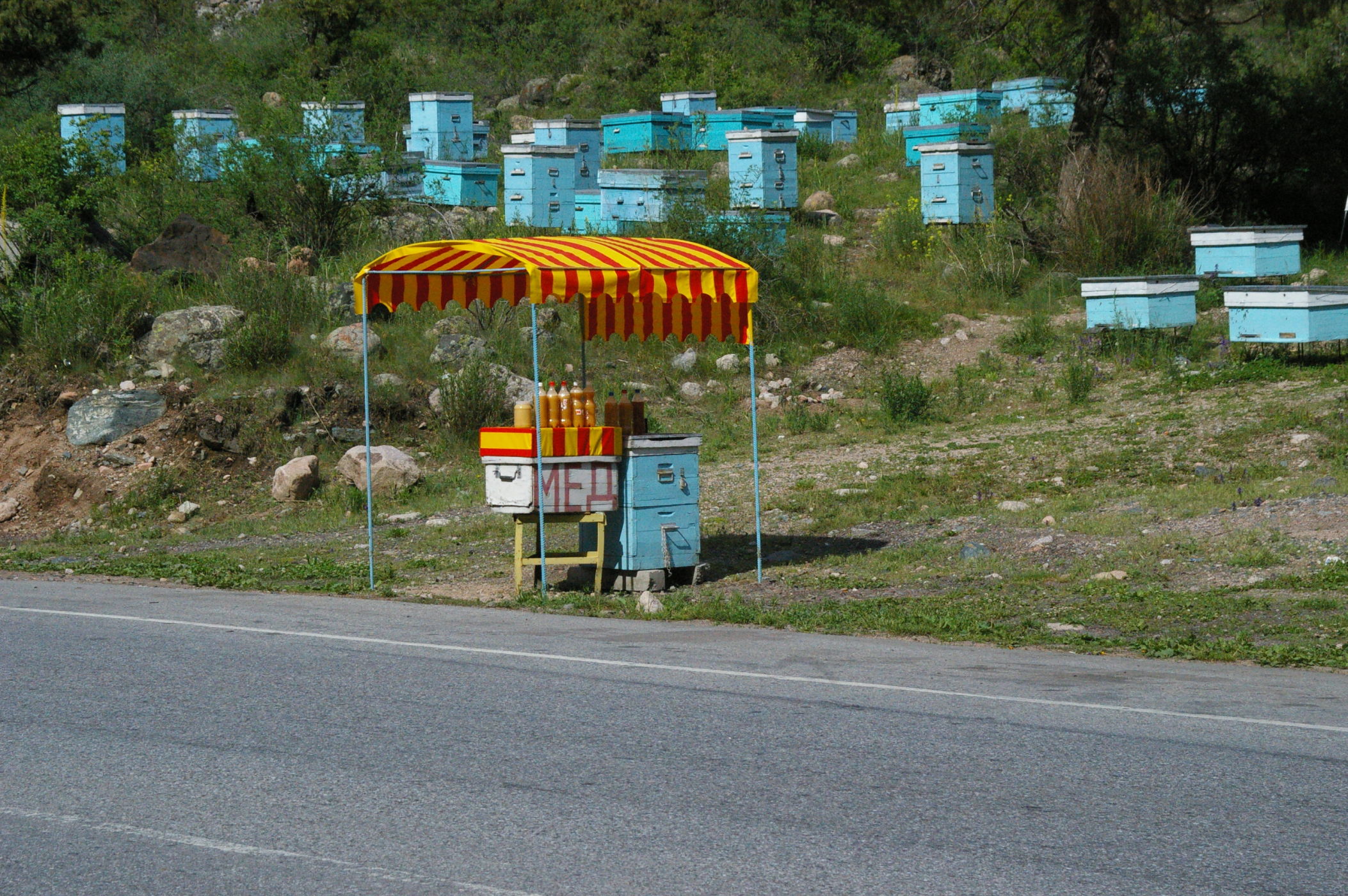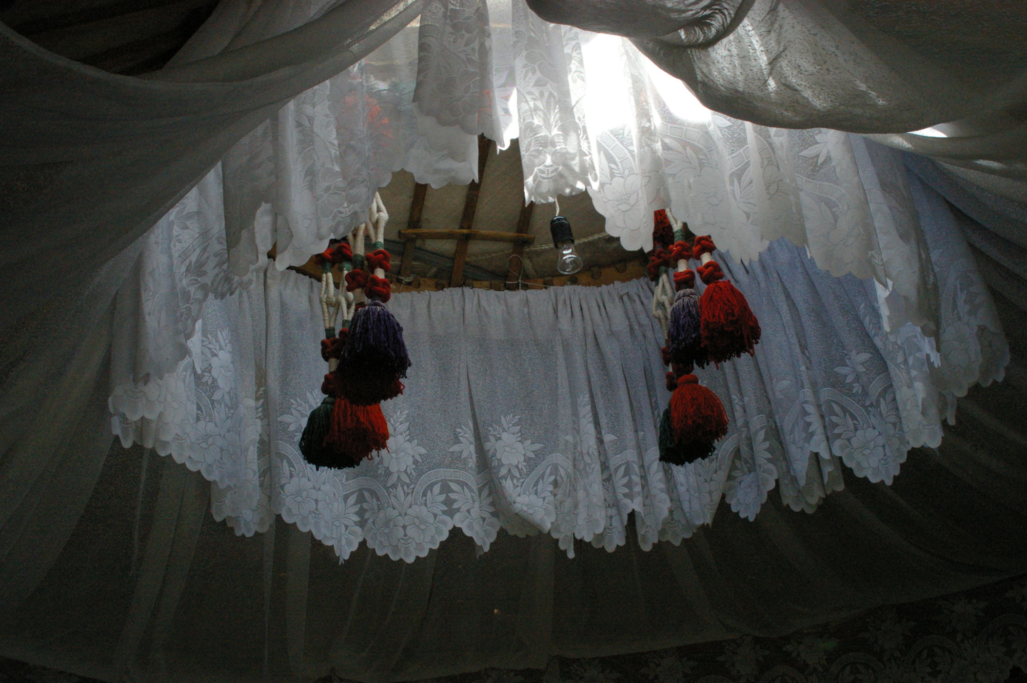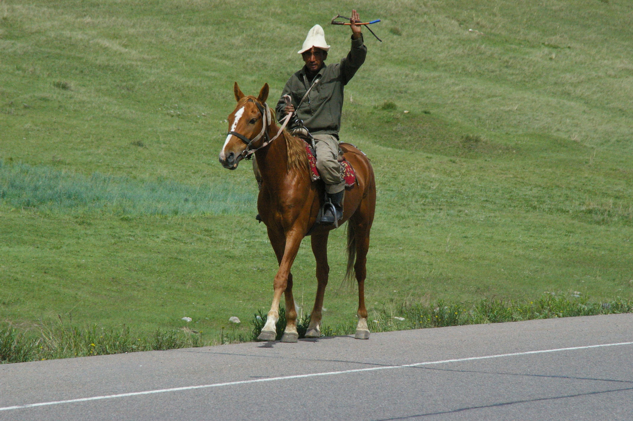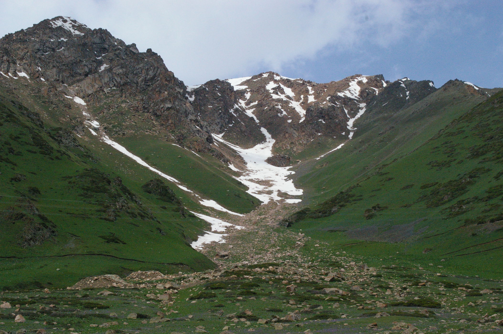 Der Pass auf 3178 m ist ganz anders als der letzte Pass in Tatschikistan. Es führt eine perfekte Strasse mit leichter Steigung den Berg hoch. Keine wilden Schluchten und keine gefährlichen Engpässe, dafür eine grossartige Landschaft. Ausserdem nutzen einige von uns ganz unsportlich langsam fahrende LKW's als Lift. Auf der Passhöhe haben wir unser Picknick umgeben von schneebedeckten Bergen. Die Abfahrt ist eine wirkliches Erlebniss, endlose fast unberührte Landschaft, nur ein paar Zelte und bestes Wetter. Da gibt es viel zu sehen, die Fotos können da nur einen blassen Eindrück vermitteln. Am Abend haben wir wieder einen schönen Zeltplatz, die Stimmung in der Gruppe ist nach diesem schönen Tag bestens.
